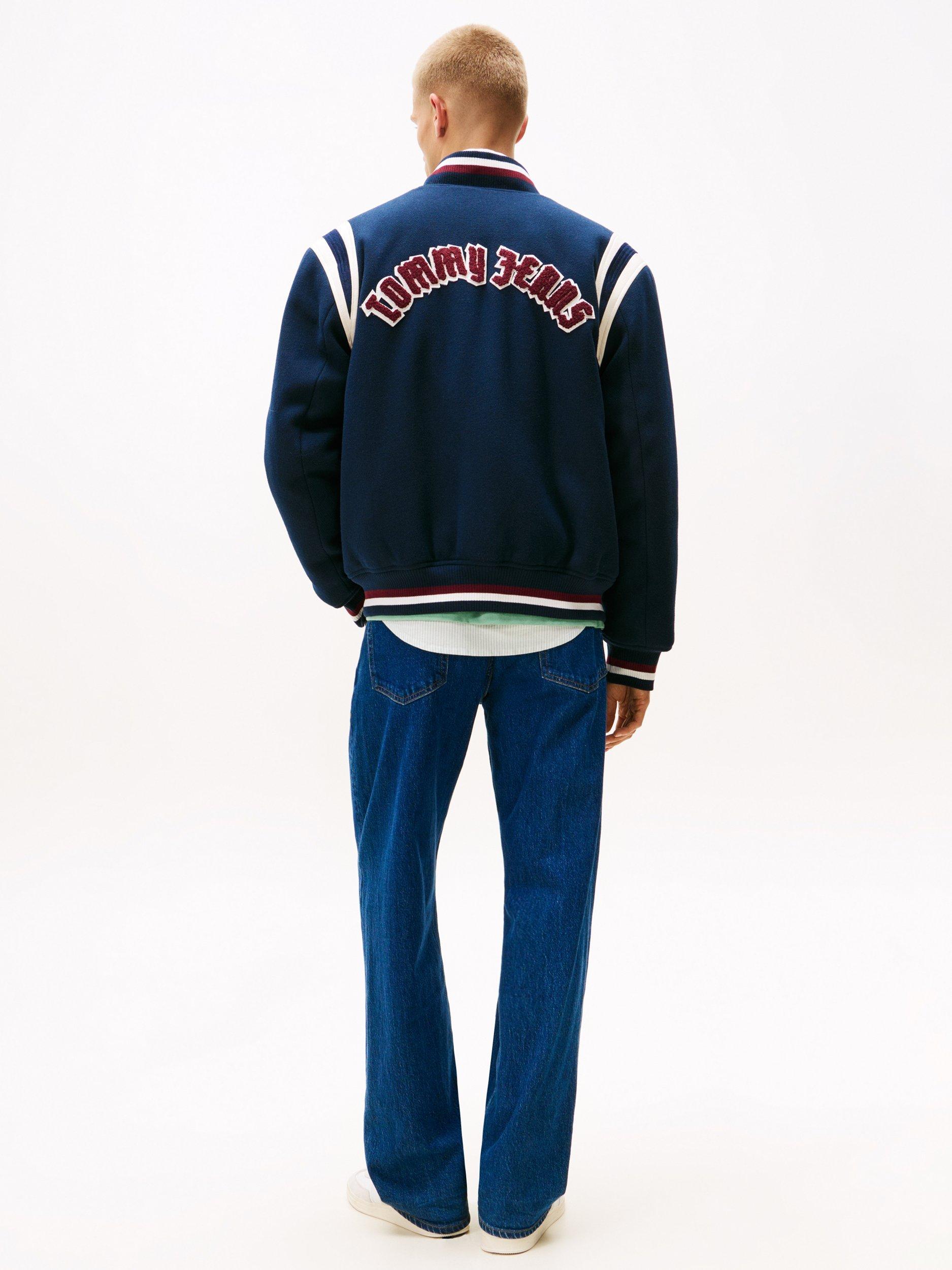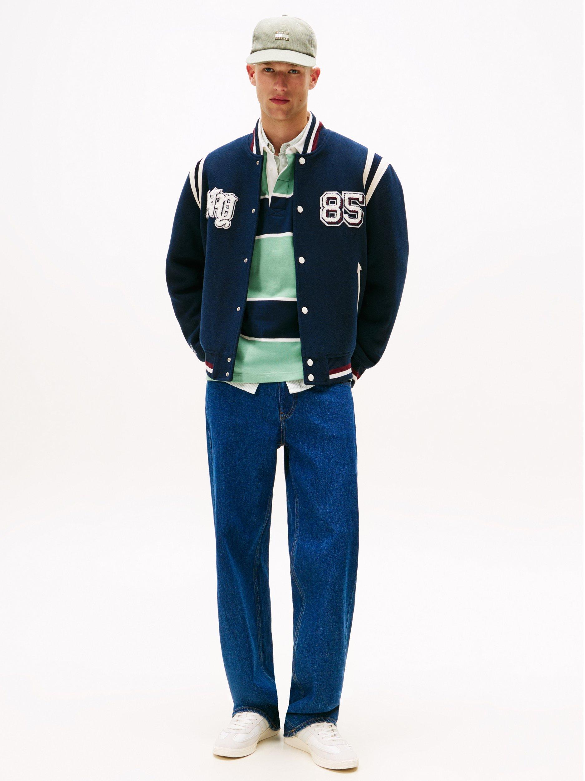This padded bomber jacket with varsity stripe detailing is elevated by appliqué branding and a textured towelling finish.
