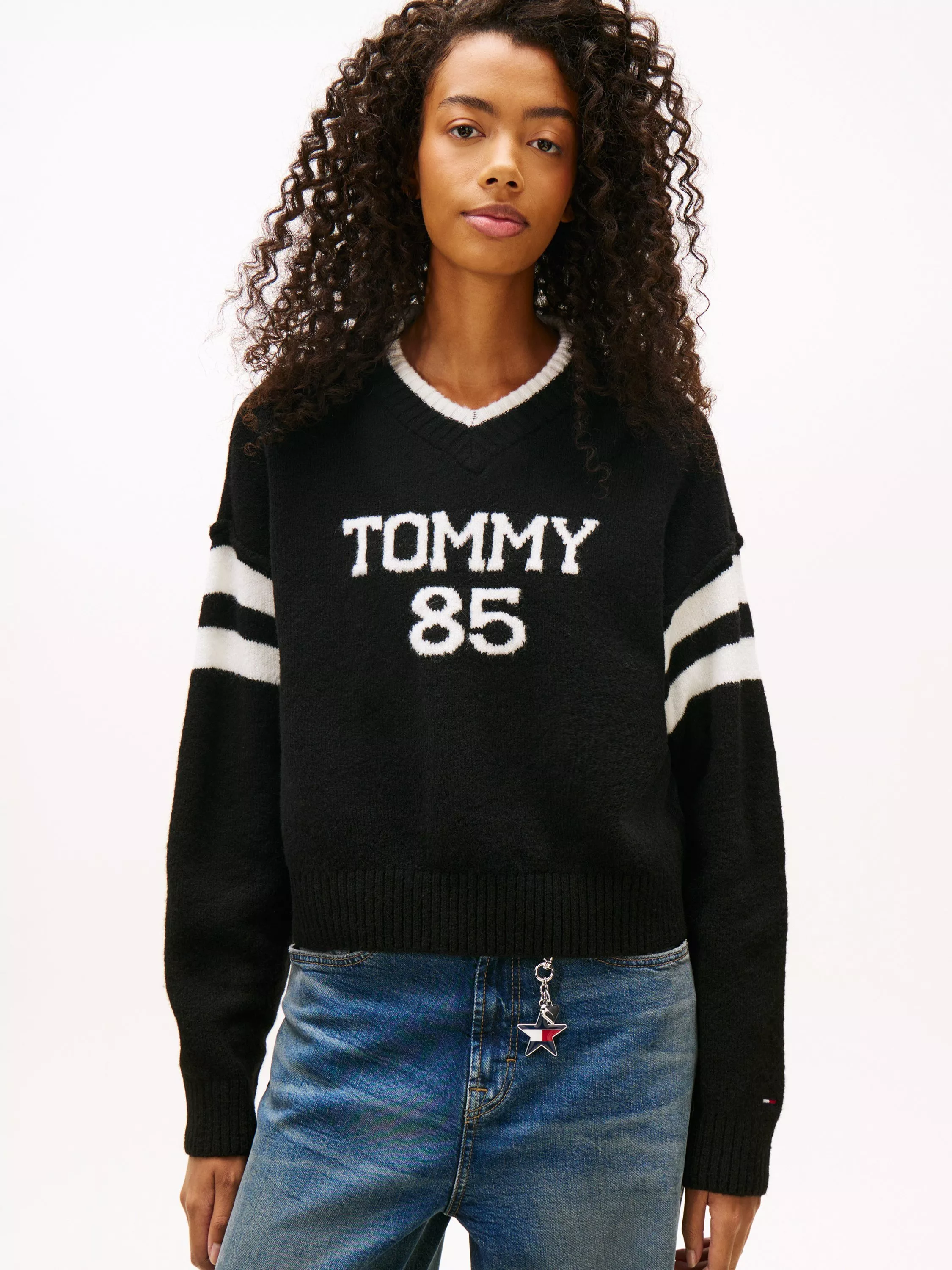 Boldly branded to the front and pepped up by a contrast stripe along the sleeves and v-neckline, this jumper from Tommy Hilfiger comes in a relaxed fit with dropped shoulders and a rib knit collar and cuffs.