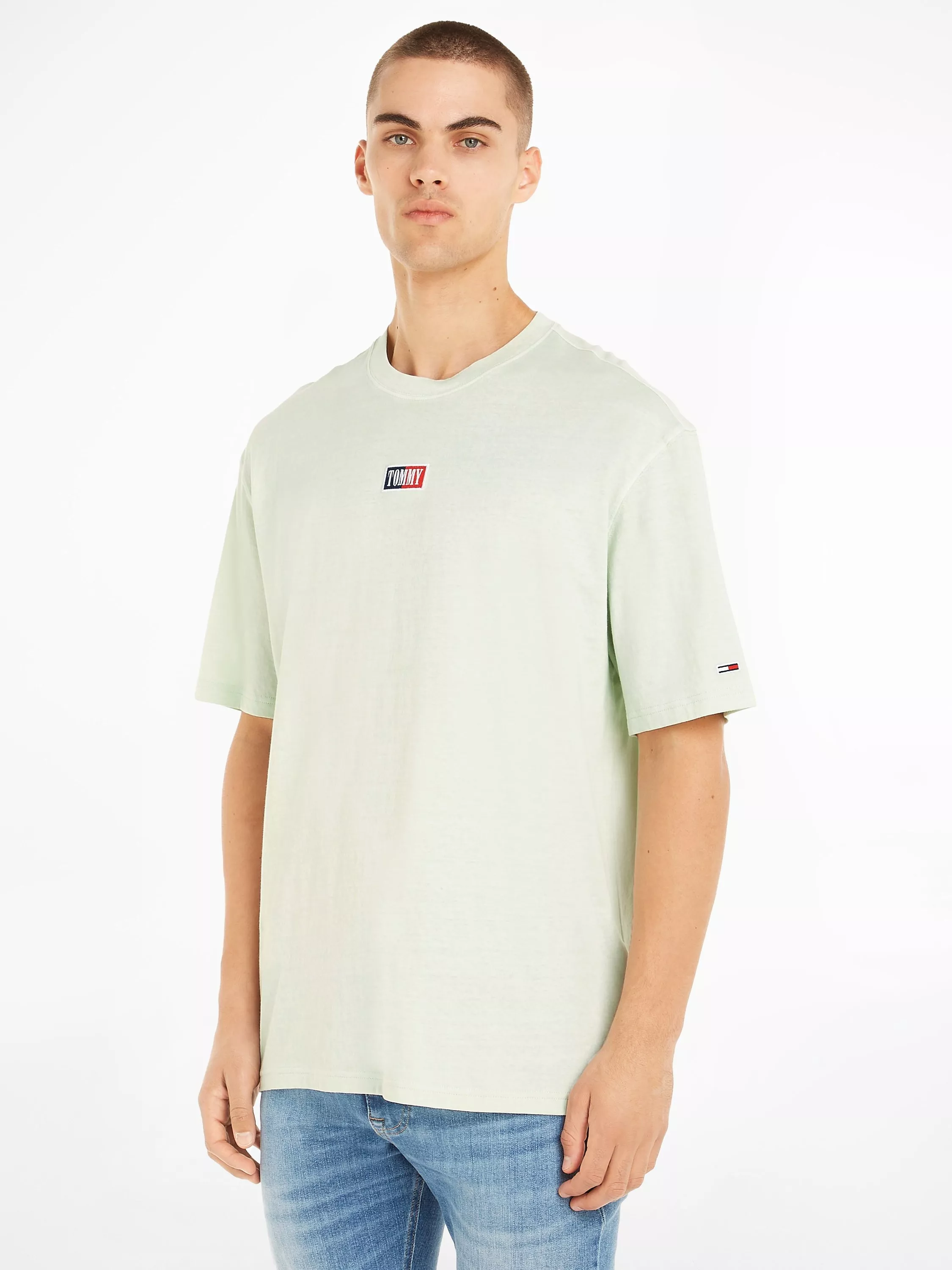 Make a subtle branded statement with this t-shirt from Tommy Jeans, featuring an oversized skater fit and crew neckline. With short sleeves and finished with signature TJ logo badge on the chest. Made from an organic cotton blend.