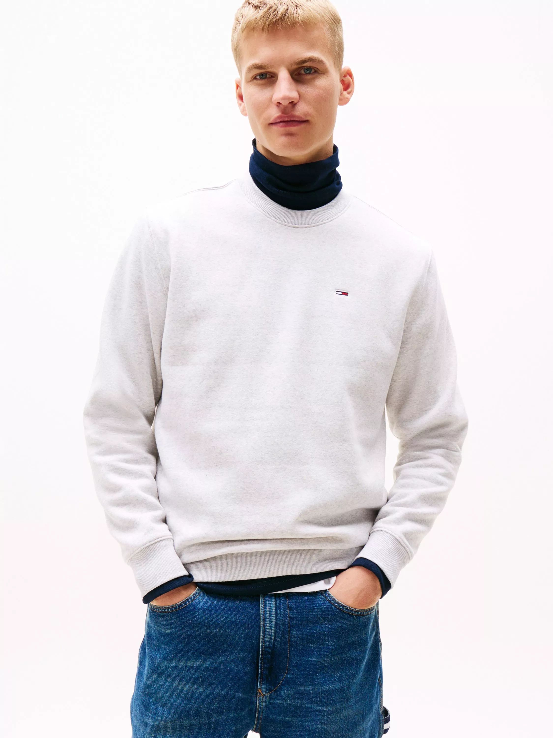 Embrace timeless staples with this crew neck, regular fit sweatshirt from Tommy Jeans. Made from a recycled cotton blend, it features a flag patch and a rib-knit collar, cuff and hems.
