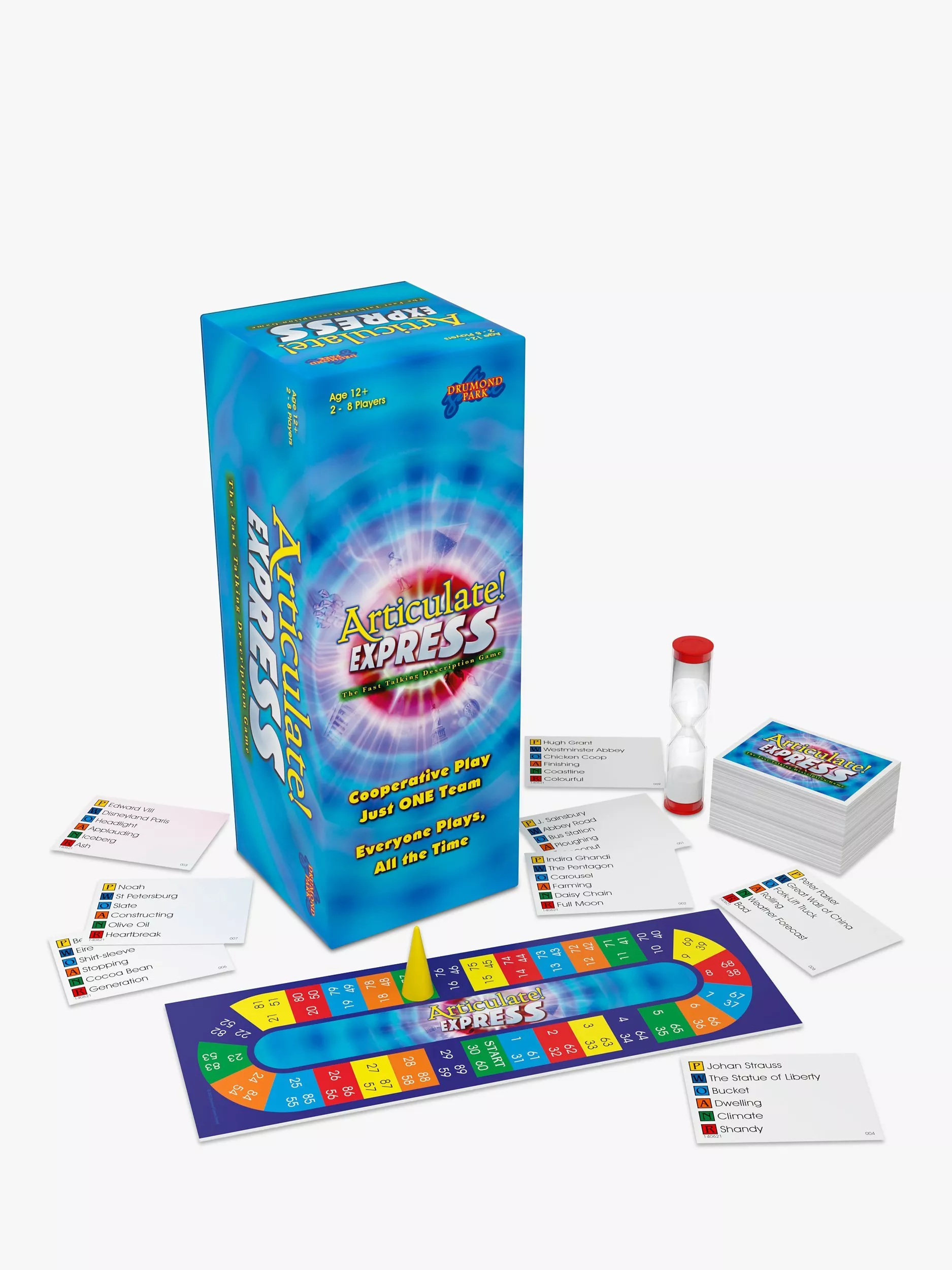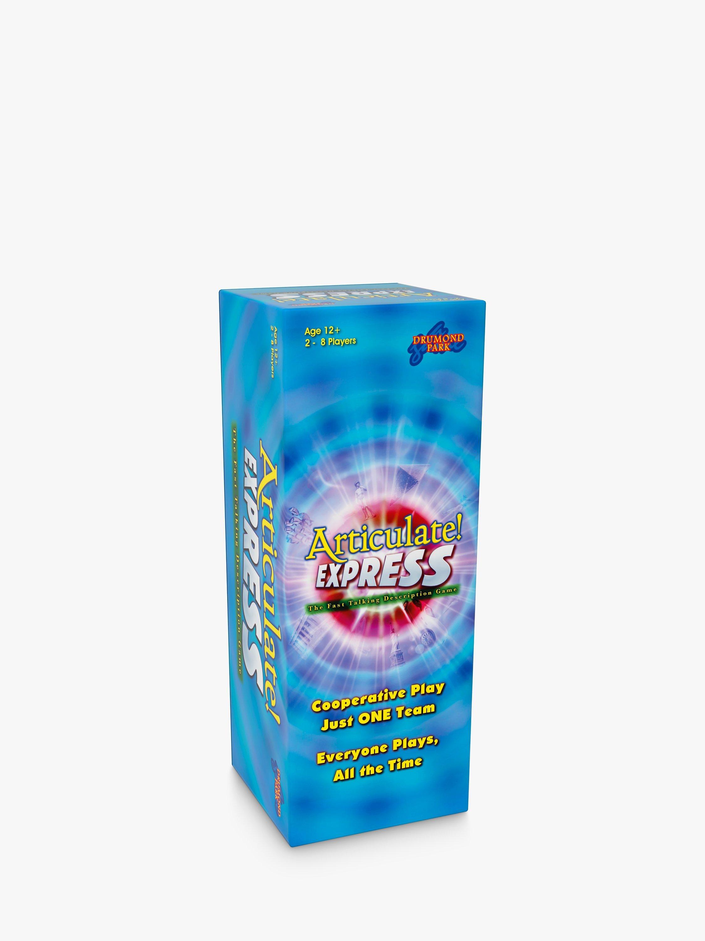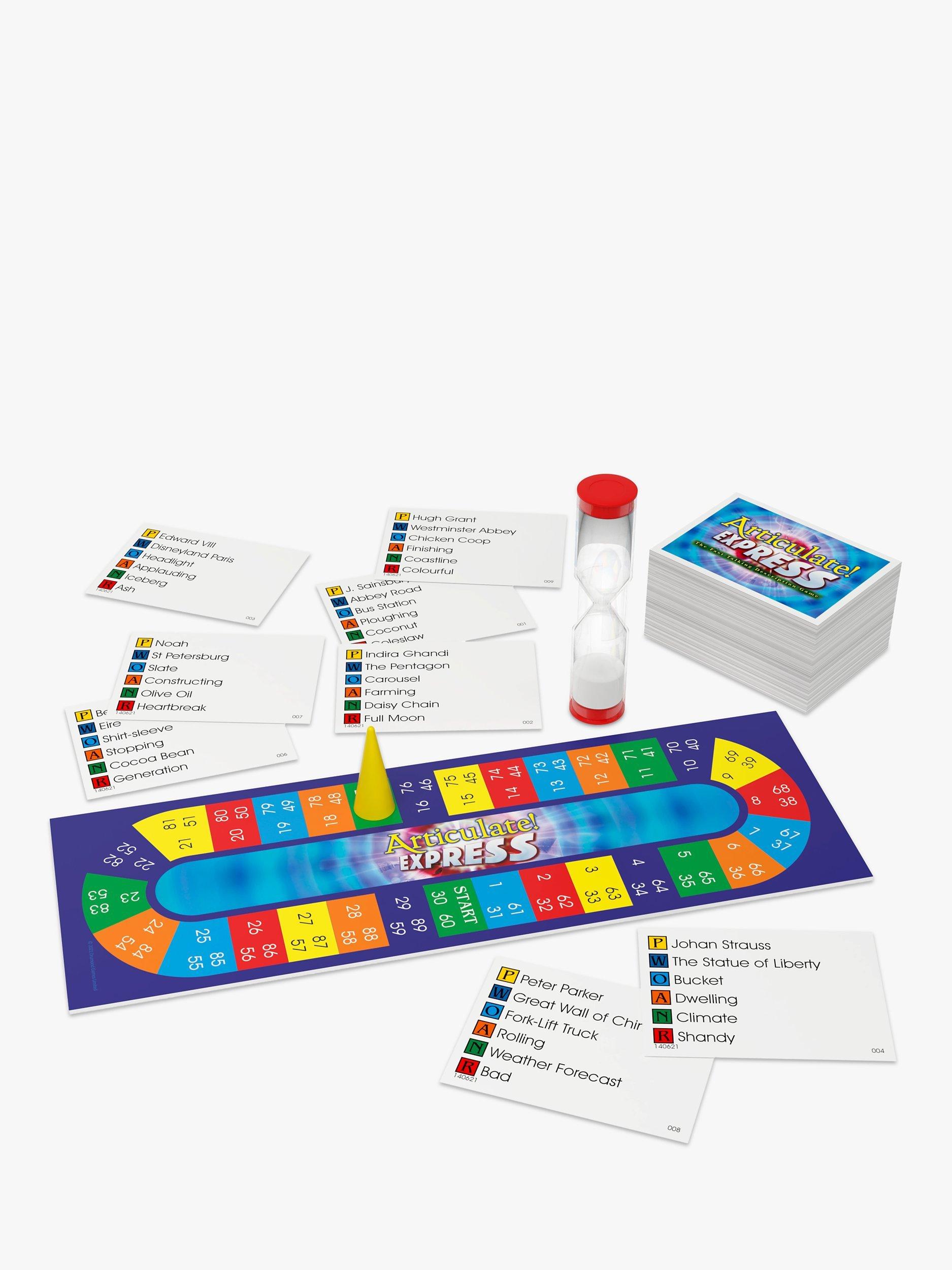 Articulate Express is not your normal board game! Bring everyone together for this quick flash of the UK's family favourite fast-talking description game in which EVERYONE plays - all the time. All players join in a single team. Each round all team members take turns to describe card entries to the others. There are three rounds in which the team must score a progressively higher total of correct Articulate answers. Round one is relatively easy, round two is tricky, and if you get through round three in just one go, you'll need to raise the bar for the next game. The mega team plays three rounds, each aiming for a tougher total than the last. You make the grade or repeat the round.