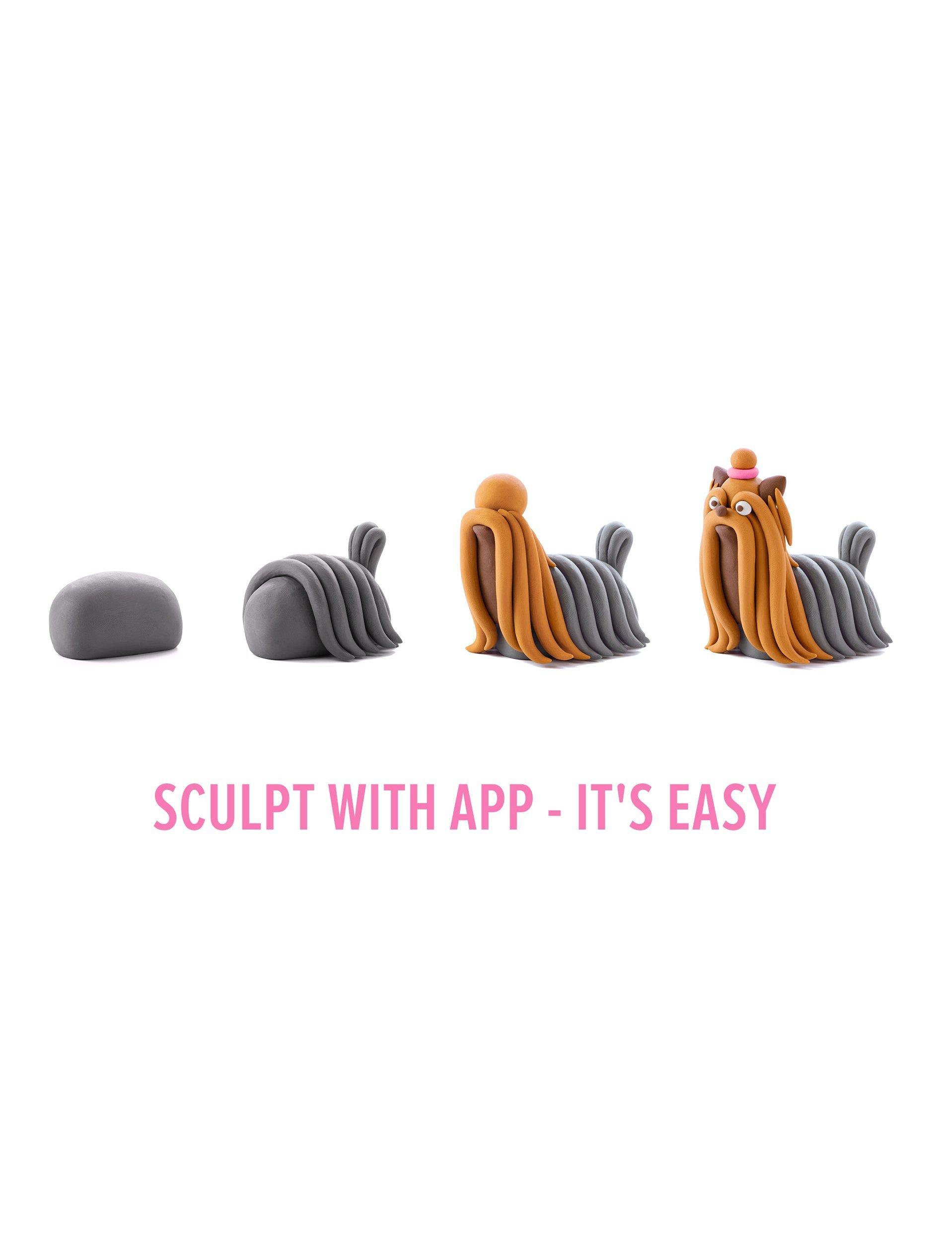 The fun starts once you download the free app and gain full access using the code included in the box. Pick one of the three dogs: the Yorkie, the Bull Terrier or the Shepherd. Then, grab the sculpting tools and follow along with the interactive 3D step-by-step instructions to masterfully mould it, one simple shape at a time.