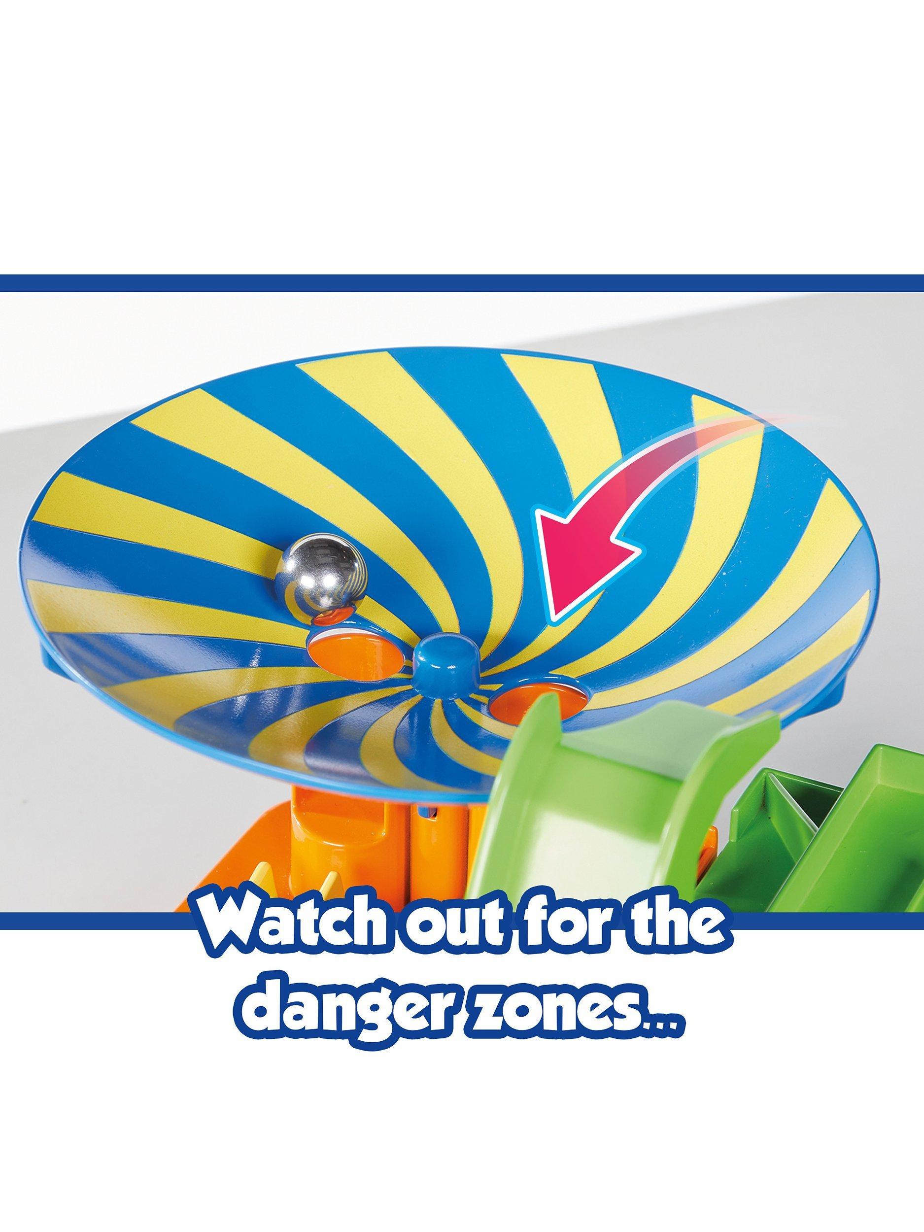 Next up, the See-saw leads to the Ferris Wheel Maze – turn it this way and that to find a way out and on to the Corkscrew. Gently twist the dial to tease the ball along – it’s like walking a tightrope! Other challenges follow – Hop/Step, Pinball, Pot Luck (watch you don’t get sent back), jiggling on the Tipping Maze and a final Catapult blast to the Finish bell!