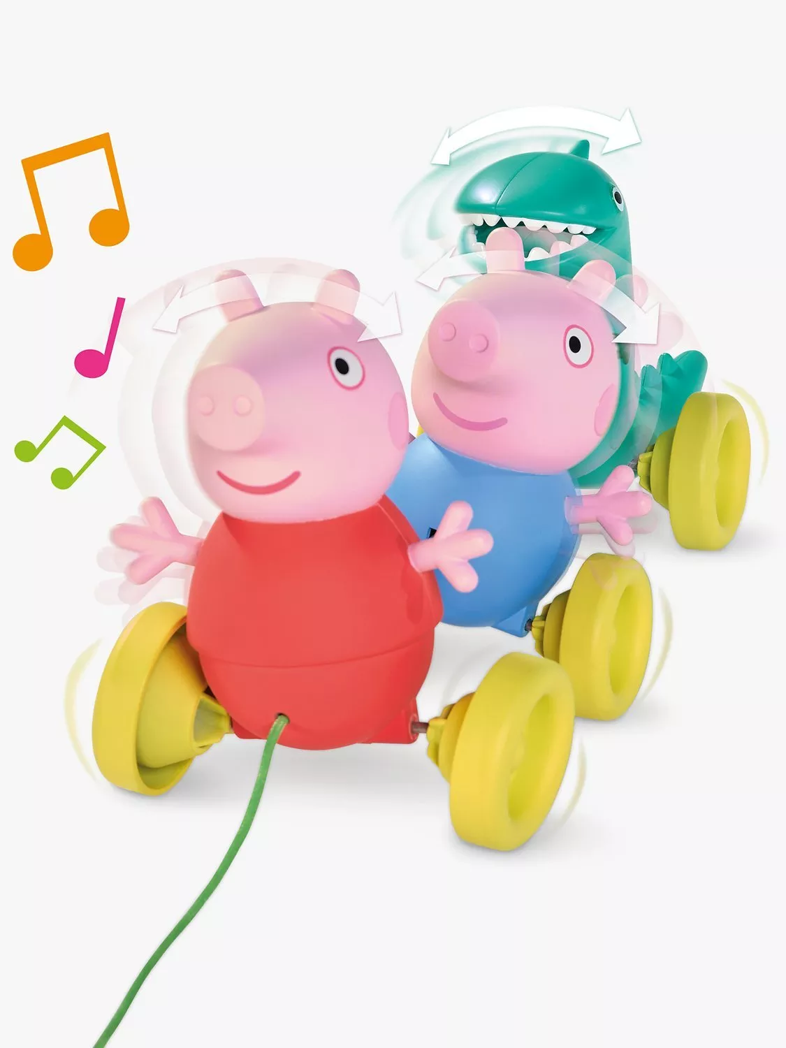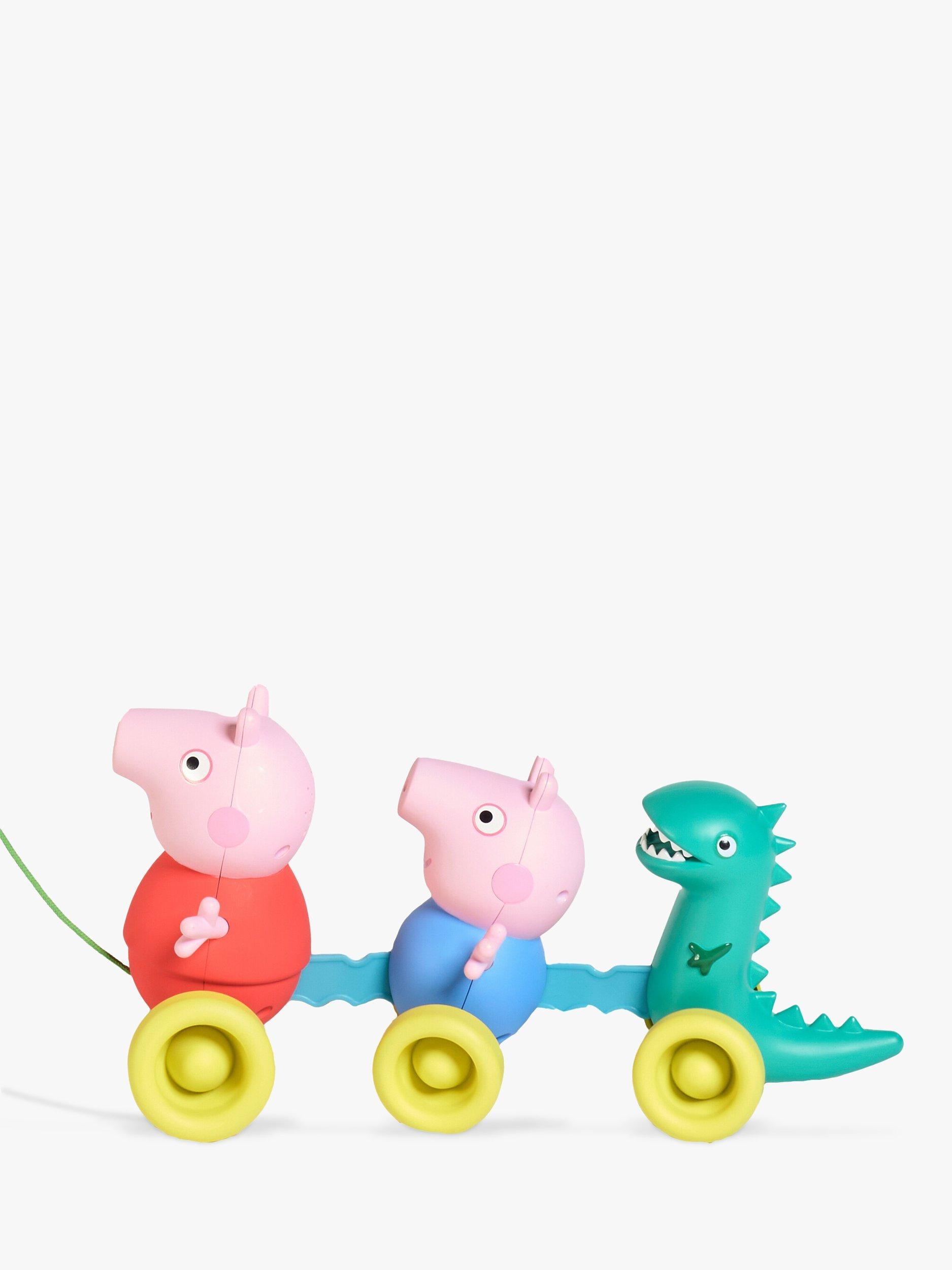 Pull on the string as the wheels turn, you'll hear a happy tune and funny little snorting sounds from Peppa and George. Adding another surprise is the occasional roar coming from that dinosaur on the back!