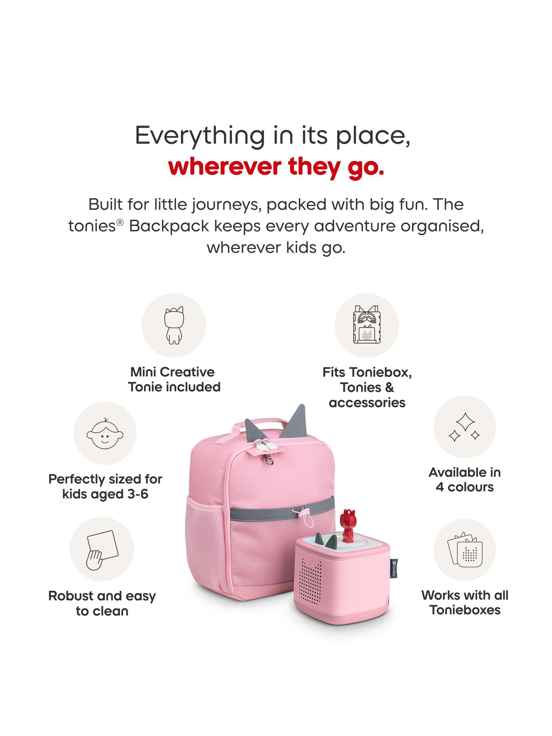 Ready for every little journey, the tonies® Backpack is perfect for preschool days, playdates, weekends away and everything in between. Perfectly sized for children aged three to six, it fits their Toniebox, Tonies, headphones and more. With comfy straps and a kid-friendly design, packing up is easy and fun. The included Mini Creative Tonie lets kids carry a piece of home, from a goodnight message to a favourite song or story. Everything in its place, everywhere they go.