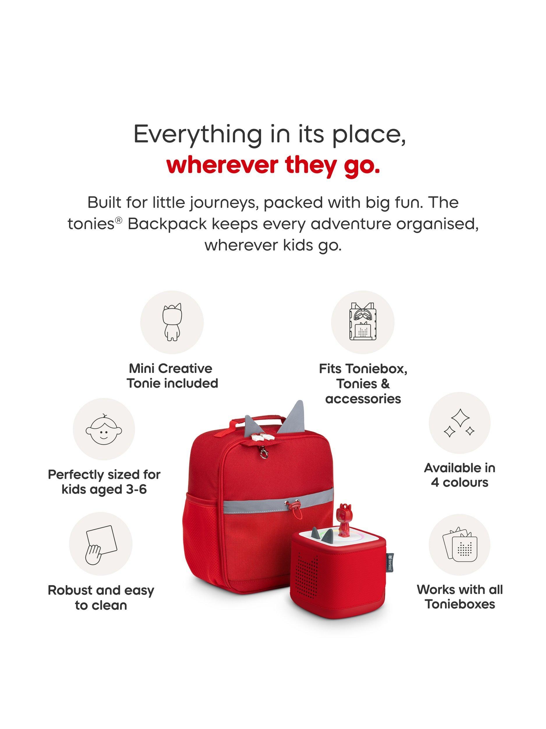 Ready for every little journey, the tonies® Backpack is perfect for preschool days, playdates, weekends away and everything in between. Perfectly sized for children aged three to six, it fits their Toniebox, Tonies, headphones and more. With comfy straps and a kid-friendly design, packing up is easy and fun. The included Mini Creative Tonie lets kids carry a piece of home, from a goodnight message to a favourite song or story. Everything in its place, everywhere they go.