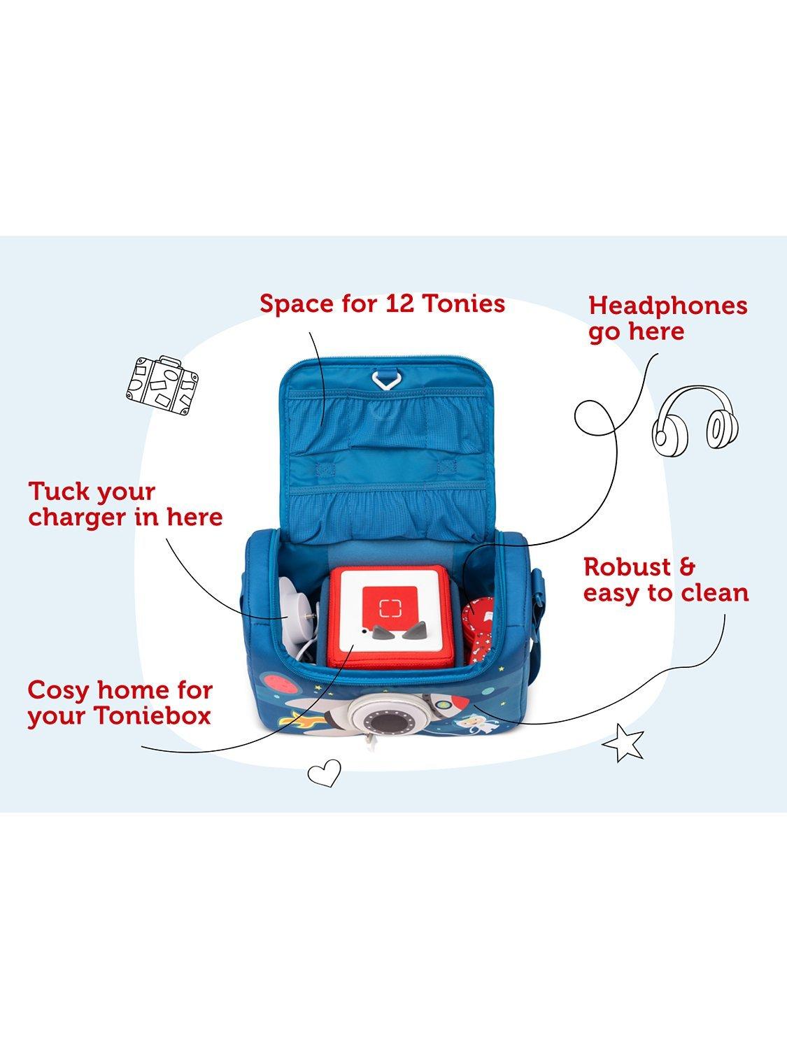 Take your toniebox, tonies, headphones and charging station on all your adventures with a Listen & Play Bag. It keeps everything safe and sound and there's even a flap so you can open up the speaker and listen on the go.