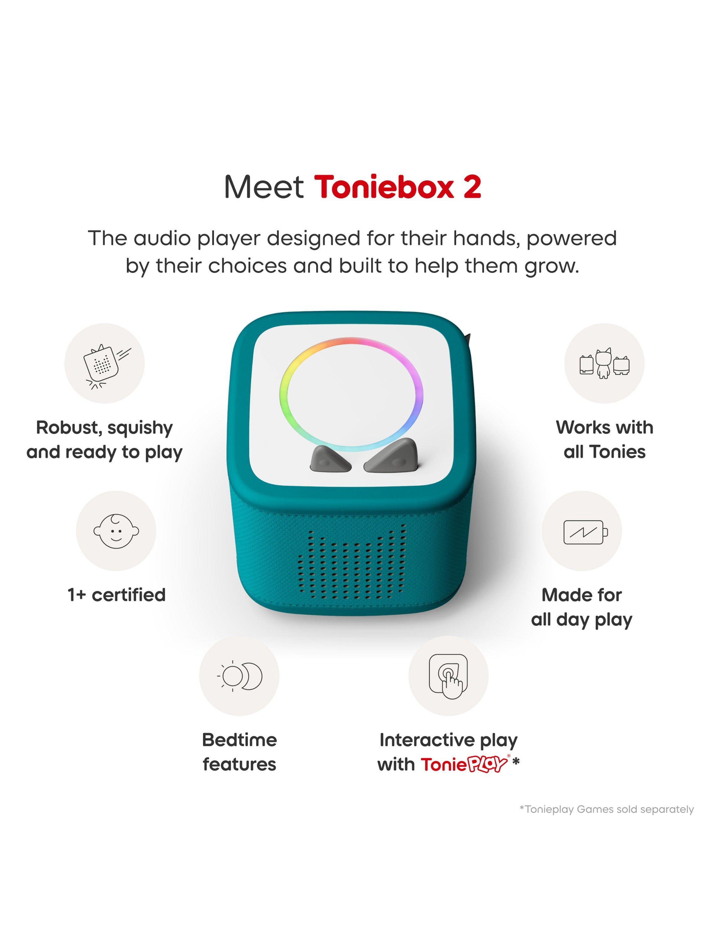 Toniebox 2 is the kid-powered audio player with no screens and no ads. Kids can explore favourite stories and songs with an ever-growing crew of Tonie characters. Just pop one on the Toniebox and go! Or, unlock interactive games, quizzes and challenges where kids take the lead with Tonieplay. New bedtime features help build better sleep habits.