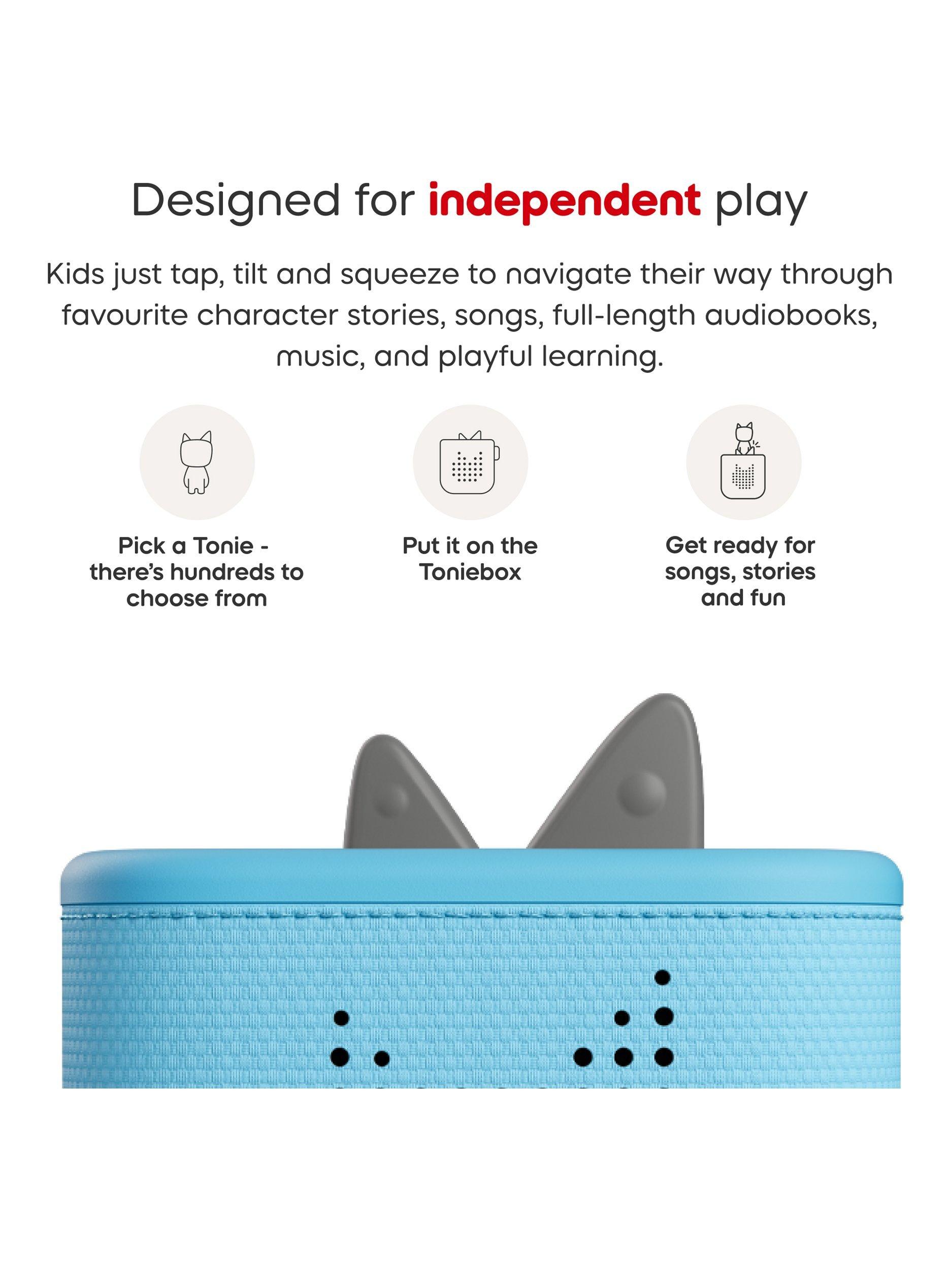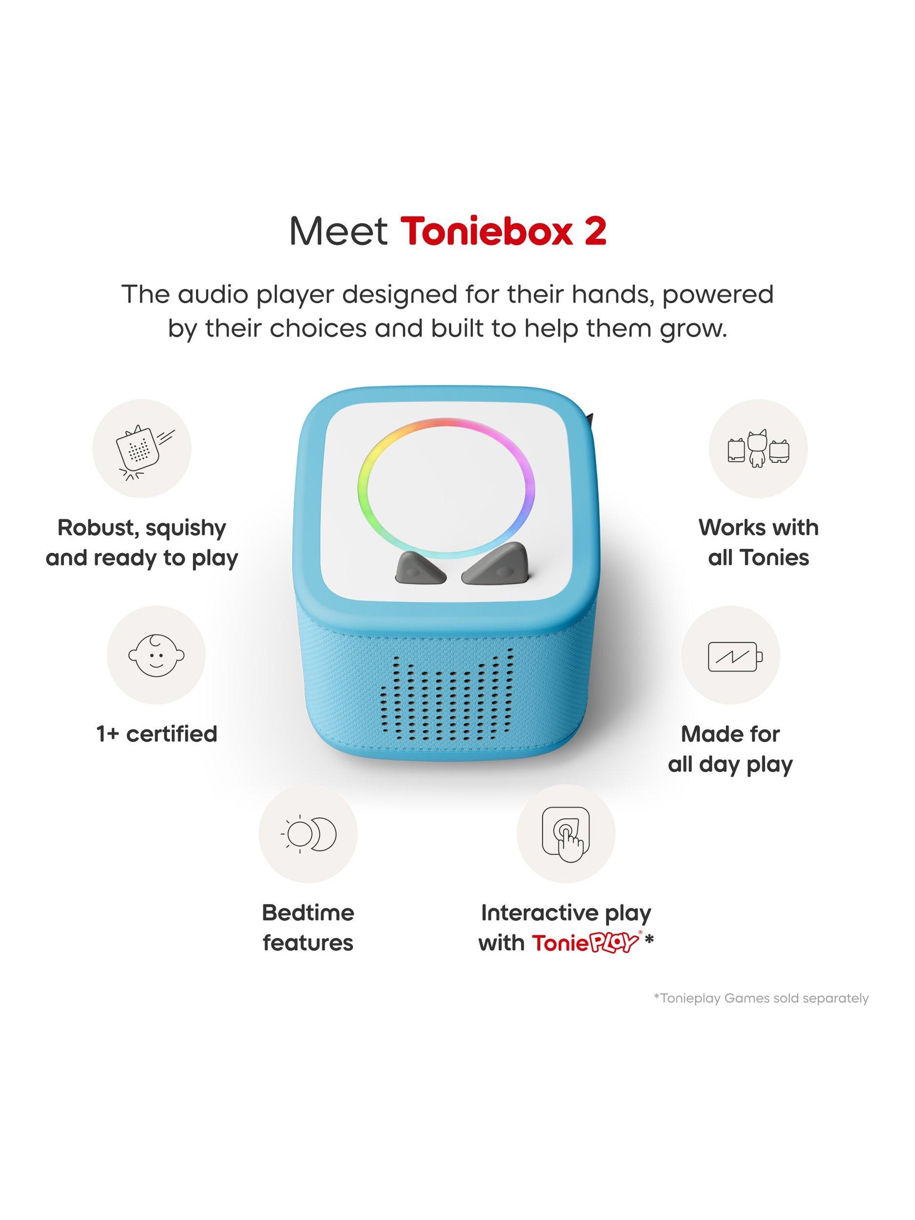 Meet Toniebox 2, the kid-powered audio player with screen-free stories, songs, games and more. Great for ages one to nine and over, this audio player is designed for their hands, powered by their choices and built to help them grow. Get ready to listen, play and grow in a whole new way.