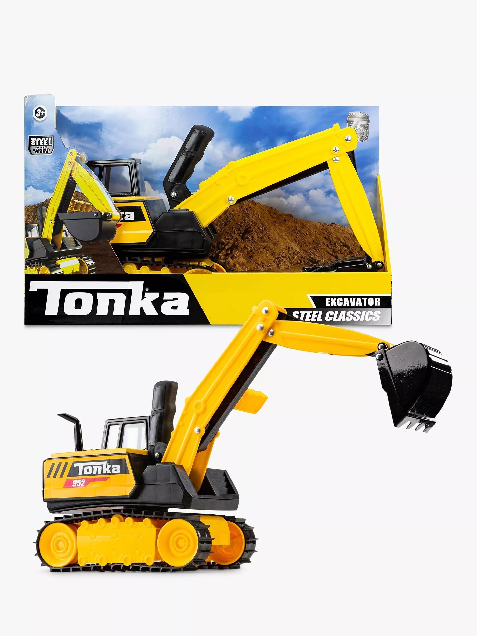 Get ready to dig the mightiest of holes and trenches with the 75th anniversary Tonka Steel Classics Excavator! Made of cold-rolled steel, this excavator toy is TONKA TOUGH and powerful enough to tackle any job! Colourful and thoughtfully designed with realistic details, you’ll feel like you’re playing with a real-life excavator! Get ready to dominate the jobsite with your excavator today!