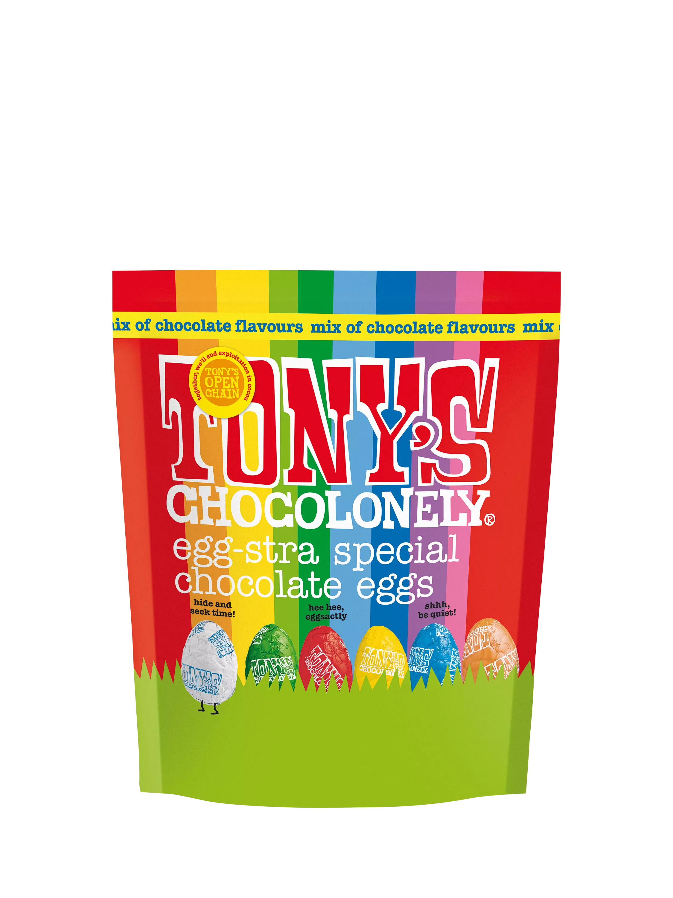The hunt is over – this pouch is packed with Tony’s Easter chocolate eggs for baskets, egg hunts.. or just treating yourself.