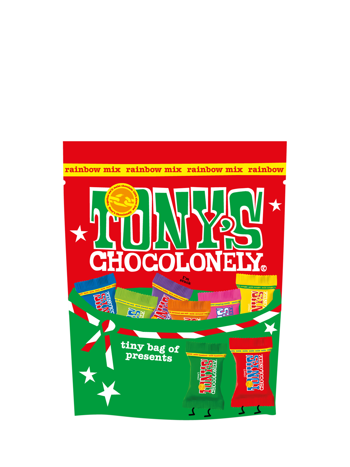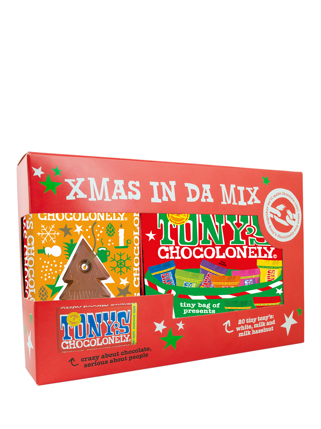 Make Christmas the most wonderful time of the year with this special pack, including: Tiny Tony's Christmas Mix pouch, Tony's gingerbread flavoured milk chocolate bar - break out the Tony's tree and hang it on your own tree, along with Tony's milk hazelnut chocolate bar and Tony's classic milk chocolate bar.