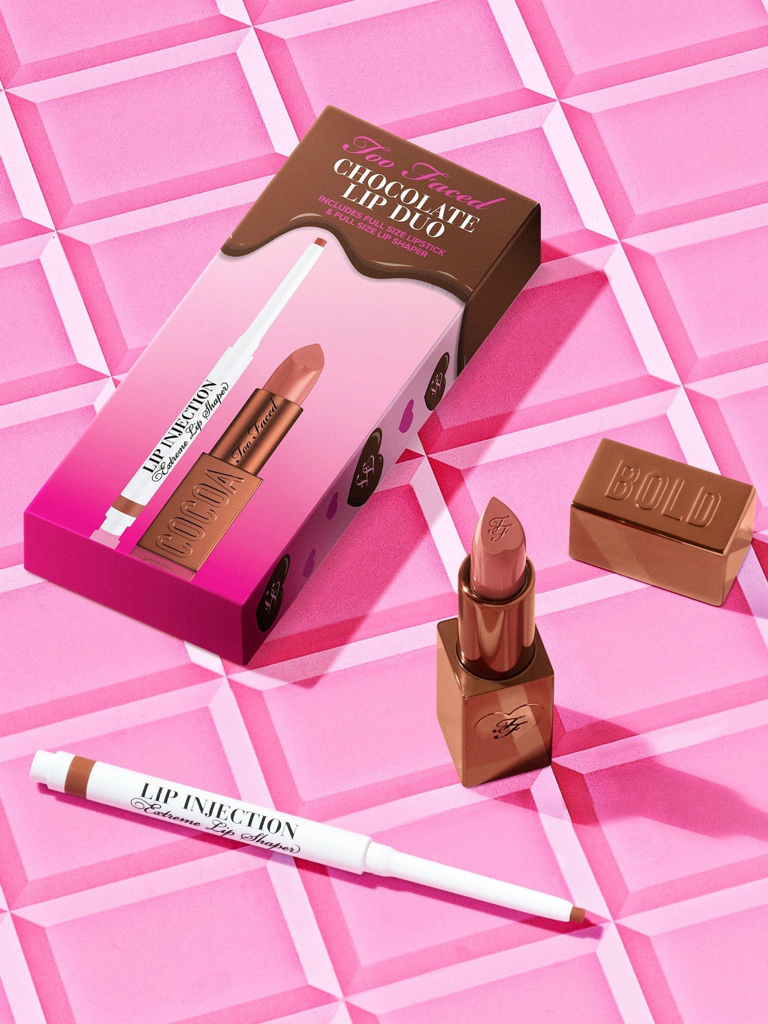 Indulge like never before with our ultra-decadent, chocolate-scented creamy lipstick paired with a lip injection lip shaper for the ultimate plump. Pucker up!