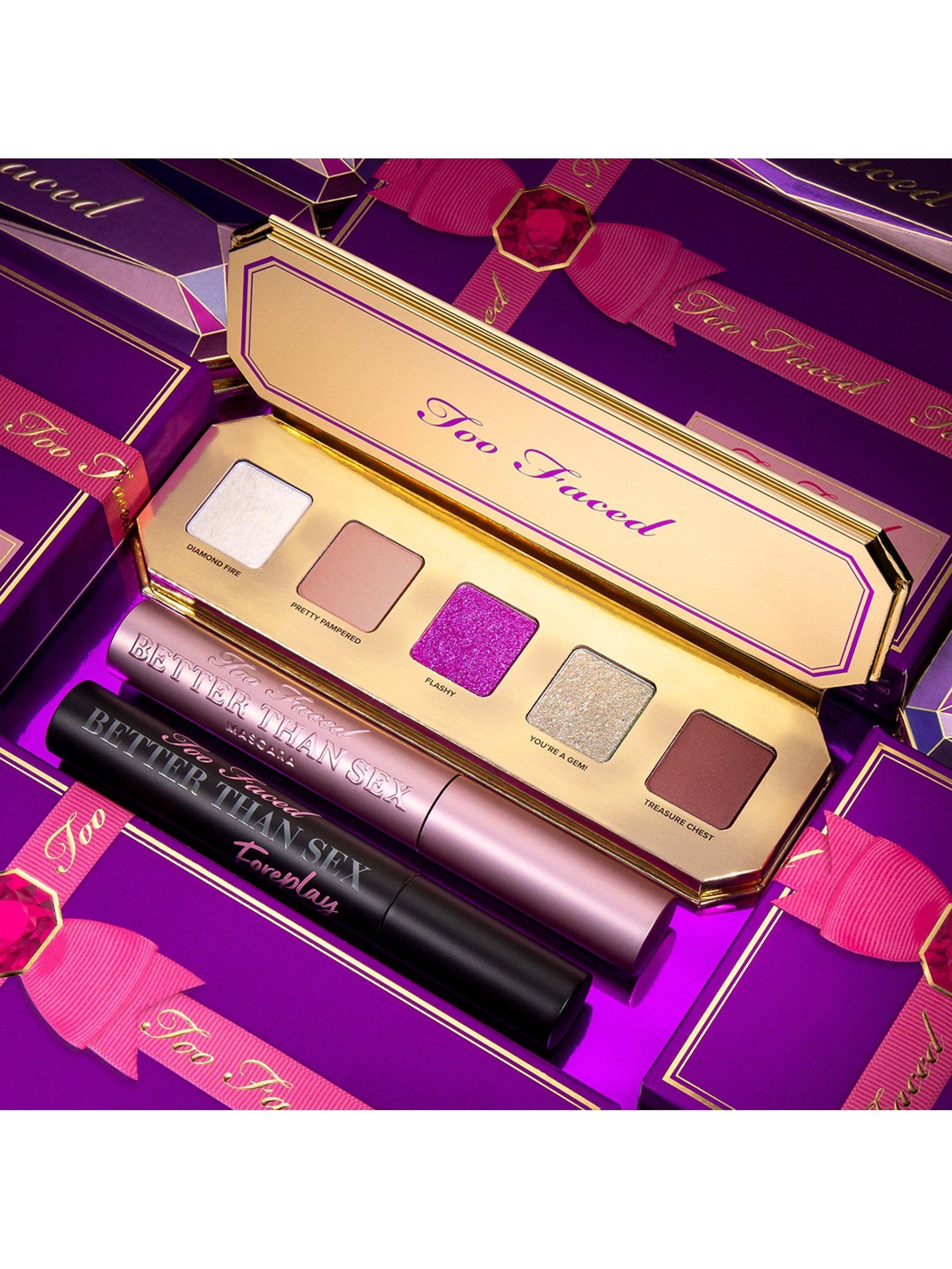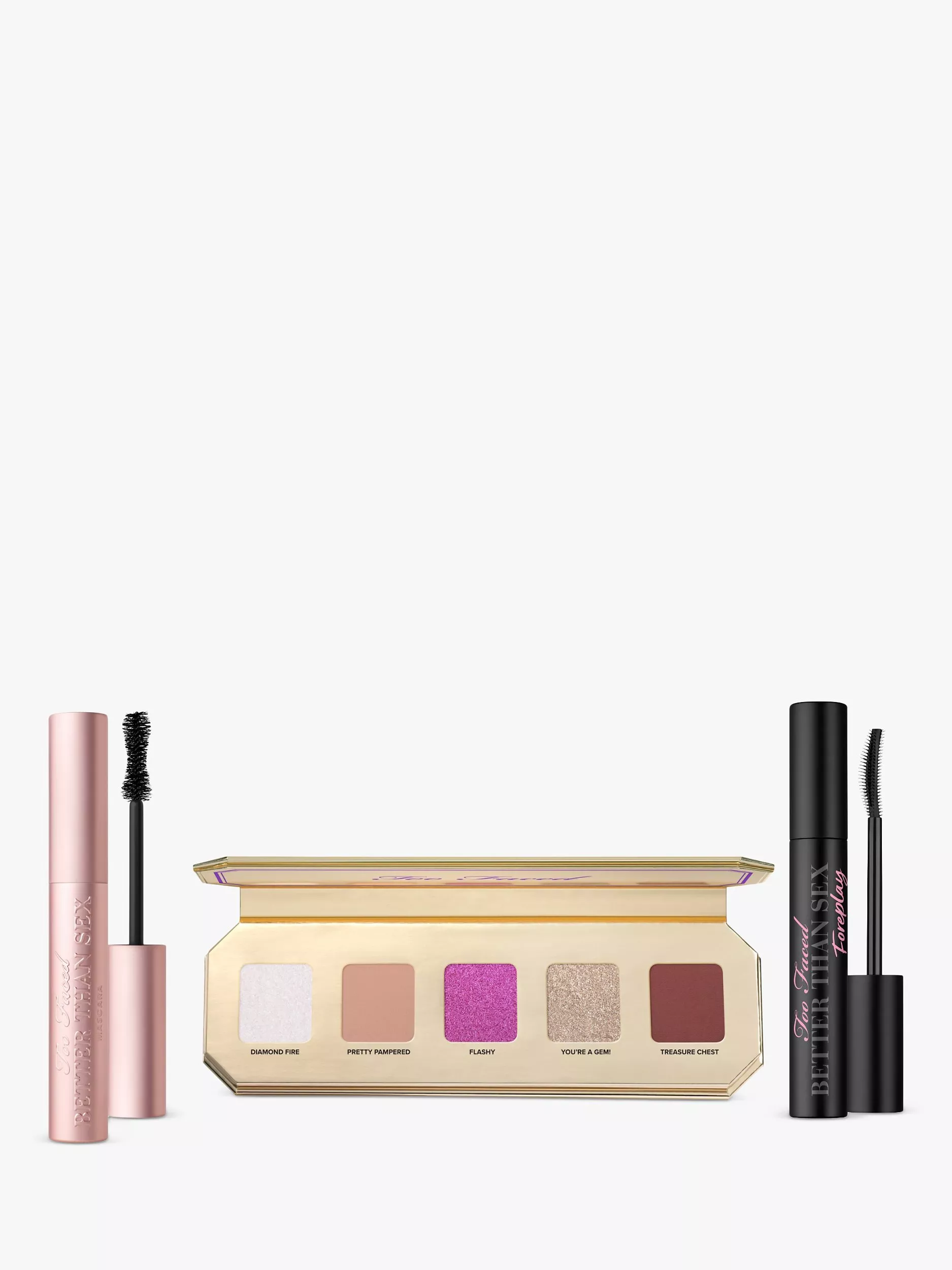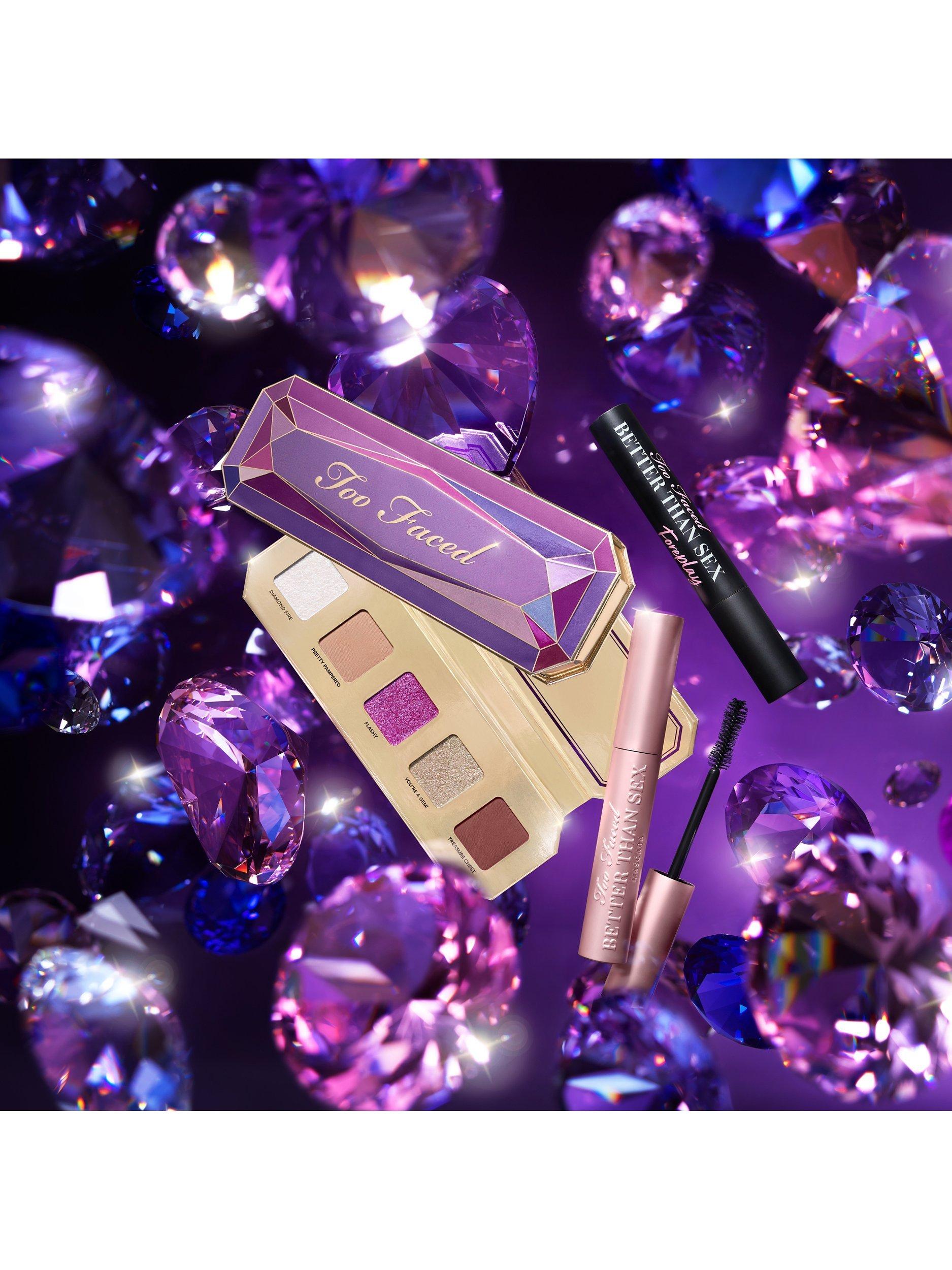 - Better Than Sex Mascara: Water\Aqua\Eau, Synthetic Beeswax, Paraffin, Glyceryl Stearate, Acacia Senegal Gum, Butylene Glycol, Oryza Sativa (Rice) Bran Wax, Stearic Acid, Palmitic Acid, Polybutene, VP/Eicosene Copolymer, Copernicia Cerifera (Carnauba) Wax\ Copernicia Cerifera Cera \Cire De Carnauba, Aminomethyl Propanol, Glycerin, PVP, Ethylhexylglycerin, Hydroxyethylcellulose, Disodium EDTA, Polyester-11, Cellulose, Trimethylpentanediol/Adipic Acid/Glycerin Crosspolymer, Propylene Glycol, Disodium Phosphate, Polysorbate 60, Acacia Seyal Gum Extract, Sodium Phosphate, Acetyl Hexapeptide-1, Dextran, Phenoxyethanol, Potassium Sorbate, Iron Oxides (CI 77499), Ultramarines (CI 77007), Black 2 (CI 77266)Better Than Sex Foreplay: Isododecane, Trimethylsiloxysilicate, Beeswax/Cera Alba/Cire D'abeille, Paraffin, Microcrystalline Wax/Cera Microcristallina/Cire Microcristalline, Dimethicone, Disteardimonium Hectorite, Dextrin Palmitate/Ethylhexanoate, Tocopherol, Vitis Vinifera (Grape) Seed Oil, Argania Spinosa Kernel Oil, Propylene Carbonate, Silica, Nylon-6, Iron Oxides (Ci 77499).You're a Gem eyeshadow Palette: Treasure Chest: MICA [] SILICA [] SYNTHETIC FLUORPHLOGOPITE [] SYNTHETIC WAX [] MAGNESIUM MYRISTATE [] DIMETHICONE [] TRIETHOXYCAPRYLYLSILANE [] OCTYLDODECYL STEAROYL STEARATE [] HYDROGENATED POLYISOBUTENE [] TOCOPHERYL ACETATE [] TOCOPHEROL [] CAPRYLYL GLYCOL [] ETHYLHEXYLGLYCERIN [] KAOLIN [] TRIMETHYLSILOXYSILICATE [] FRAGRANCE (PARFUM) [] BENZYL ALCOHOL [] ANISE ALCOHOL [] PHENOXYETHANOL [] IRON OXIDES (CI 77491) [] IRON OXIDES (CI 77499) [] CARMINE (CI 75470) [] ULTRAMARINES (CI 77007) [] IRON OXIDES (CI 77492) <lt/>ILN52880<gt/>Pretty Pampered: MICA [] SYNTHETIC FLUORPHLOGOPITE [] SILICA [] SYNTHETIC WAX [] MAGNESIUM MYRISTATE [] DIMETHICONE [] HYDROGENATED POLYISOBUTENE [] OCTYLDODECYL STEAROYL STEARATE [] TRIETHOXYCAPRYLYLSILANE [] TOCOPHEROL [] TOCOPHERYL ACETATE [] CAPRYLYL GLYCOL [] ETHYLHEXYLGLYCERIN [] KAOLIN [] ALUMINUM HYDROXIDE [] TRIMETHYLSILOXYSILICATE [] FRAGRANCE (PARFUM) [] BENZYL ALCOHOL [] ANISE ALCOHOL [] PHENOXYETHANOL [] TITANIUM DIOXIDE (CI 77891) [] IRON OXIDES (CI 77491) [] IRON OXIDES (CI 77492) [] IRON OXIDES (CI 77499) [] ULTRAMARINES (CI 77007) <lt/>ILN52879<gt/>Flashy: SYNTHETIC FLUORPHLOGOPITE [] DIMETHICONE [] ETHYLHEXYL PALMITATE [] ISODODECANE [] SILICA [] DIMETHICONE/VINYL DIMETHICONE CROSSPOLYMER [] TIN OXIDE [] TOCOPHERYL ACETATE [] CAPRYLYL GLYCOL [] ETHYLHEXYLGLYCERIN [] MAGNESIUM MYRISTATE [] KAOLIN [] FRAGRANCE (PARFUM) [] BENZYL ALCOHOL [] ANISE ALCOHOL [] PHENOXYETHANOL [] TITANIUM DIOXIDE (CI 77891) [] IRON OXIDES (CI 77491) [] ULTRAMARINES (CI 77007) [] CARMINE (CI 75470) <lt/>ILN52882<gt/>Diamond Fire: CALCIUM SODIUM BOROSILICATE [] ISONONYL ISONONANOATE [] SYNTHETIC FLUORPHLOGOPITE [] TRIETHYLHEXANOIN [] SYNTHETIC WAX [] CAPRYLIC/CAPRIC TRIGLYCERIDE [] MAGNESIUM MYRISTATE [] MAGNESIUM STEARATE [] SILICA [] TOCOPHERYL ACETATE [] STEARALKONIUM HECTORITE [] CAPRYLYL GLYCOL [] ETHYLHEXYLGLYCERIN [] TRIETHOXYCAPRYLYLSILANE [] TIN OXIDE [] MICA [] PROPYLENE CARBONATE [] BORON NITRIDE [] FRAGRANCE (PARFUM) [] BENZYL ALCOHOL [] ANISE ALCOHOL [] PHENOXYETHANOL [] TITANIUM DIOXIDE (CI 77891) <lt/>ILN52881<gt/>You’re A Gem: ISONONYL ISONONANOATE [] SYNTHETIC FLUORPHLOGOPITE [] CALCIUM ALUMINUM BOROSILICATE [] TRIETHYLHEXANOIN [] SYNTHETIC WAX [] MAGNESIUM MYRISTATE [] CAPRYLIC/CAPRIC TRIGLYCERIDE [] MICA [] TOCOPHERYL ACETATE [] STEARALKONIUM HECTORITE [] CAPRYLYL GLYCOL [] ETHYLHEXYLGLYCERIN [] TRIETHOXYCAPRYLYLSILANE [] PROPYLENE CARBONATE [] MAGNESIUM STEARATE [] BORON NITRIDE [] SILICA [] TIN OXIDE [] FRAGRANCE (PARFUM) [] BENZYL ALCOHOL [] ANISE ALCOHOL [] PHENOXYETHANOL [] TITANIUM DIOXIDE (CI 77891) [] IRON OXIDES (CI 77491) [] IRON OXIDES (CI 77499) <lt/>ILN52883<gt/>