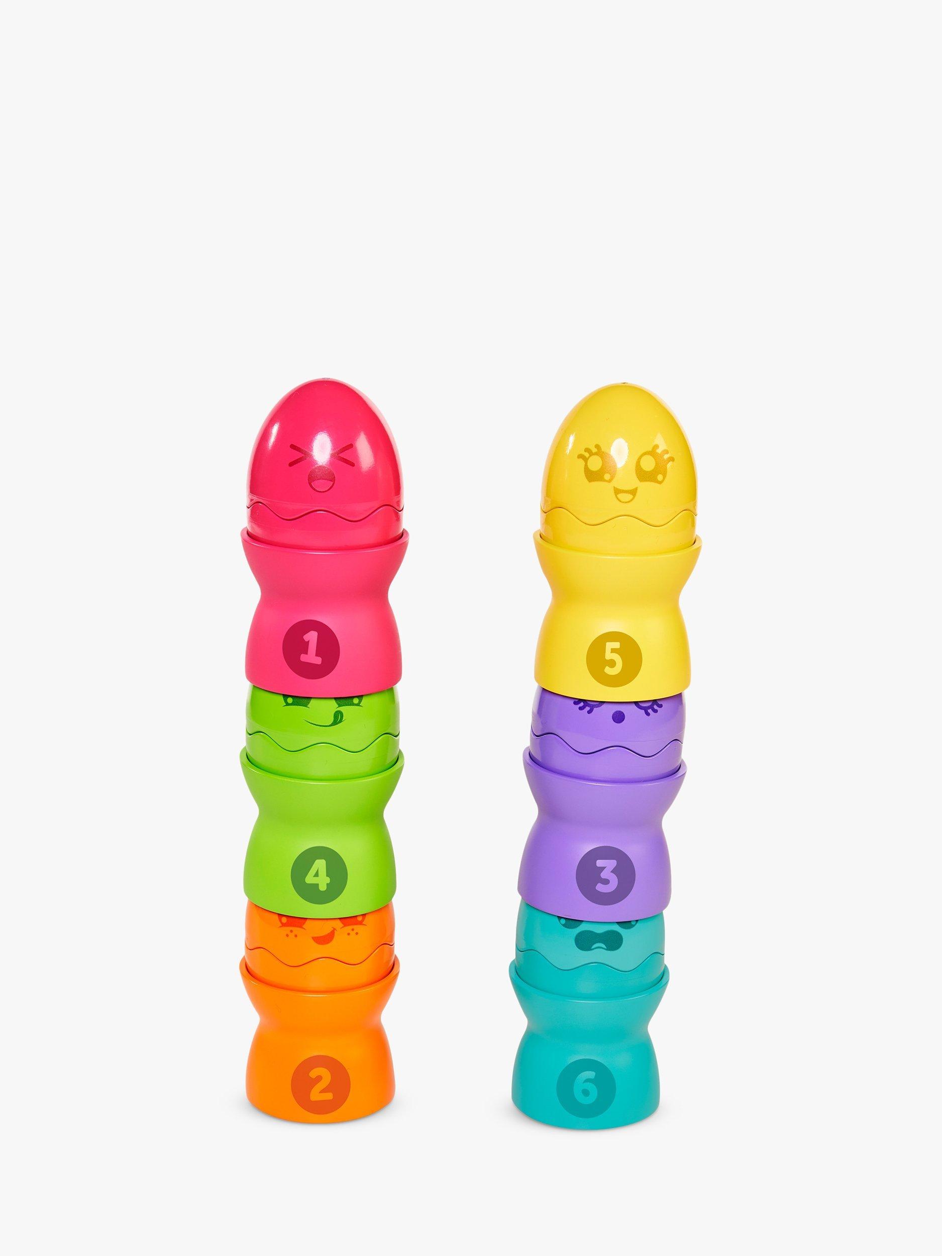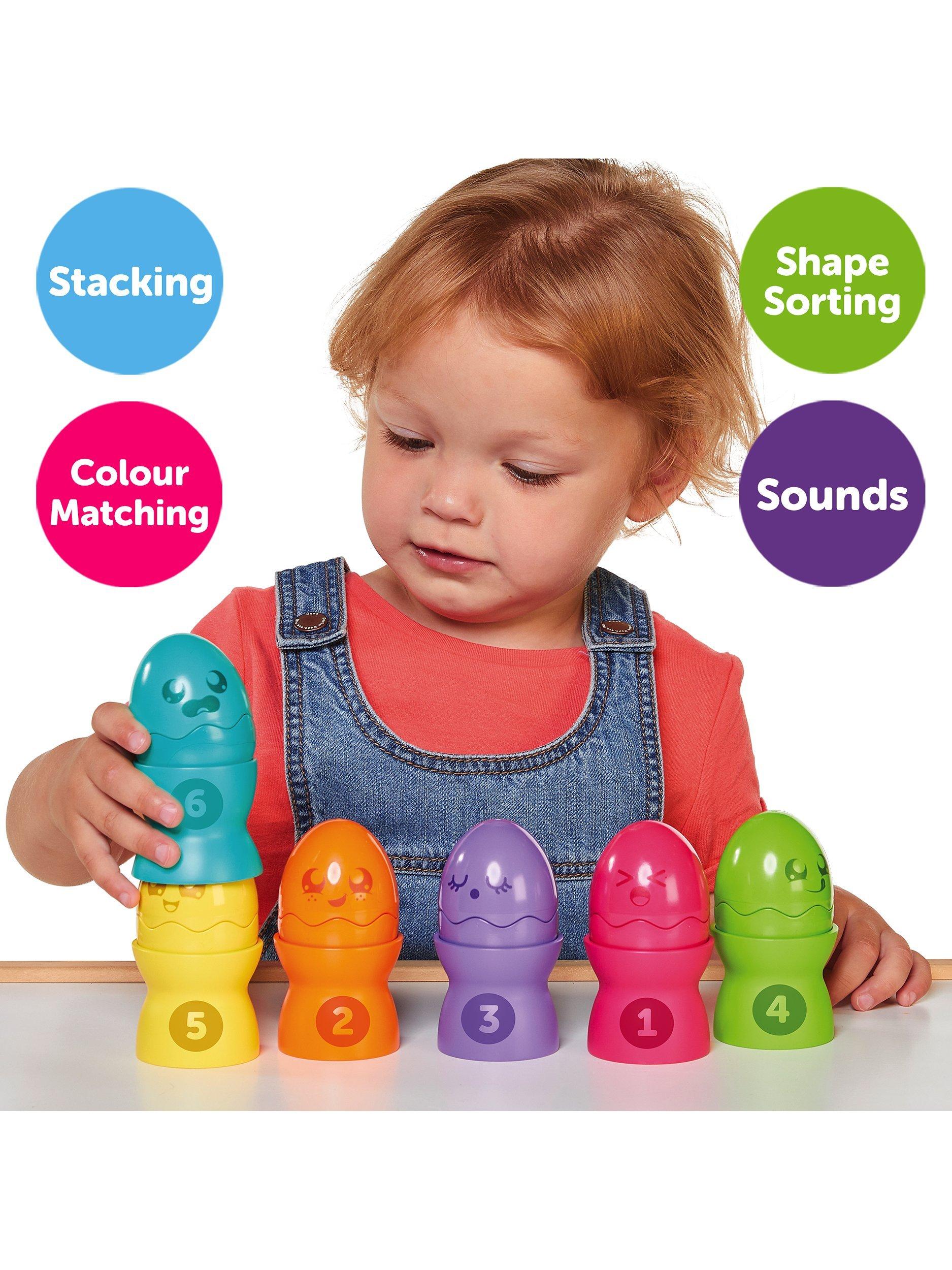 They squeak, they fit together, they stack, and they tumble down! Little ones will love all the things they can do with this happy half-dozen Hide & Squeak Egg Stackers.