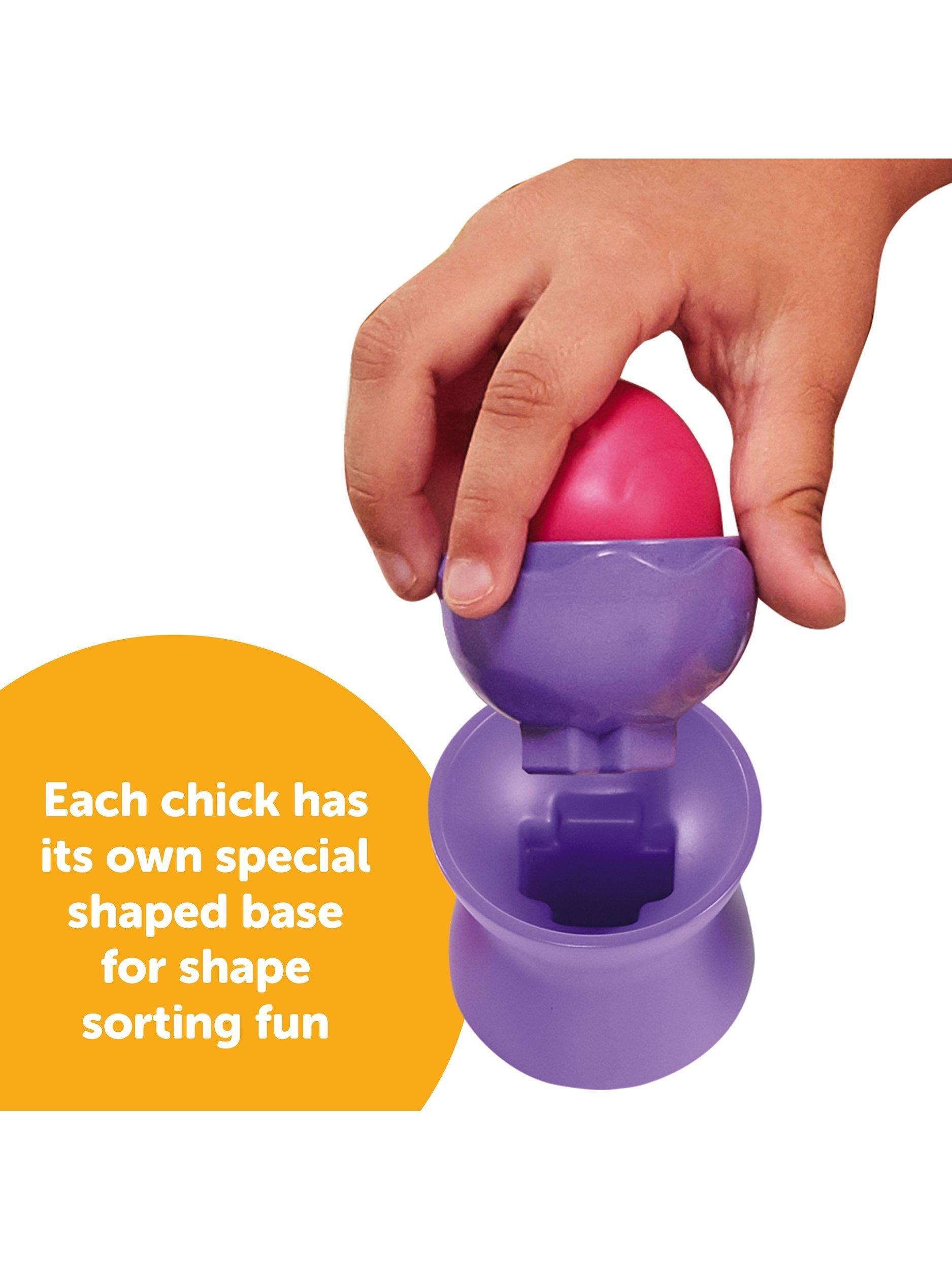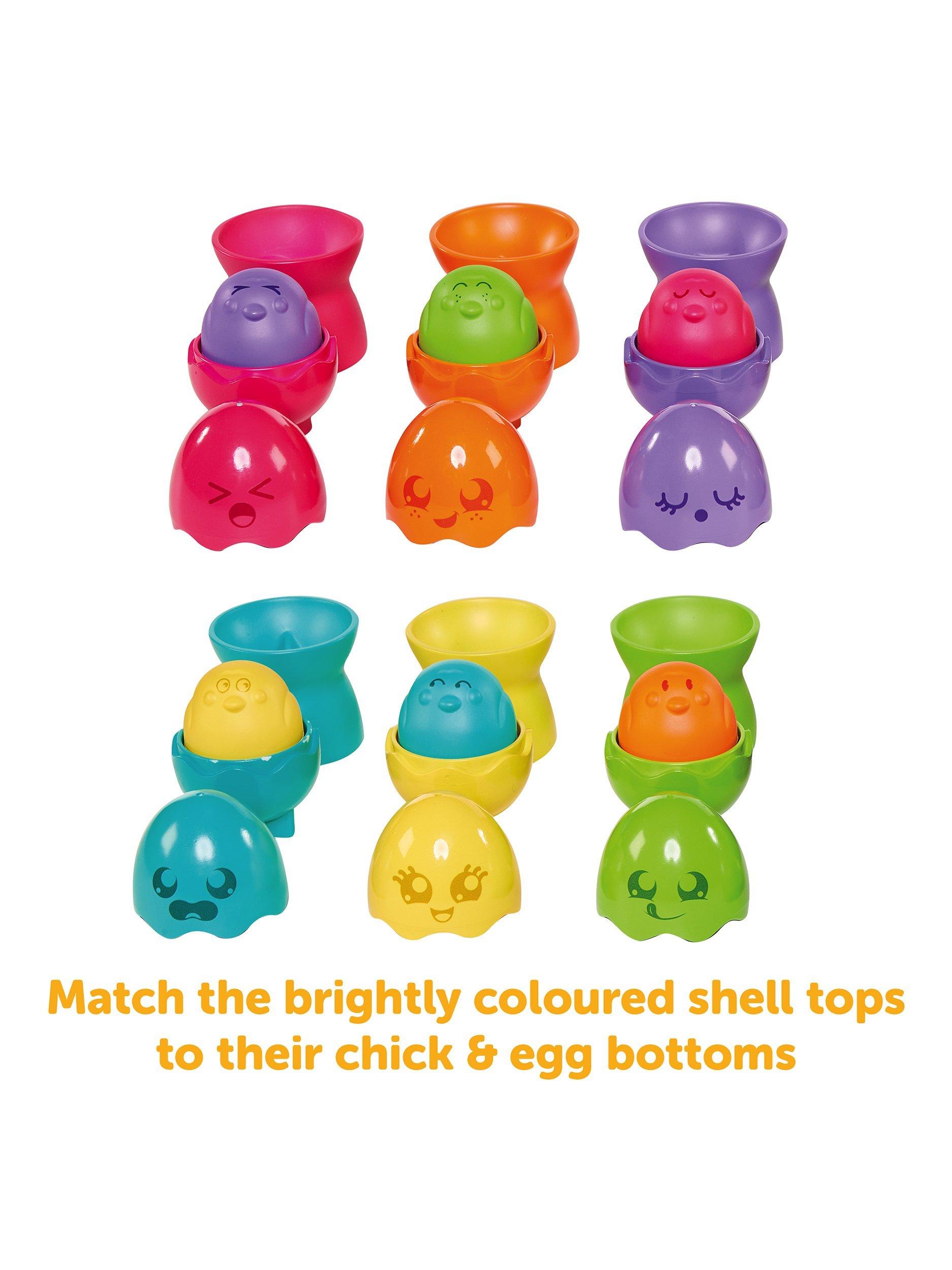 As toddlers grow towards their next play milestone, they will be able to match the bright, bold colours to pair up complete eggs, and sit them on their matching egg cups – both by colour and by sorting different shapes – each egg is made to fit a particular egg cup.