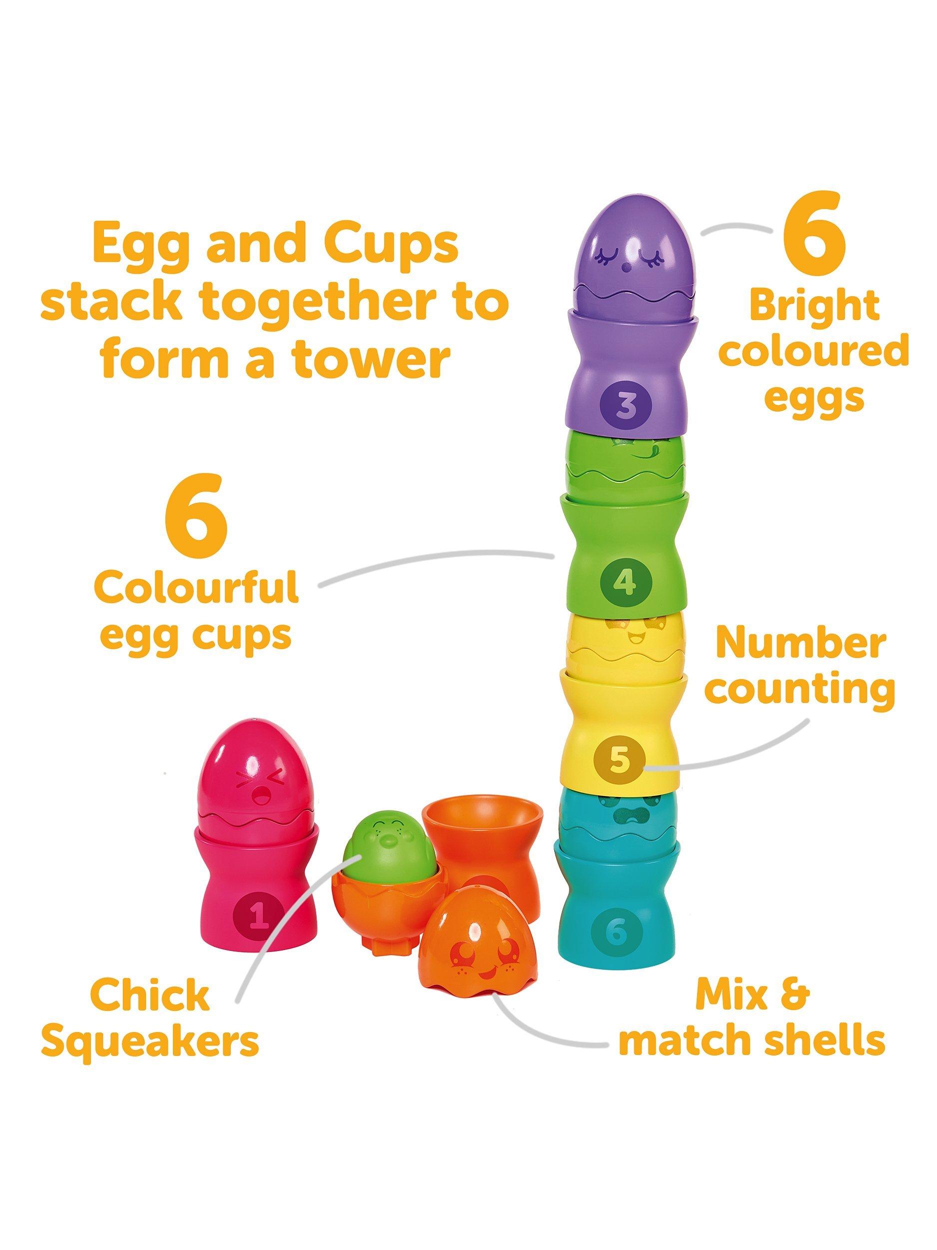 The fun doesn’t end there: as their confidence and play skills continue to grow, they can practise counting up from one to six, using the numbers printed on the egg cups and enjoy stacking the eggs one above the other to create a giant tower.
