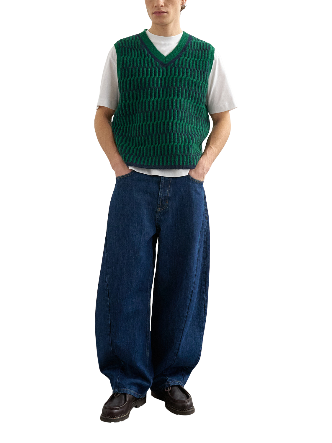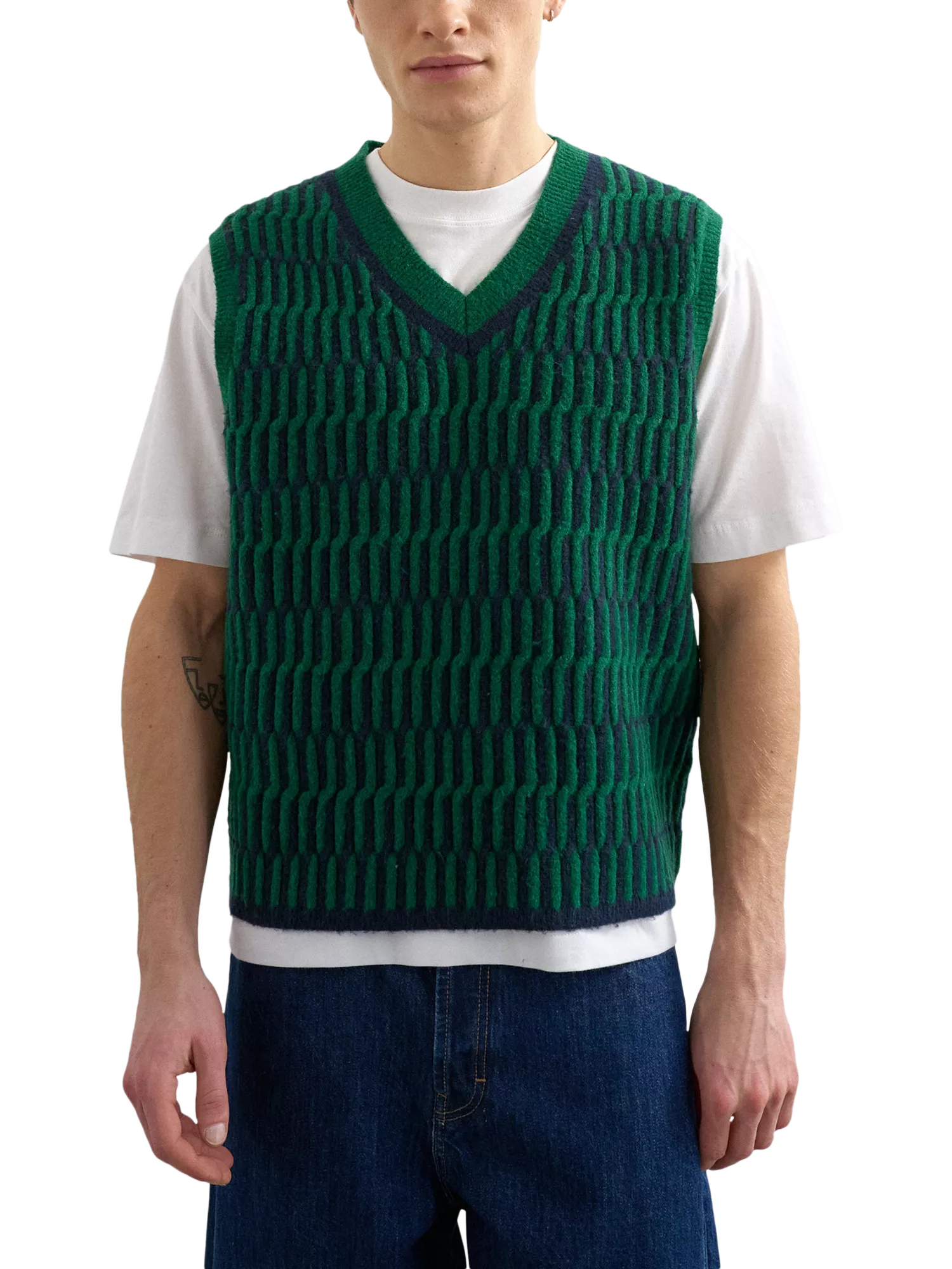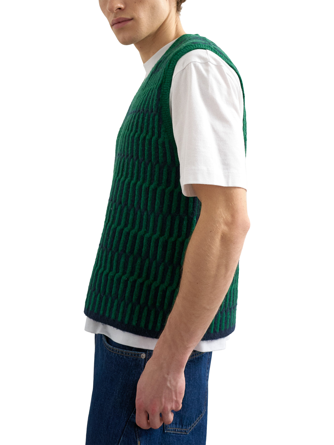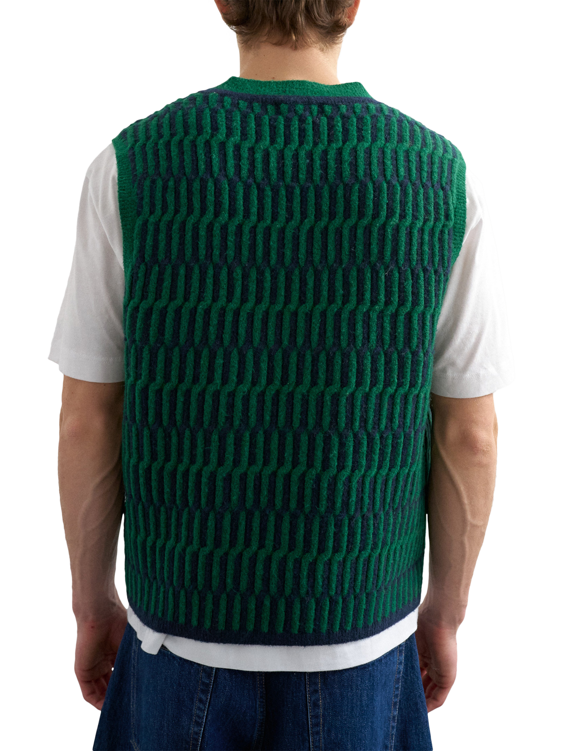 This V-neck sleeveless vest adds personality to your look with its abstract pattern and heavy knit. Soft to touch, it's easy to layer.