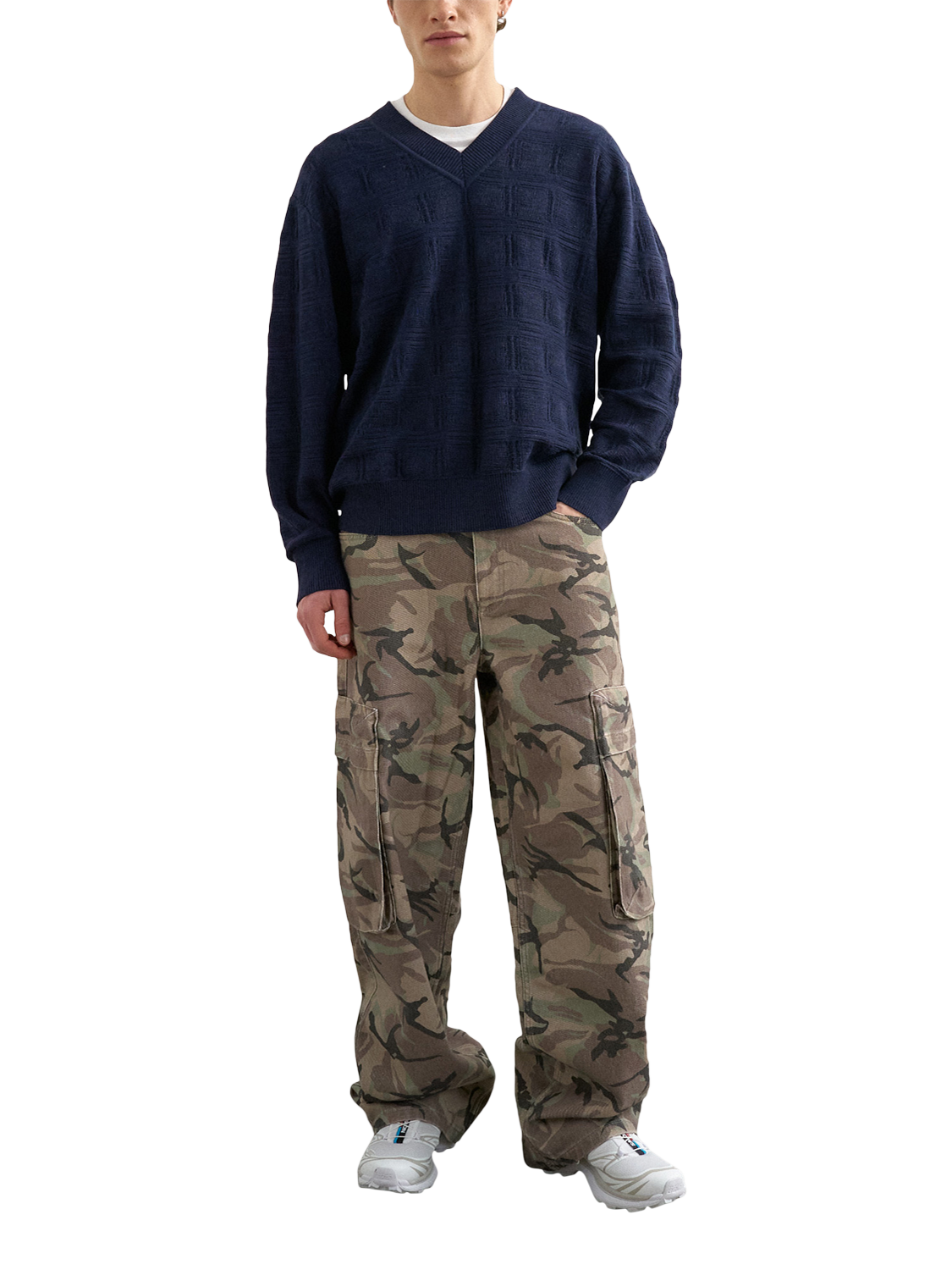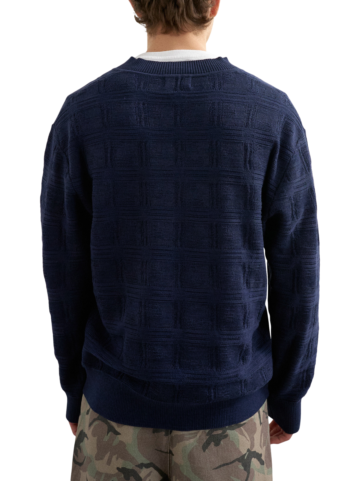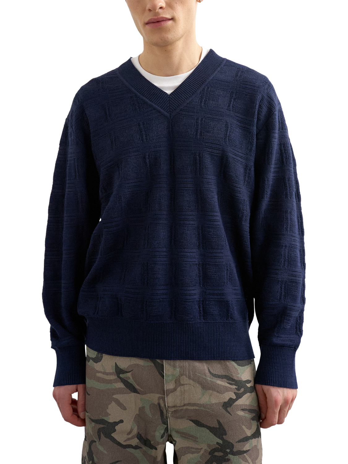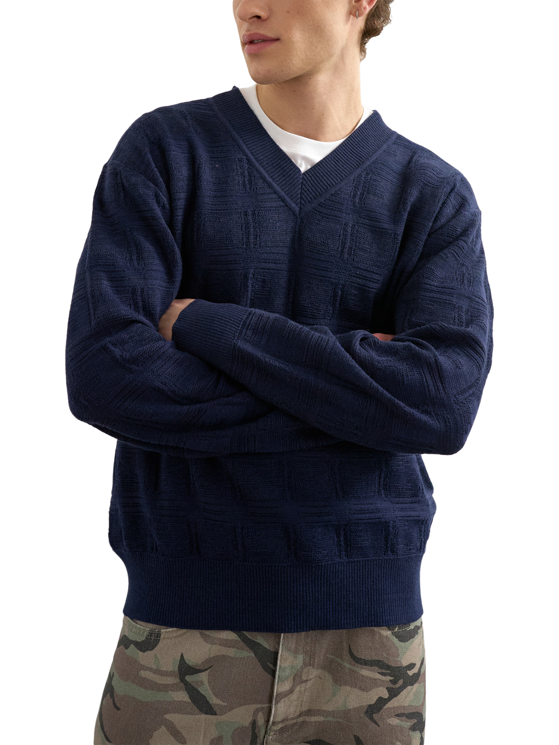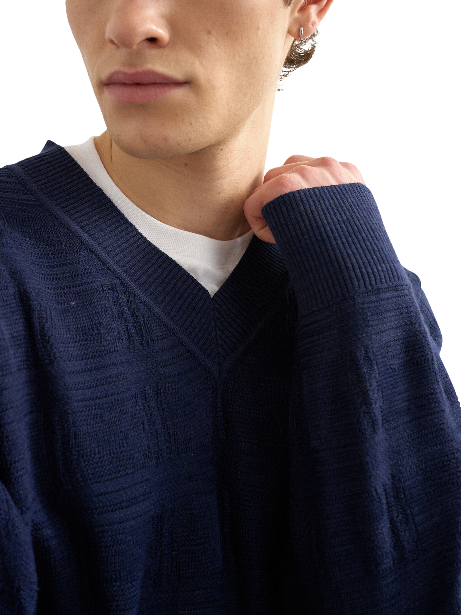 A textured check V-neck jumper. Perfect for layering or making a smart statement on its own, it keeps you comfortable and ready for whatever your day holds.