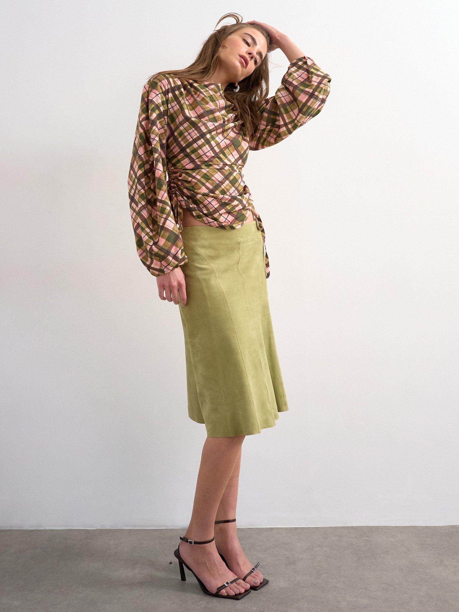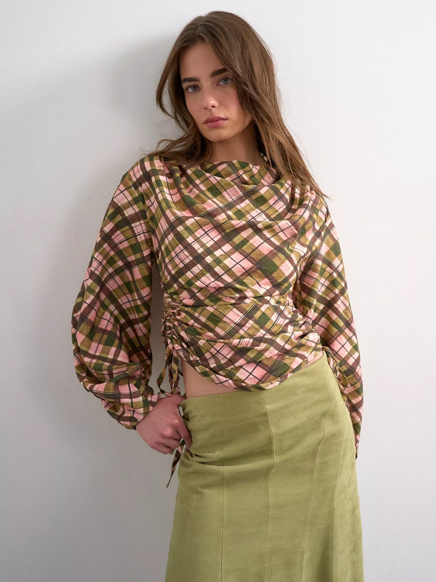 An effortless blouse from Topshop, blended with light viscose. Featuring a boat neck, long sleeves and drawstring ruched sides, it has your patterned collection in check with its classic print.