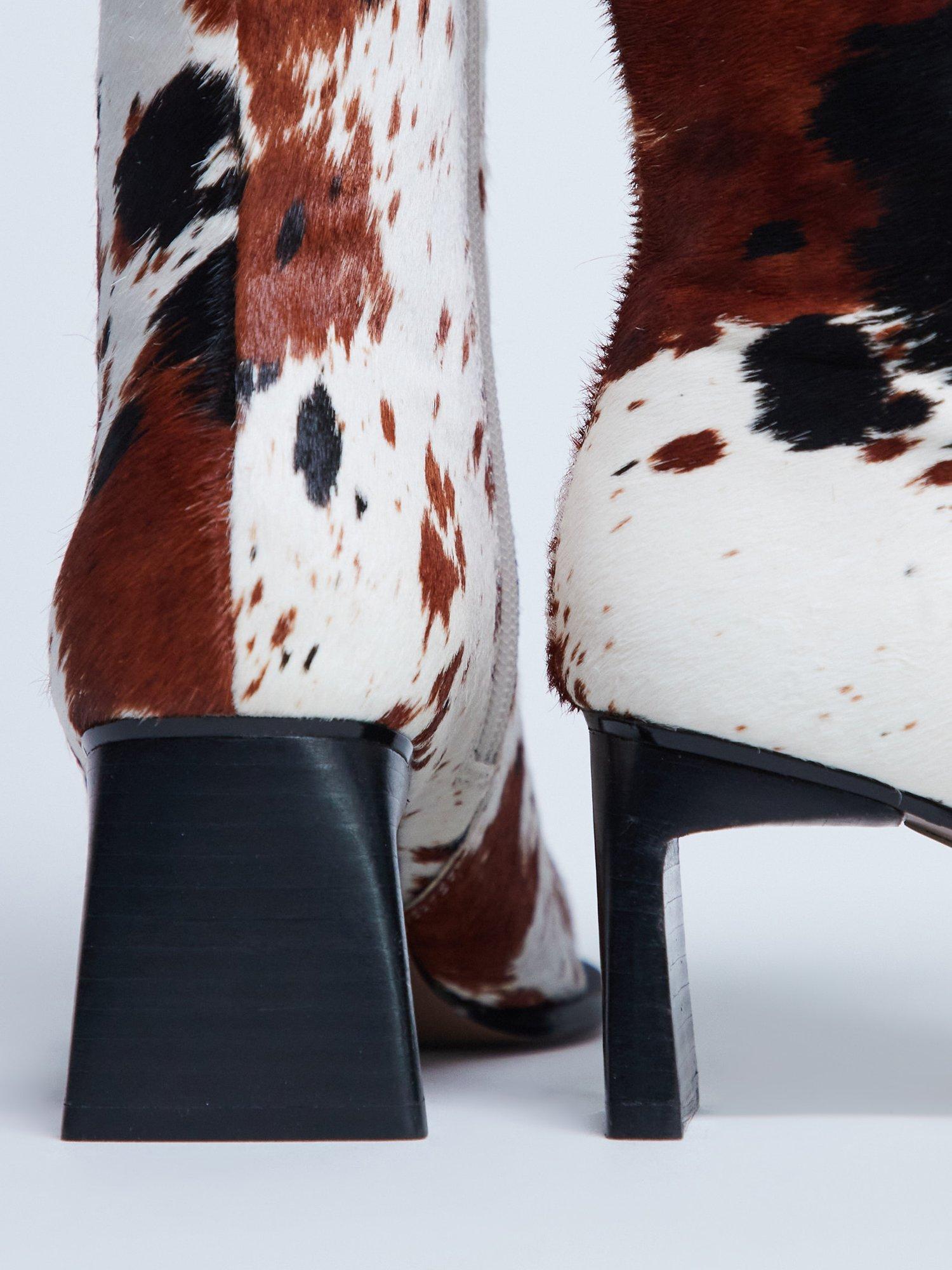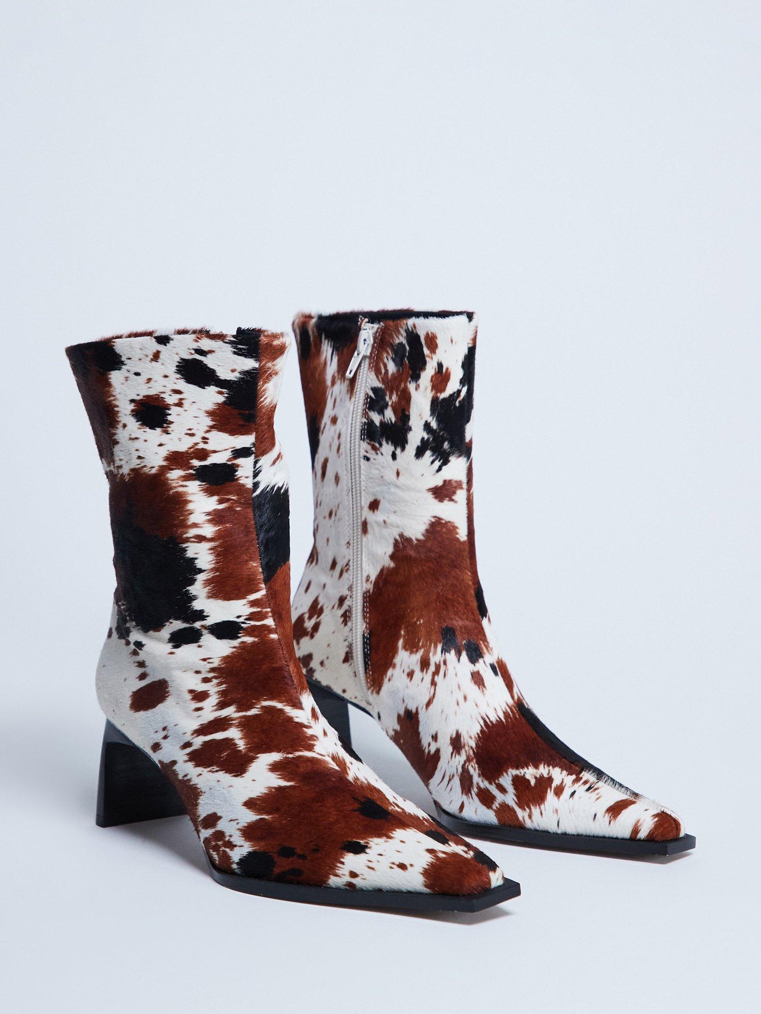 These Nadie boots are crafted from a textured hair fabric in cow print. They are cut at ankle length and feature a slim, square toe, zip-side fastening, and a thin mid-heel.