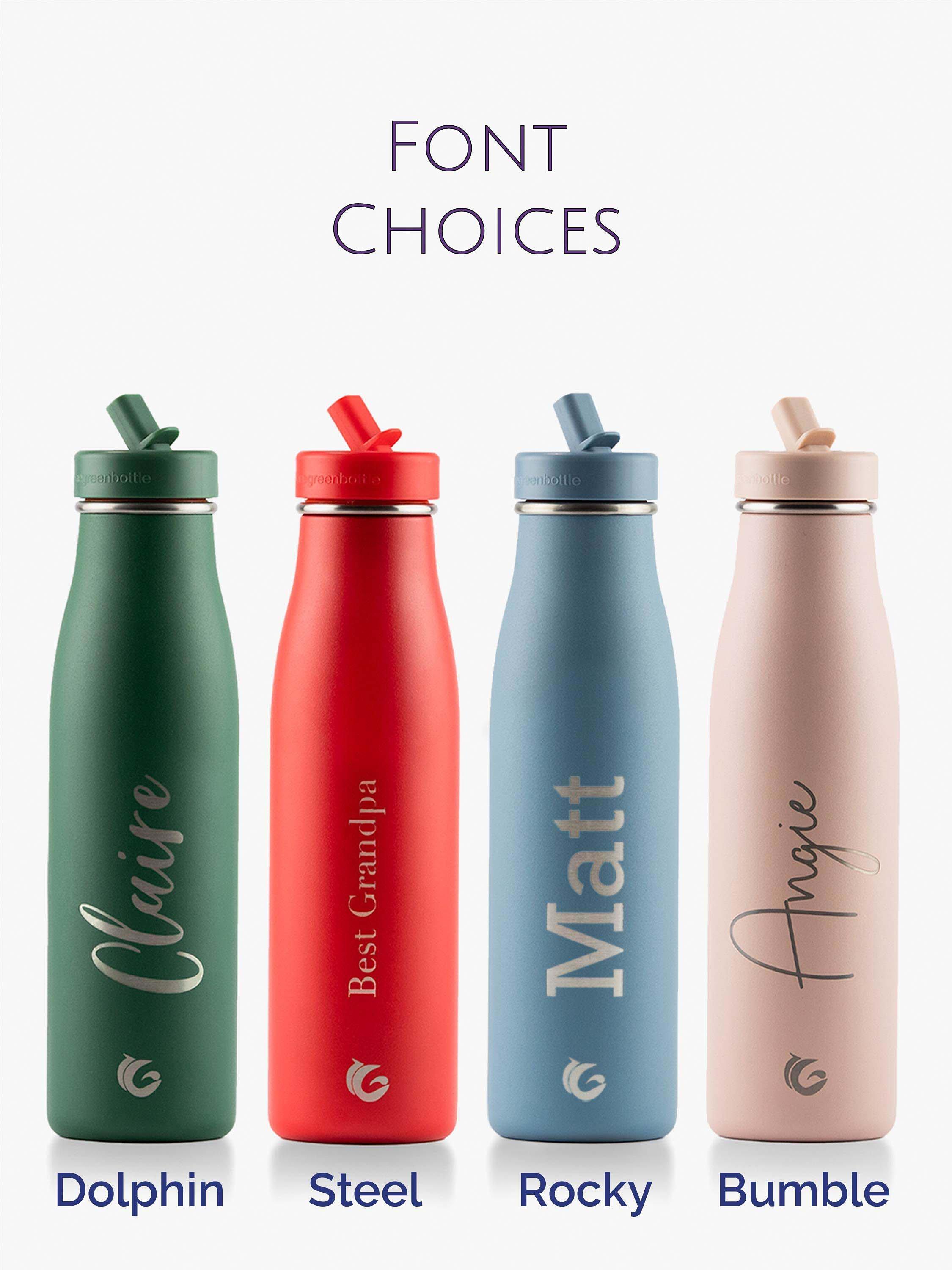 Choose from a selection of fonts and have a name laser engraved up the bottle to add that complete personalised finish. Laser engraving reveals the natural stainless steel silver beneath, this means your name will not rub off over time as you take your bottle out and about.