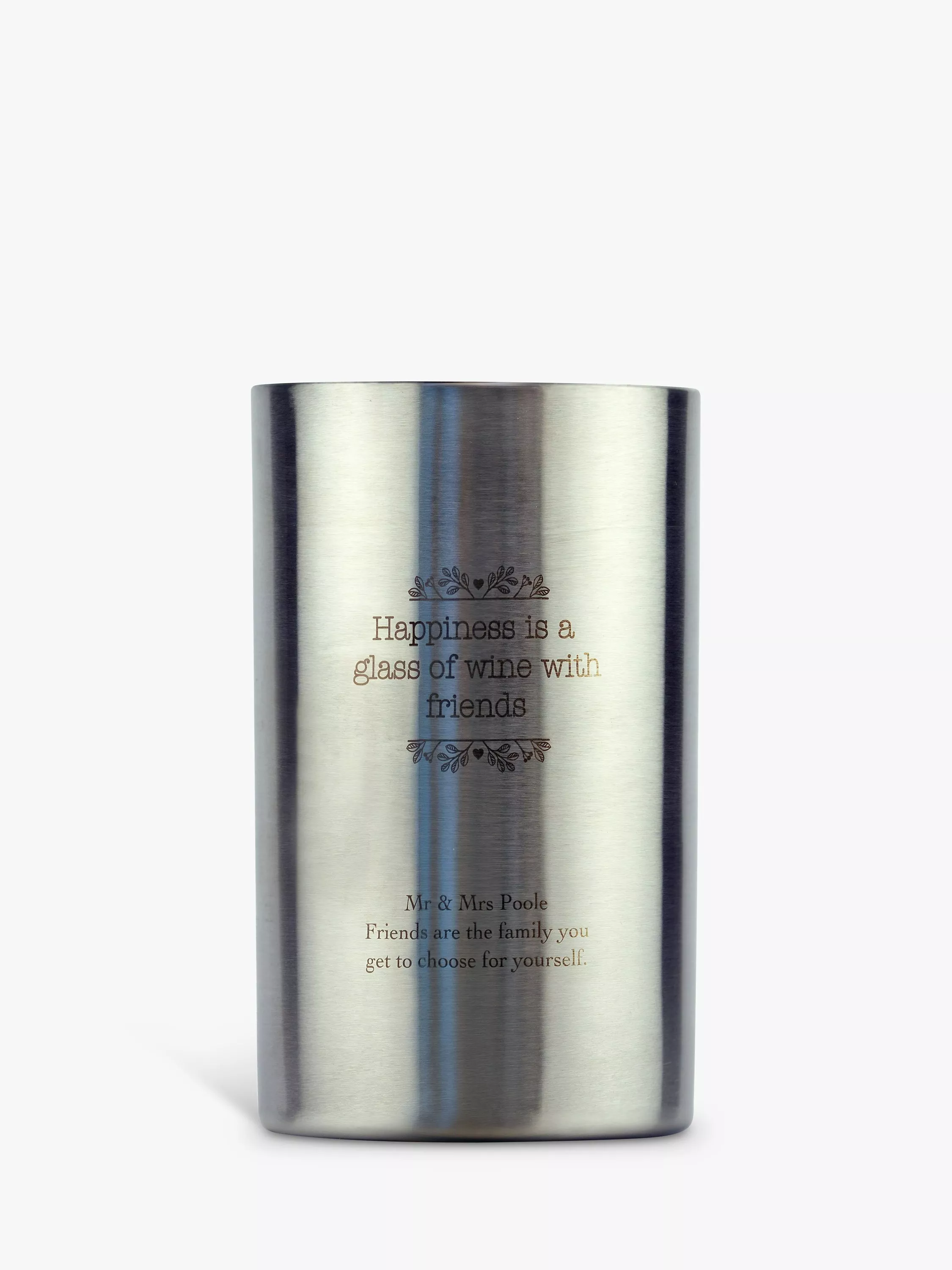 A double walled stainless steel wine cooler which can be personalised with your choice of text to compliment the 'Friends' design. The wine cooler is laser engraved revealing a natural gunmetal finish, resulting in a refined and classic look.
