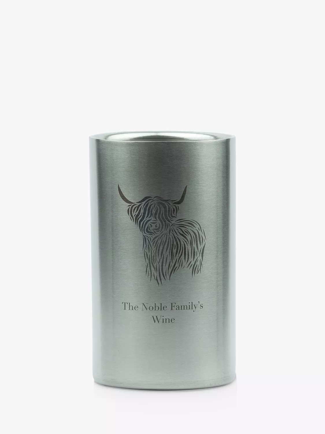 A double walled stainless steel wine cooler which can be personalised with your choice of text to compliment the Highland Cow design. The wine cooler is laser engraved with your choice of text beneath the image revealing a natural gunmetal finish, resulting in a refined and classic look.
