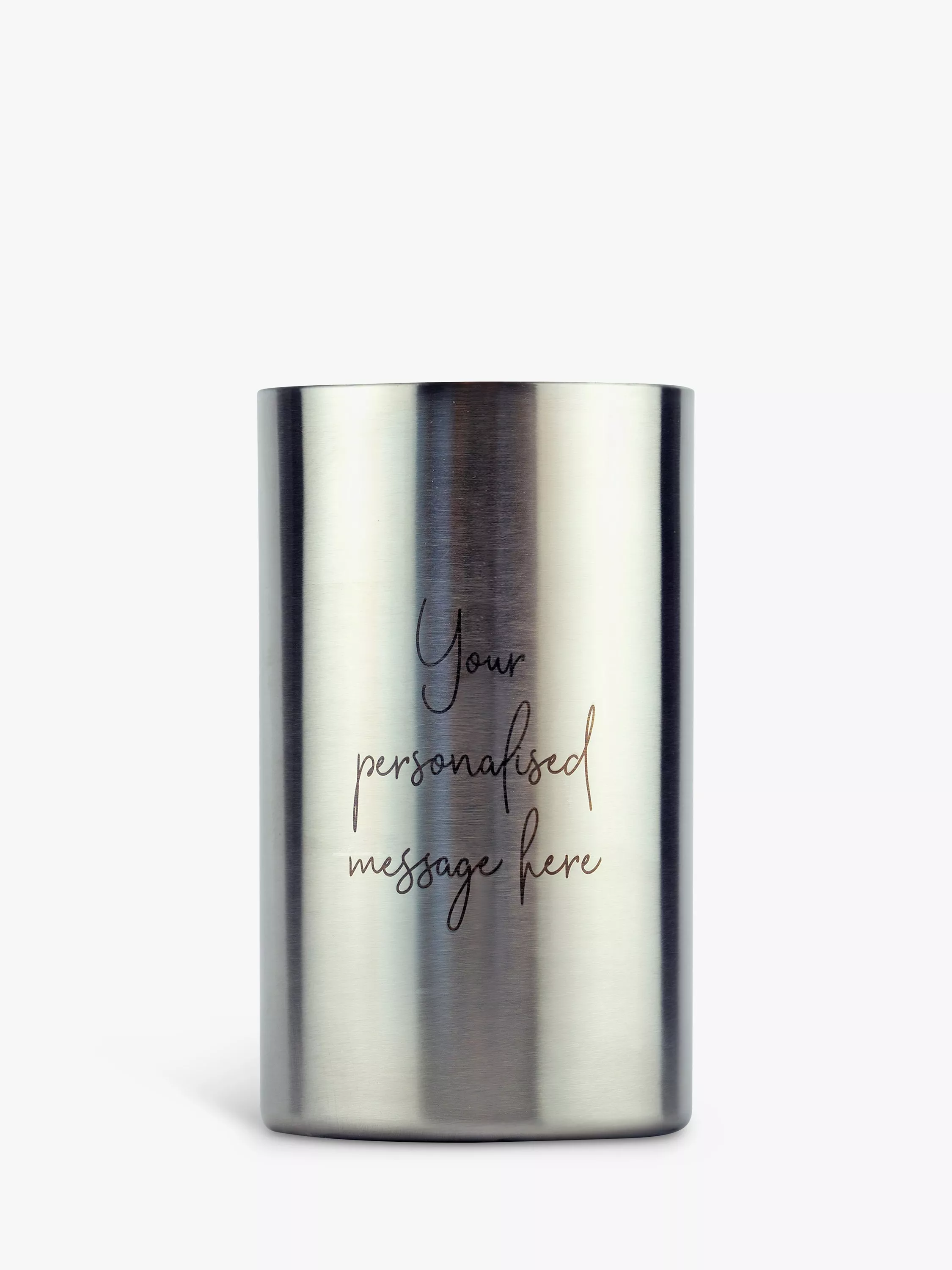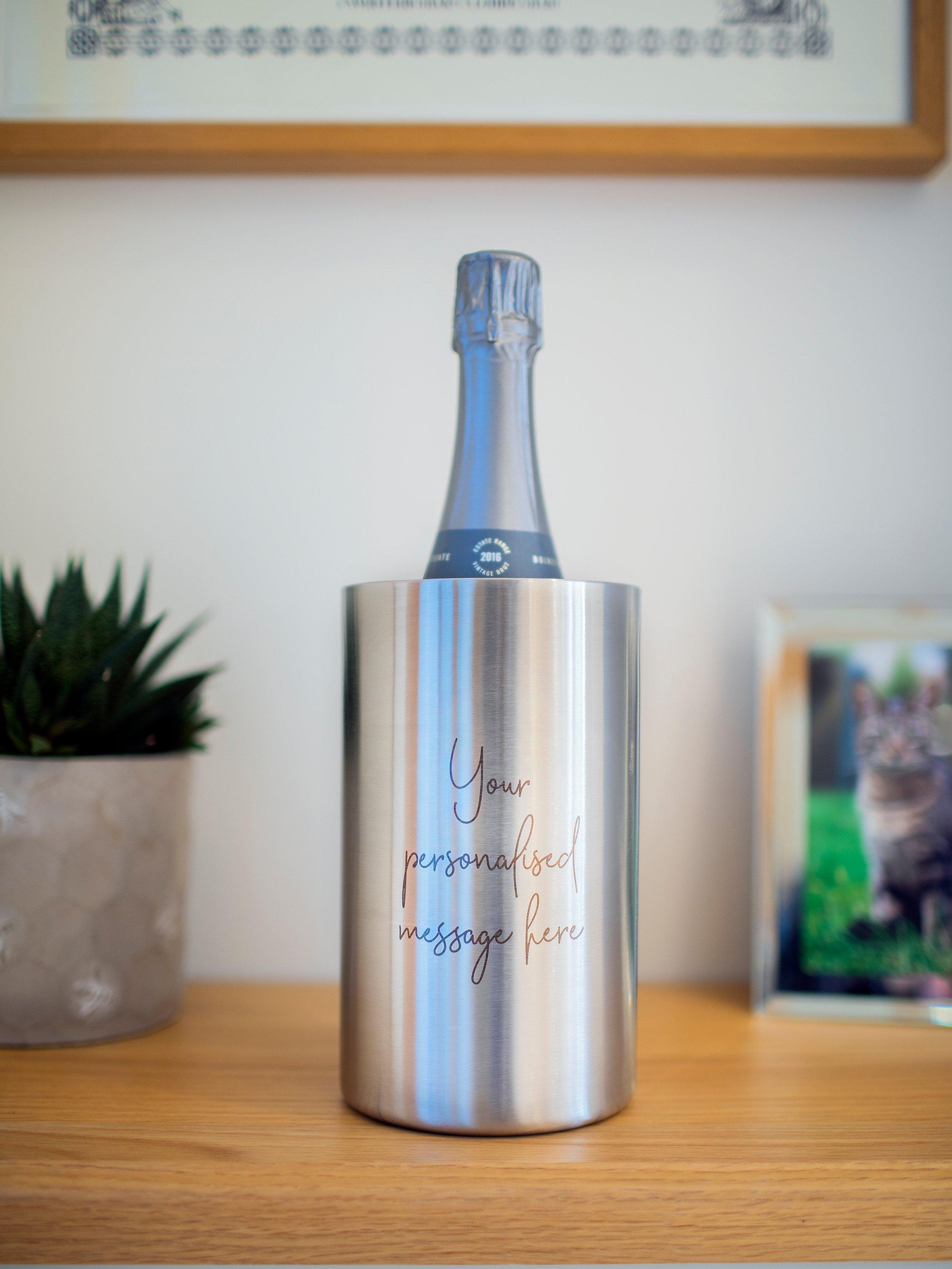 A double walled stainless steel wine cooler which can be personalised with your choice of text to compliment the chosen design. The wine cooler is laser engraved revealing a natural gunmetal finish, resulting in a refined and classic look.
