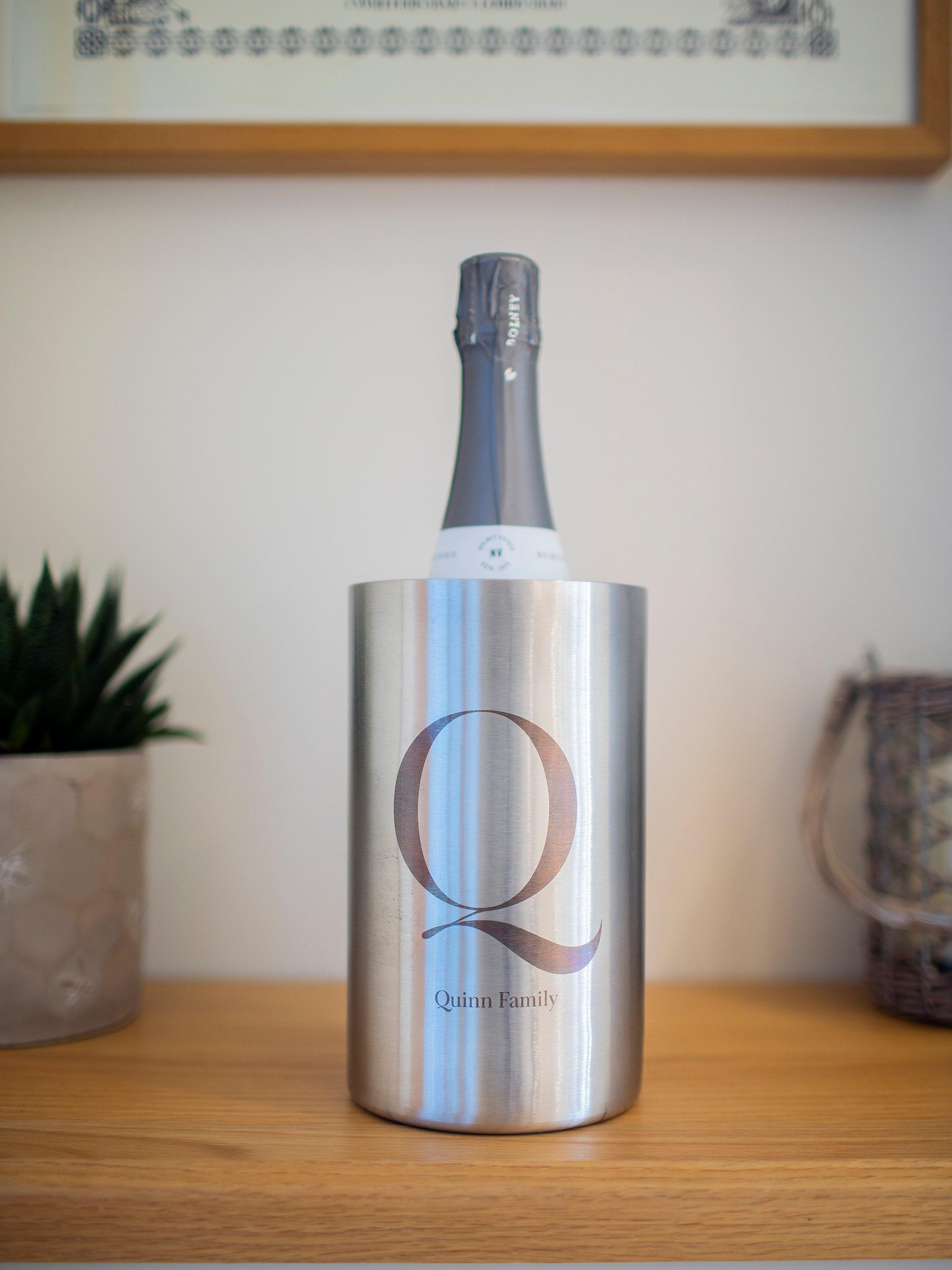 A double walled stainless steel wine cooler which can be personalised with your choice of text to compliment the chosen design. The wine cooler is laser engraved revealing a natural gunmetal finish, resulting in a refined and classic look.