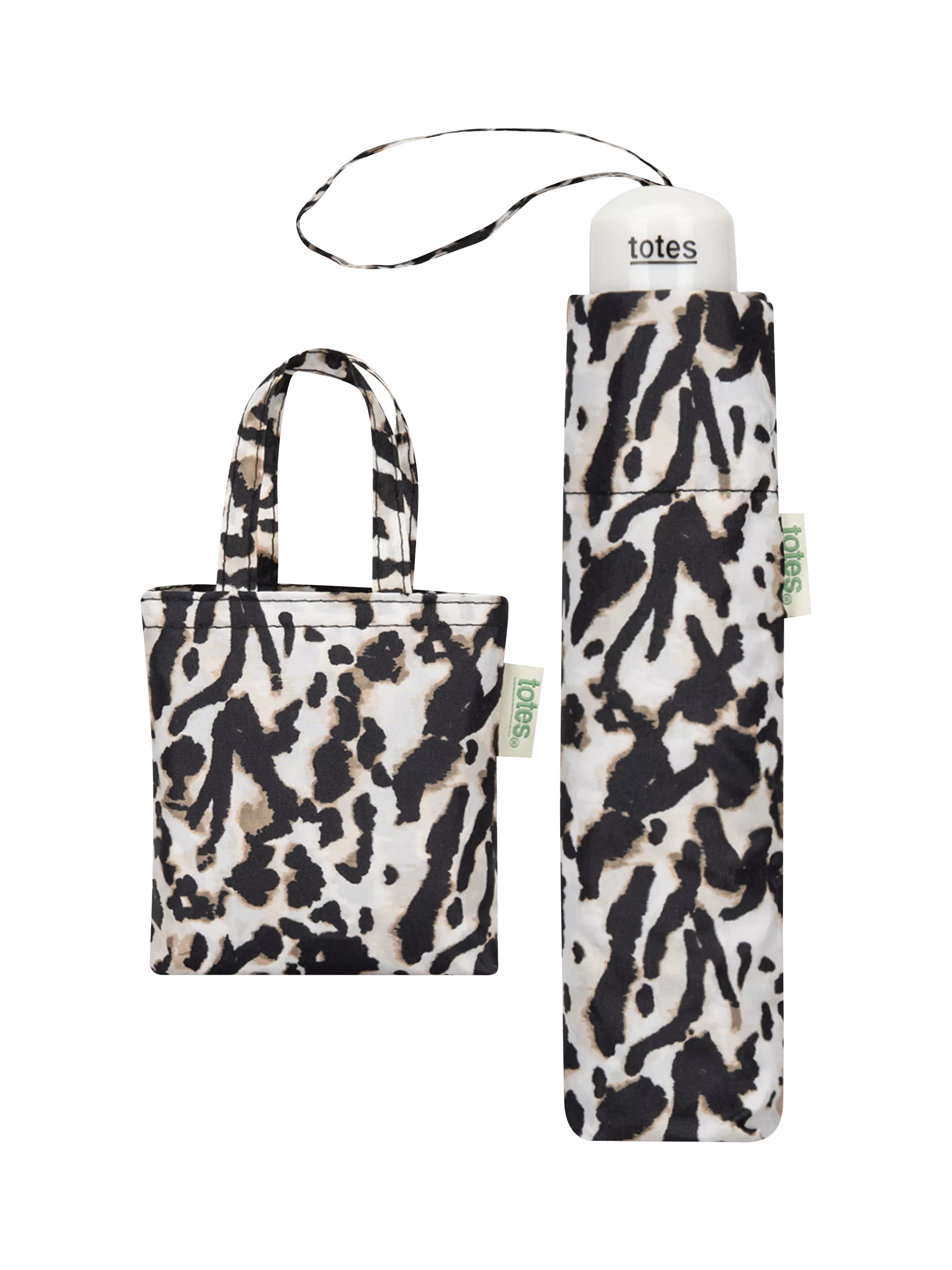 Add a touch of wild style to your rainy day essentials with the totes Supermini & Matching Bag-in-Bag Umbrella Shopper in Animal Markings Print.