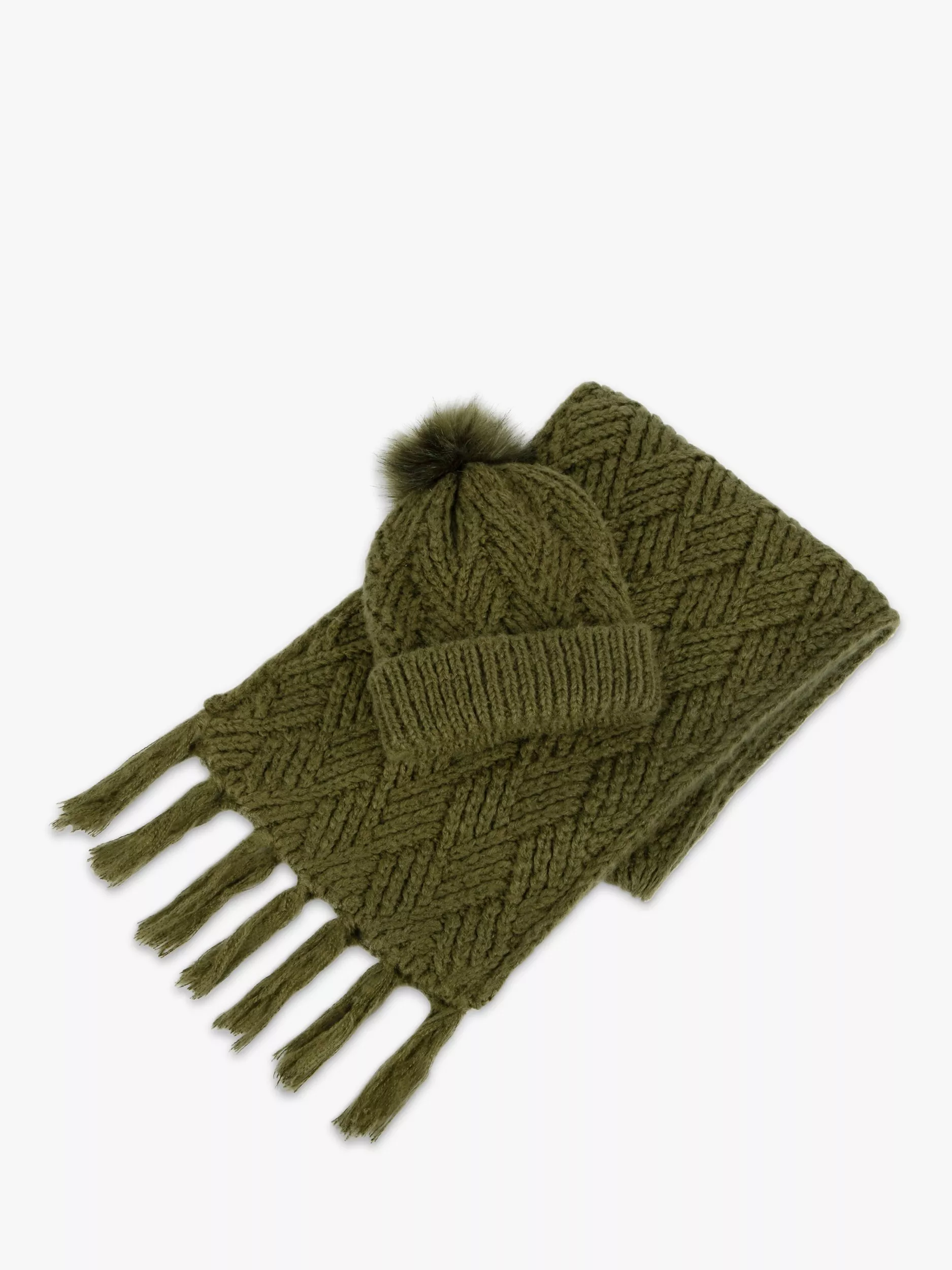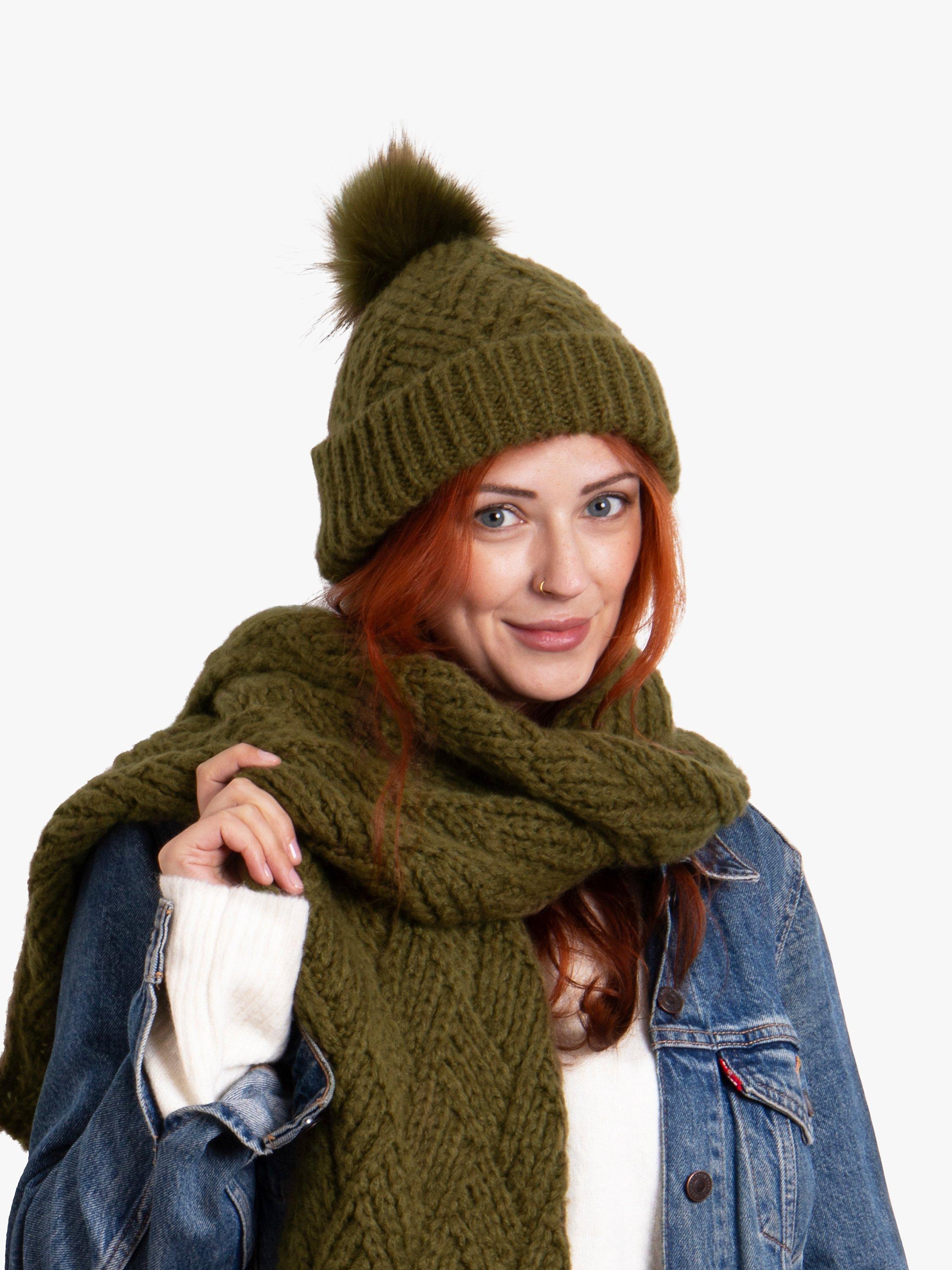 Beating winter's chills in style! Classic cable knit scarf co-ordinated with a matching knit hat with sherpa lining and pompom trim for a perfect winter boost.