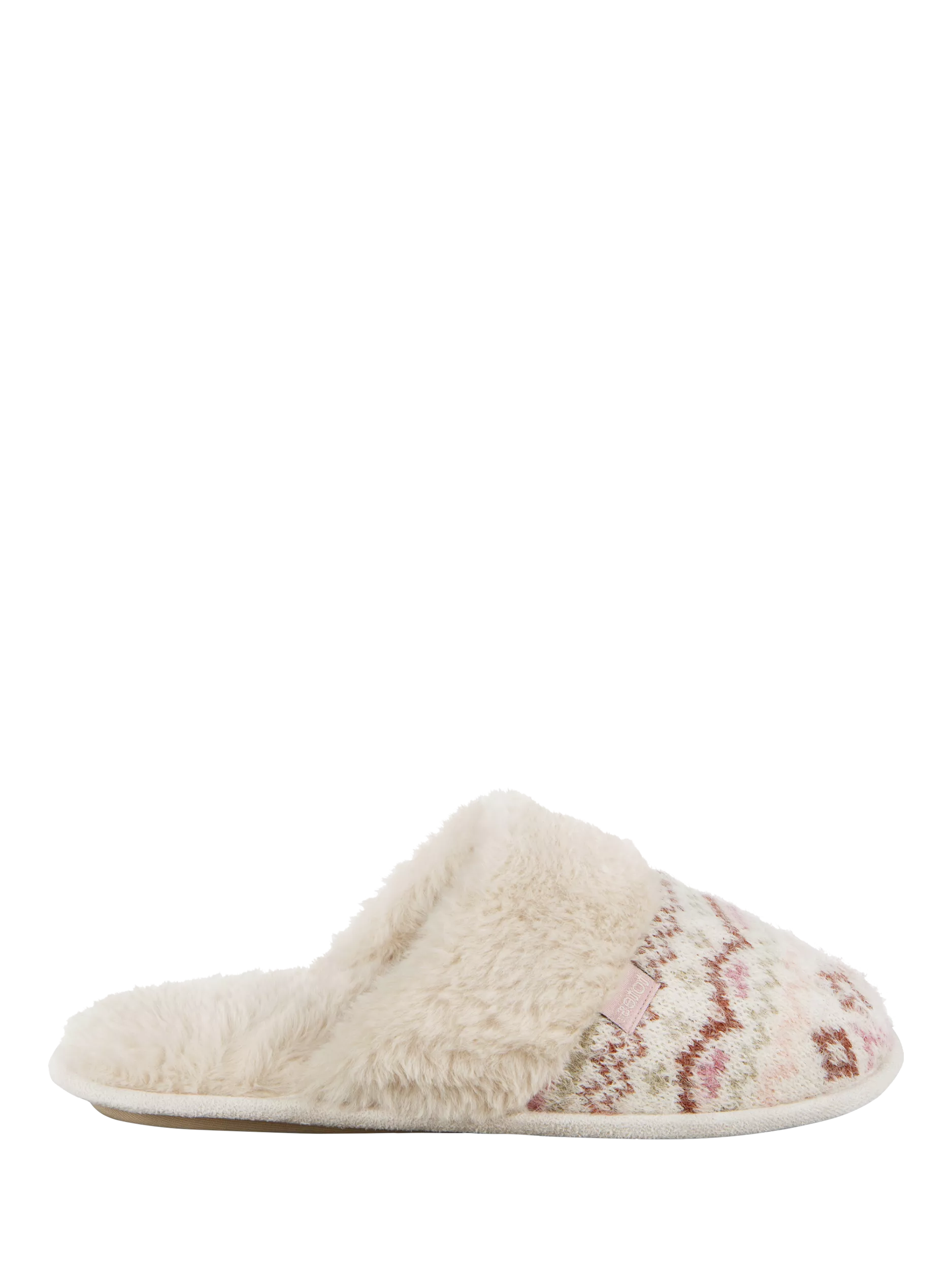 Traditional Fair Isle patterning in soft shades sets off these cosy mule slippers perfectly. With a faux fur lining and cuff for warmth and cosiness, they'll keep feet warm. Their easy-slip-on styling makes them a practical choice for everyday wear, while memory foam ensures all-day comfort. They feature a textured TPR sole and come beautifully packaged for the perfect gift.