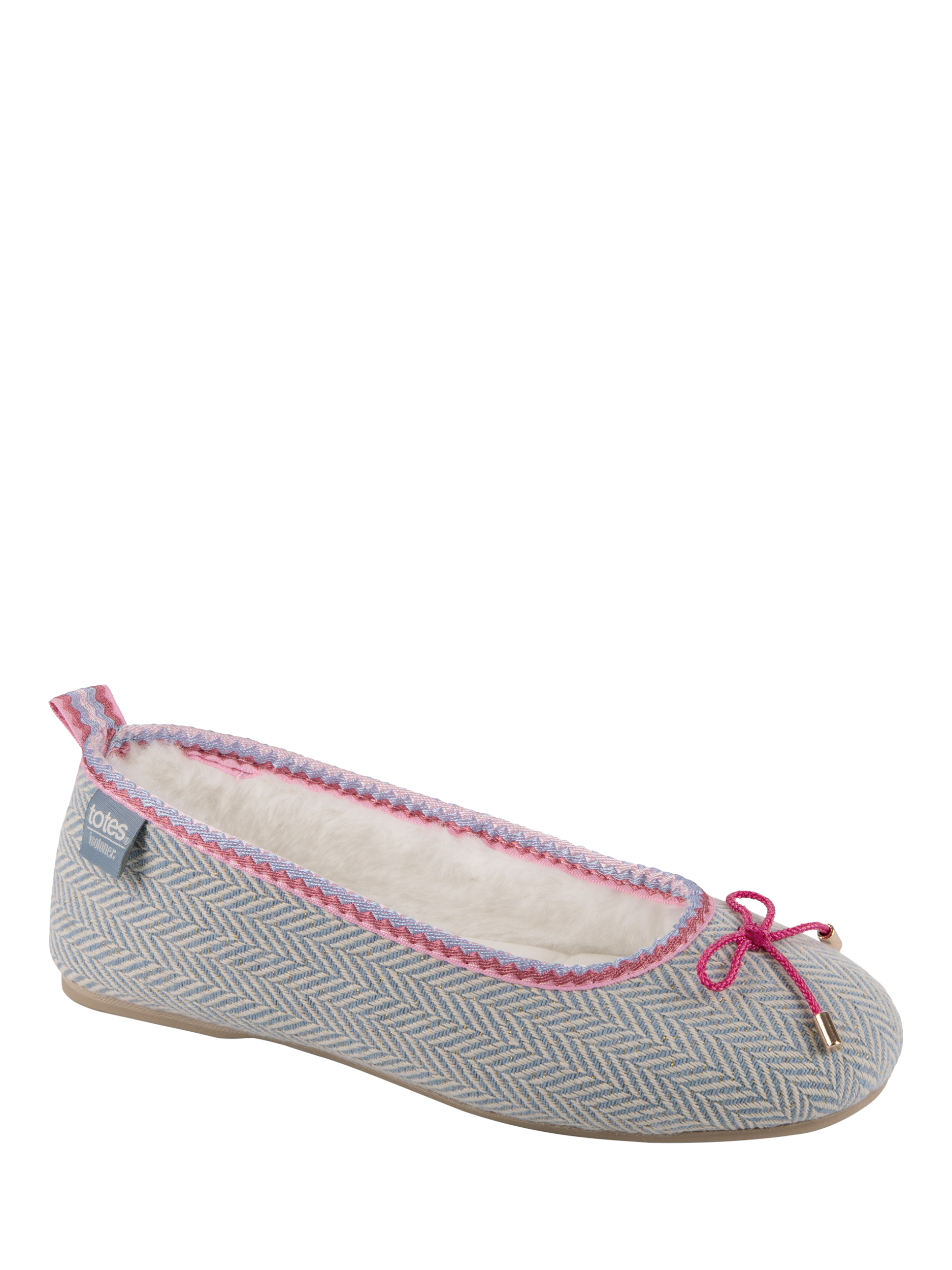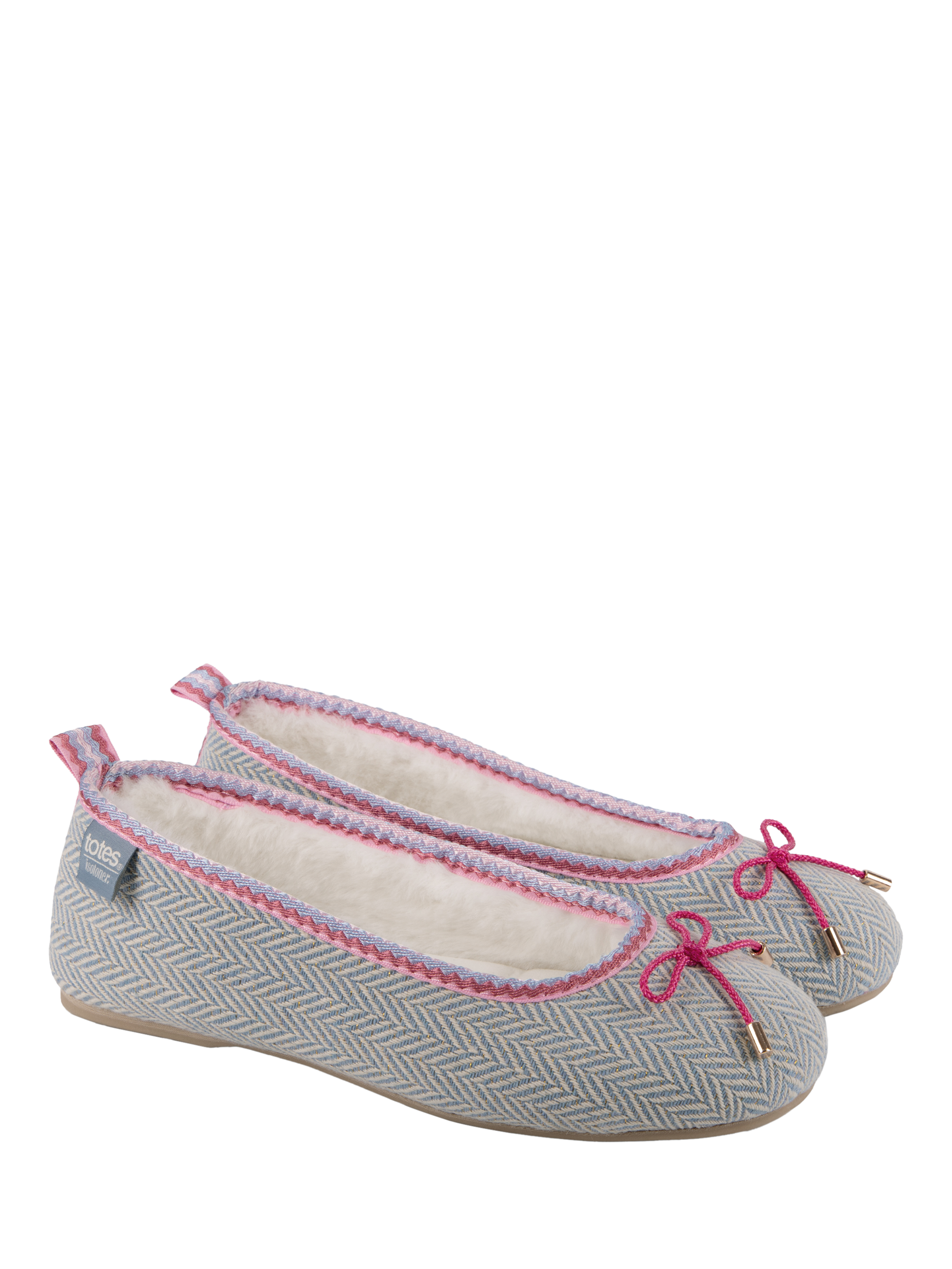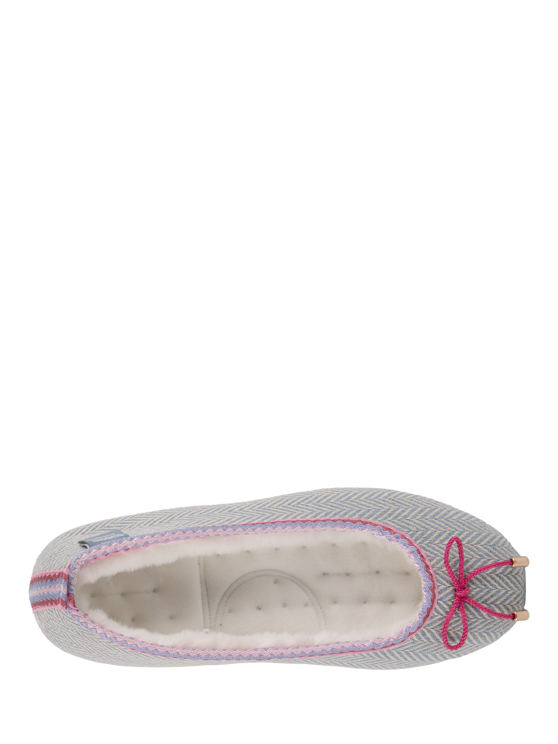 These beautiful ballet-style slippers in pretty blue herringbone fabric with fuchsia pink embroidery and bow detailing are the perfect blend of comfort and cuteness this season.