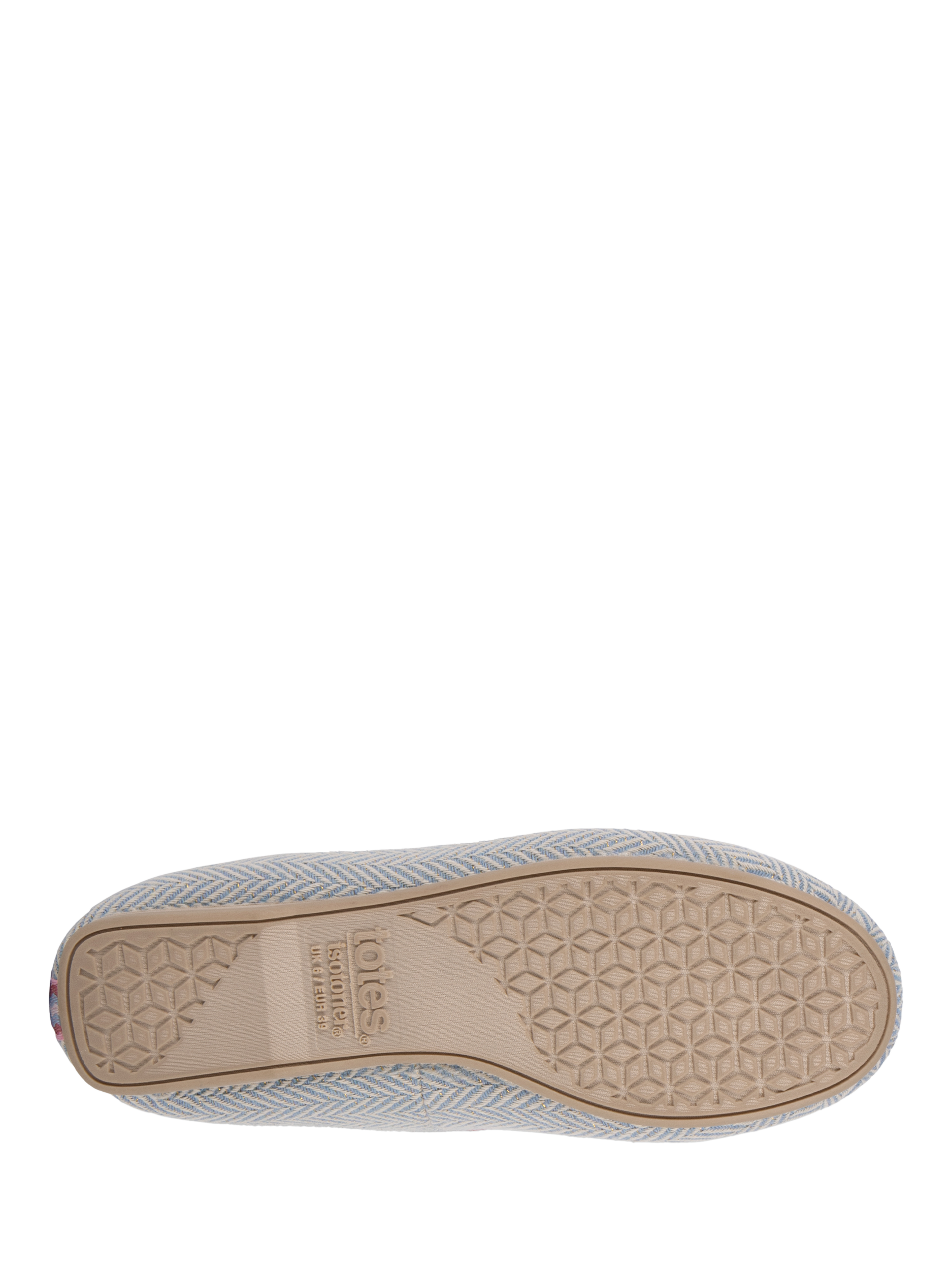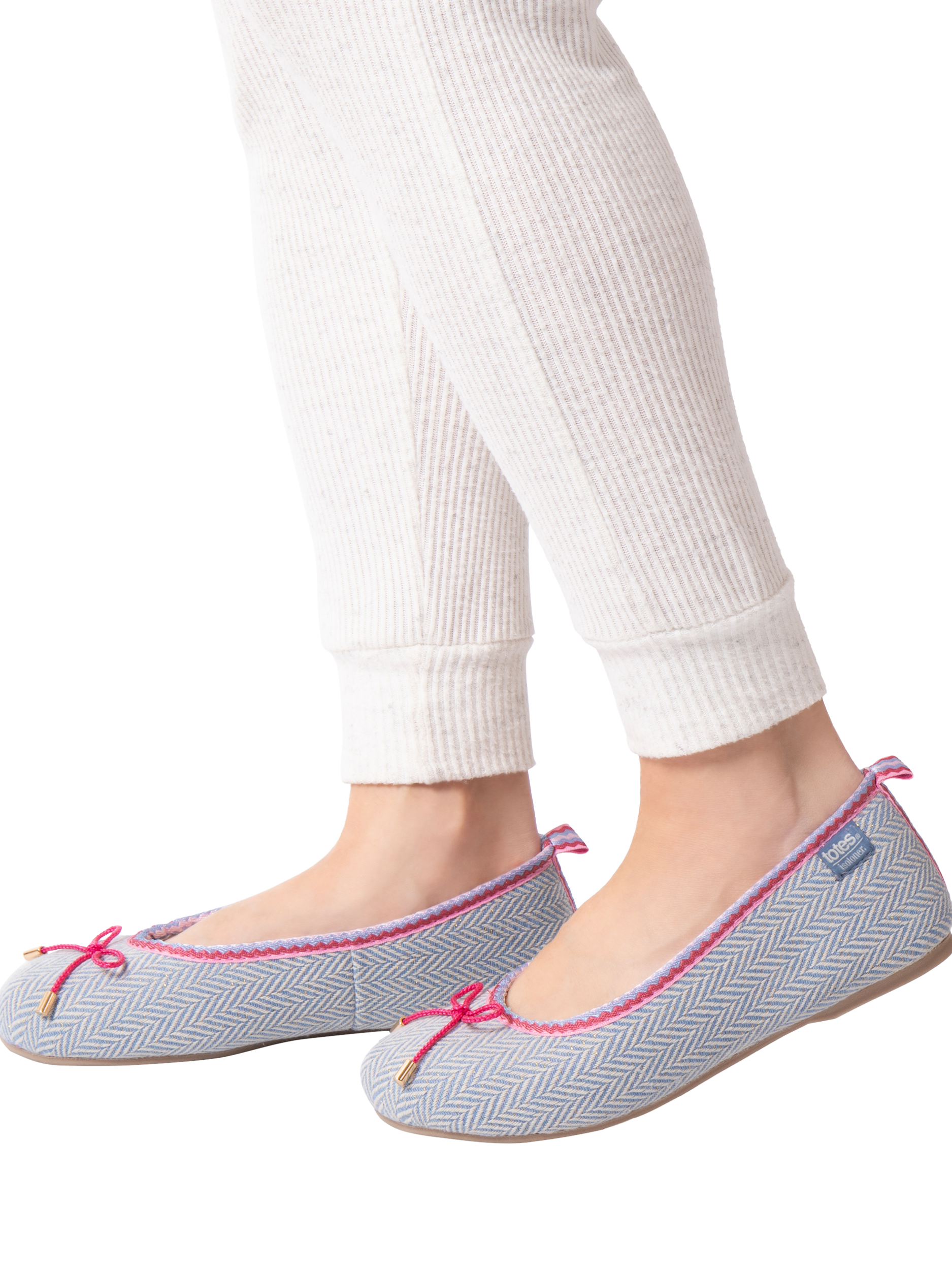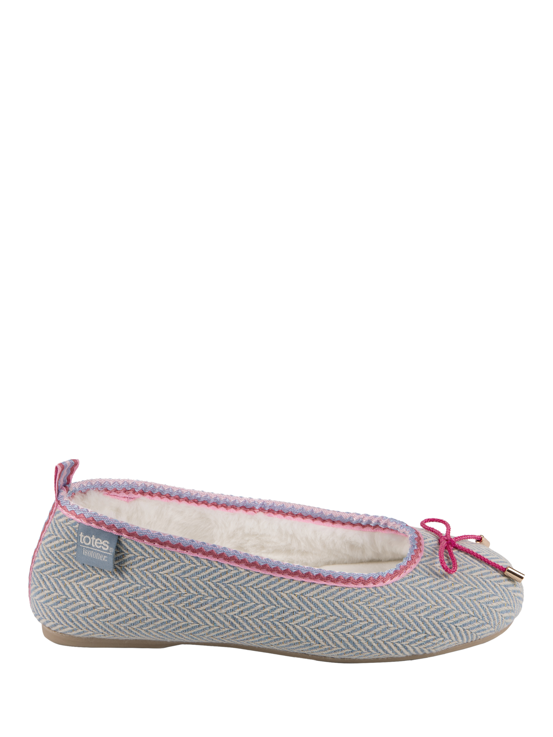 These beautiful ballet-style slippers in pretty blue herringbone fabric with fuchsia pink embroidery and bow detailing are the perfect blend of comfort and cuteness this season.