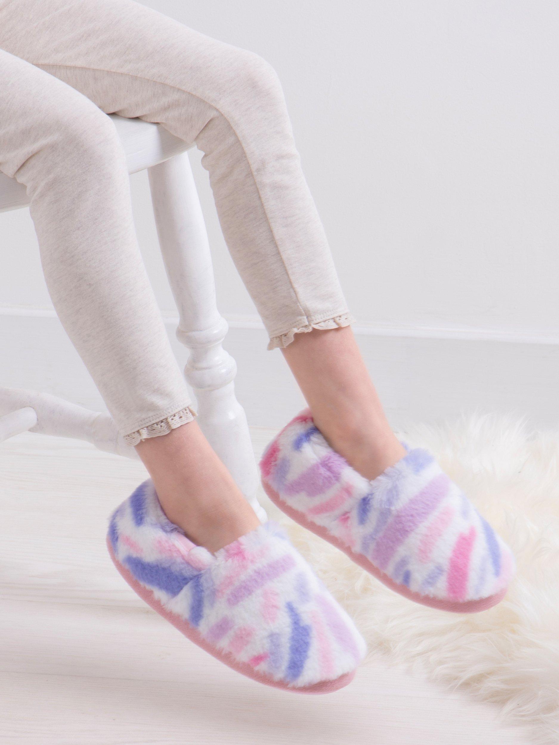 Grown-up slippers for your little ones; lovely splashes of soft pink, blue and lilac decorate these full-back slippers with a durable sole and gorgeously warm fleece lining. Co-ordinate with their winter cosies for a snuggled-up winter season.