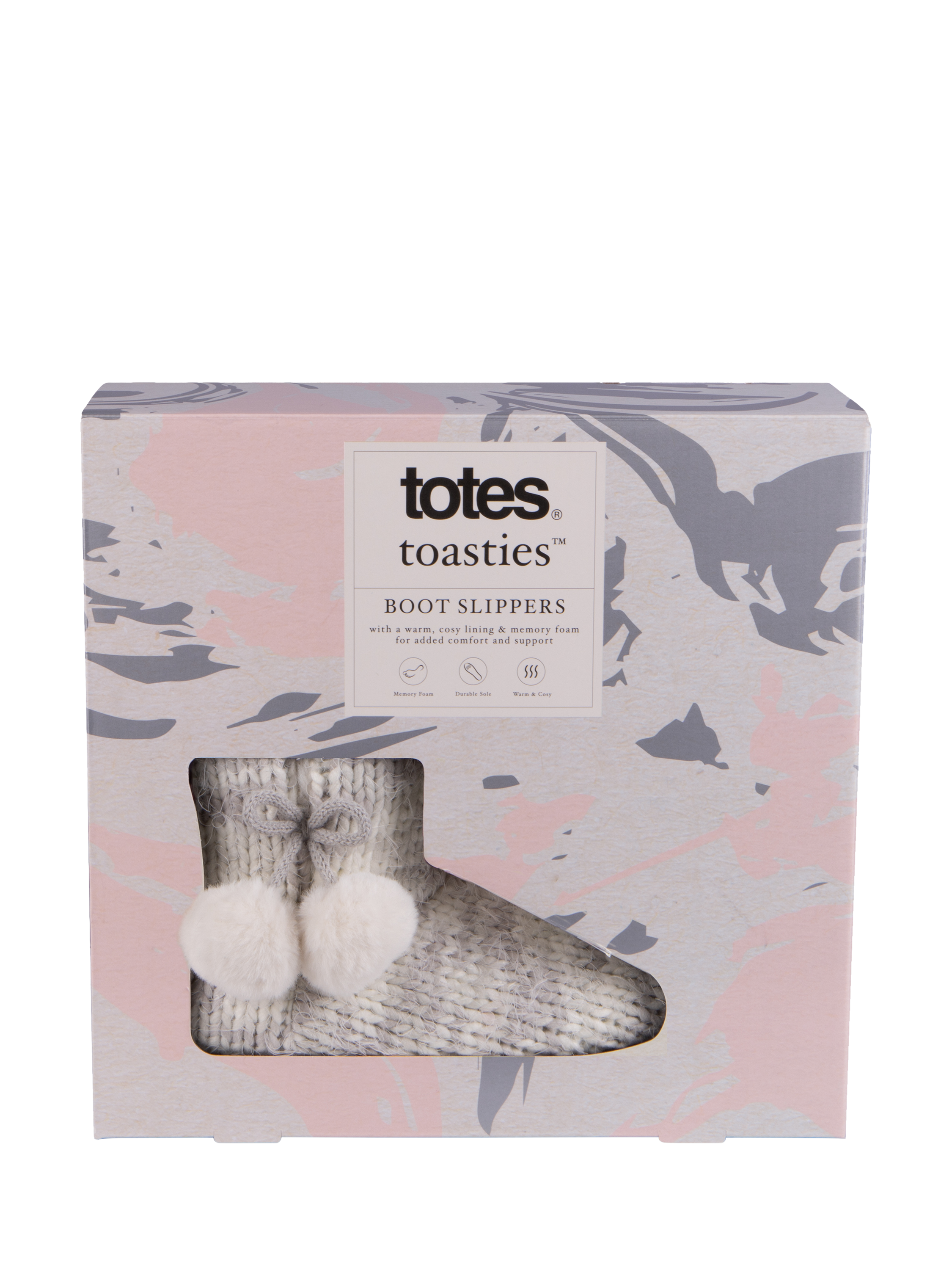 Introducing a pair of cosy and comfy knitted bootie-style slippers, perfect for a relaxing night in. Featuring cute pom pom ties at the ankle, they are lined with warm and cosy faux fur for added comfort, while memory foam provides cushioned support. Finished with a durable sole, these slippers ensure both comfort and durability, making them ideal for indoor relaxation during chilly evenings. Beautifully packaged for the perfect gift.