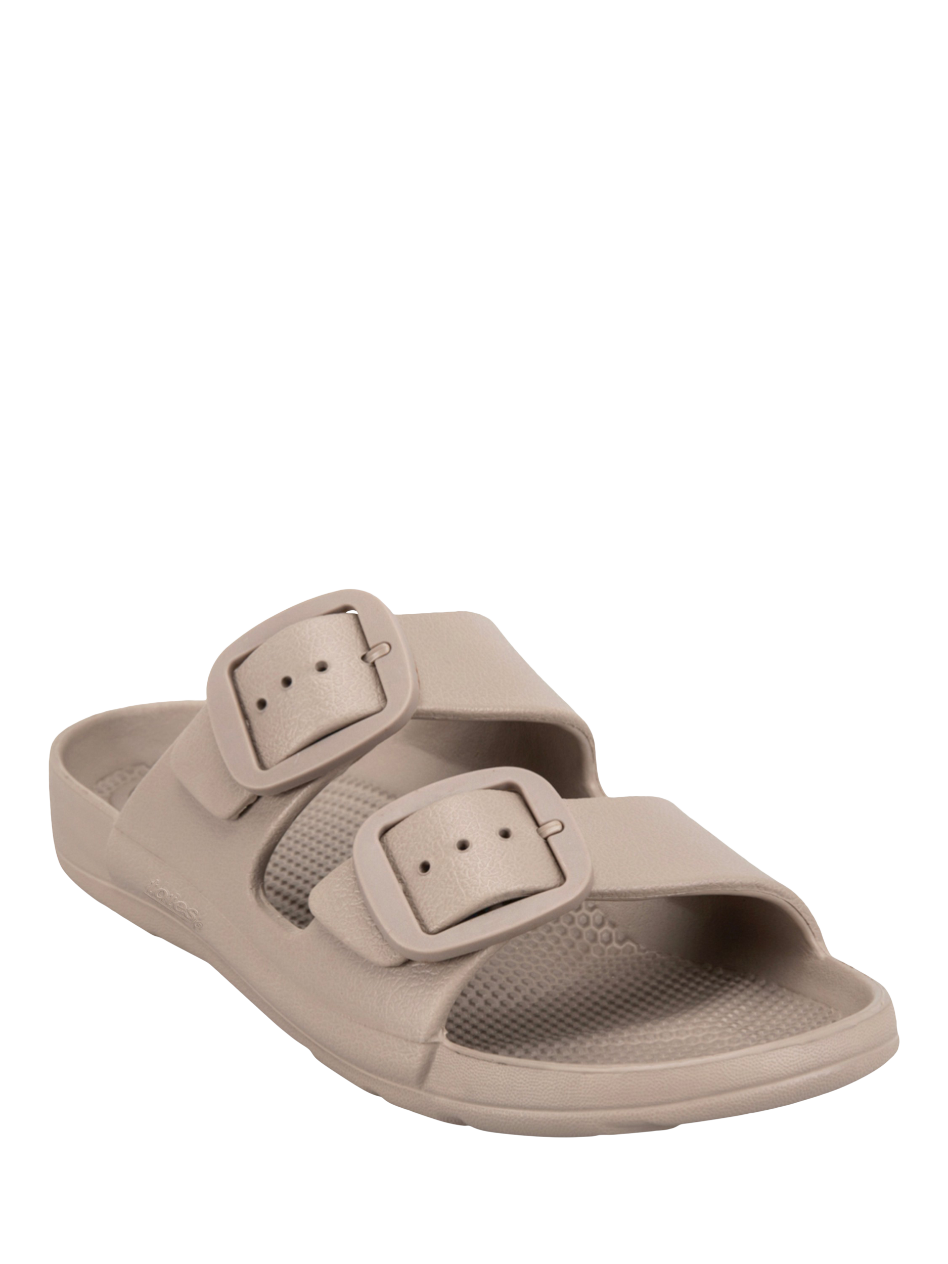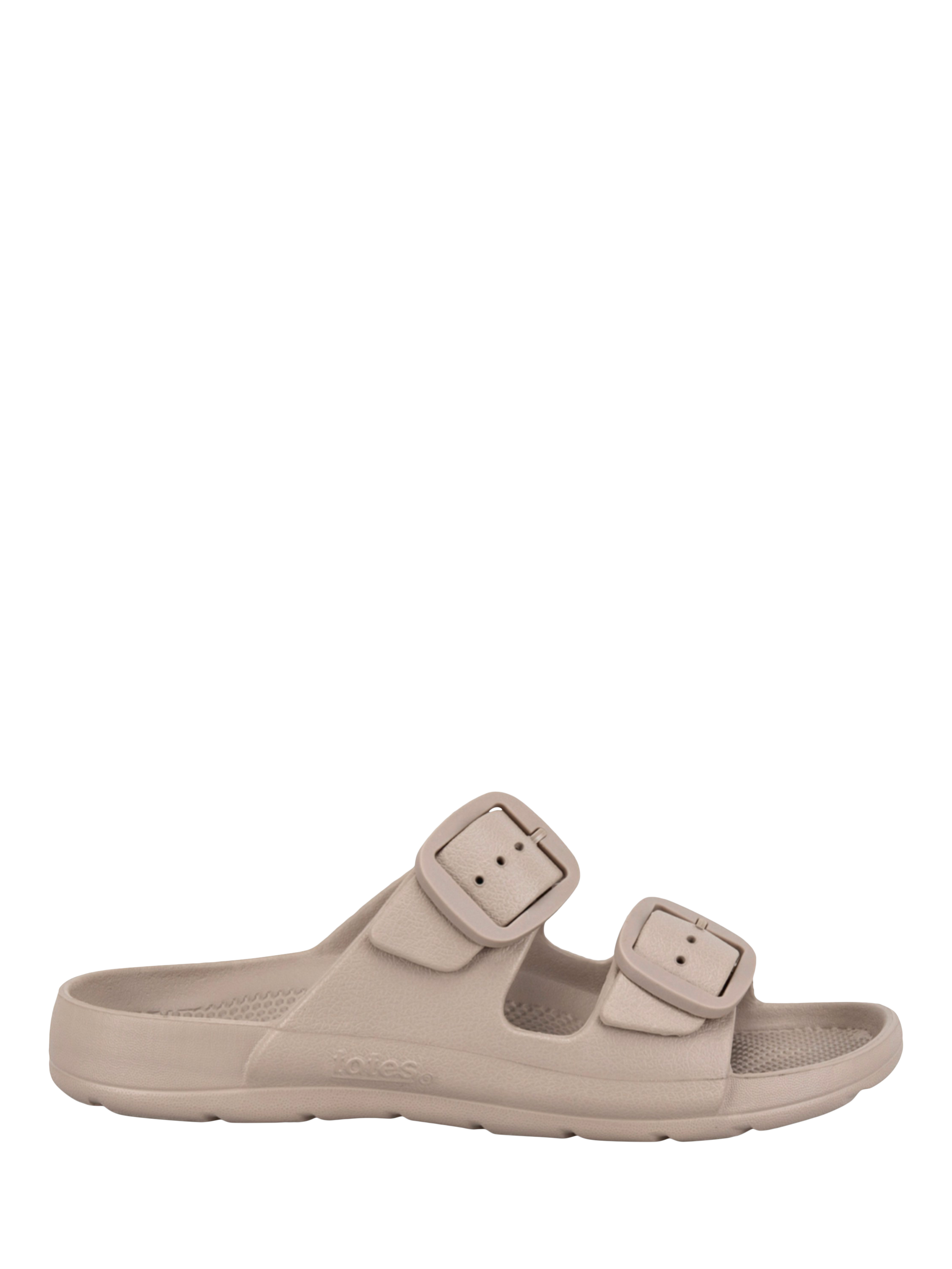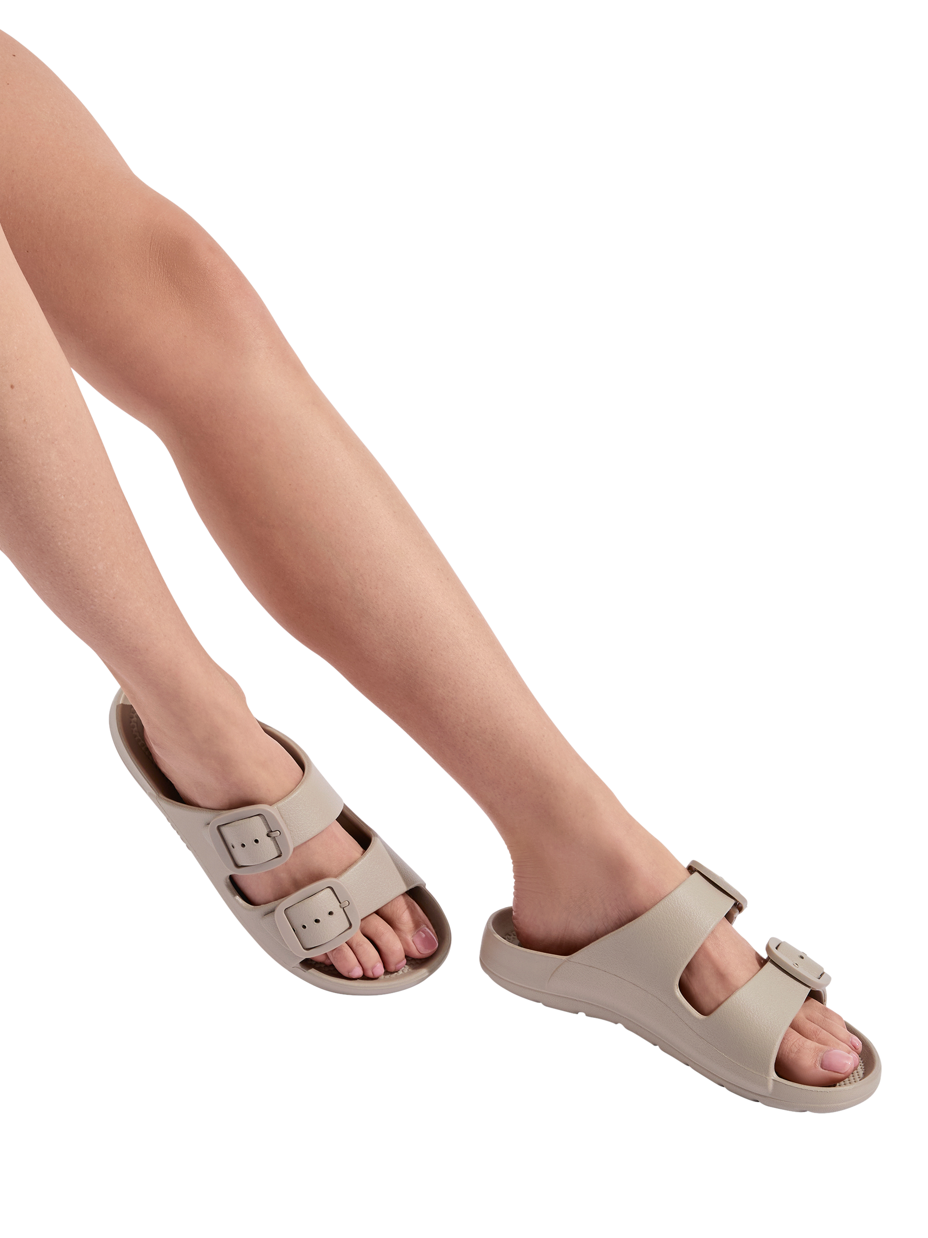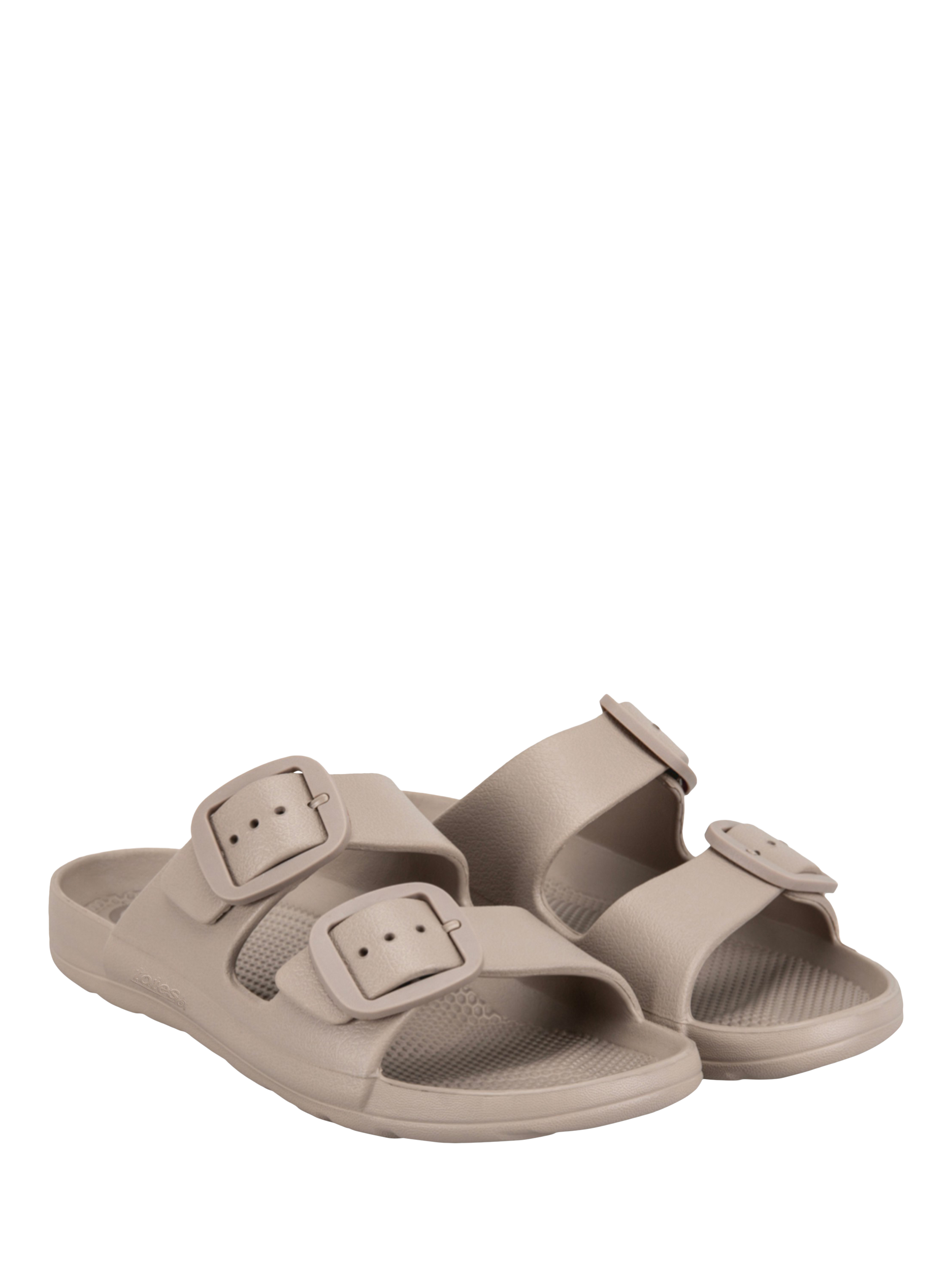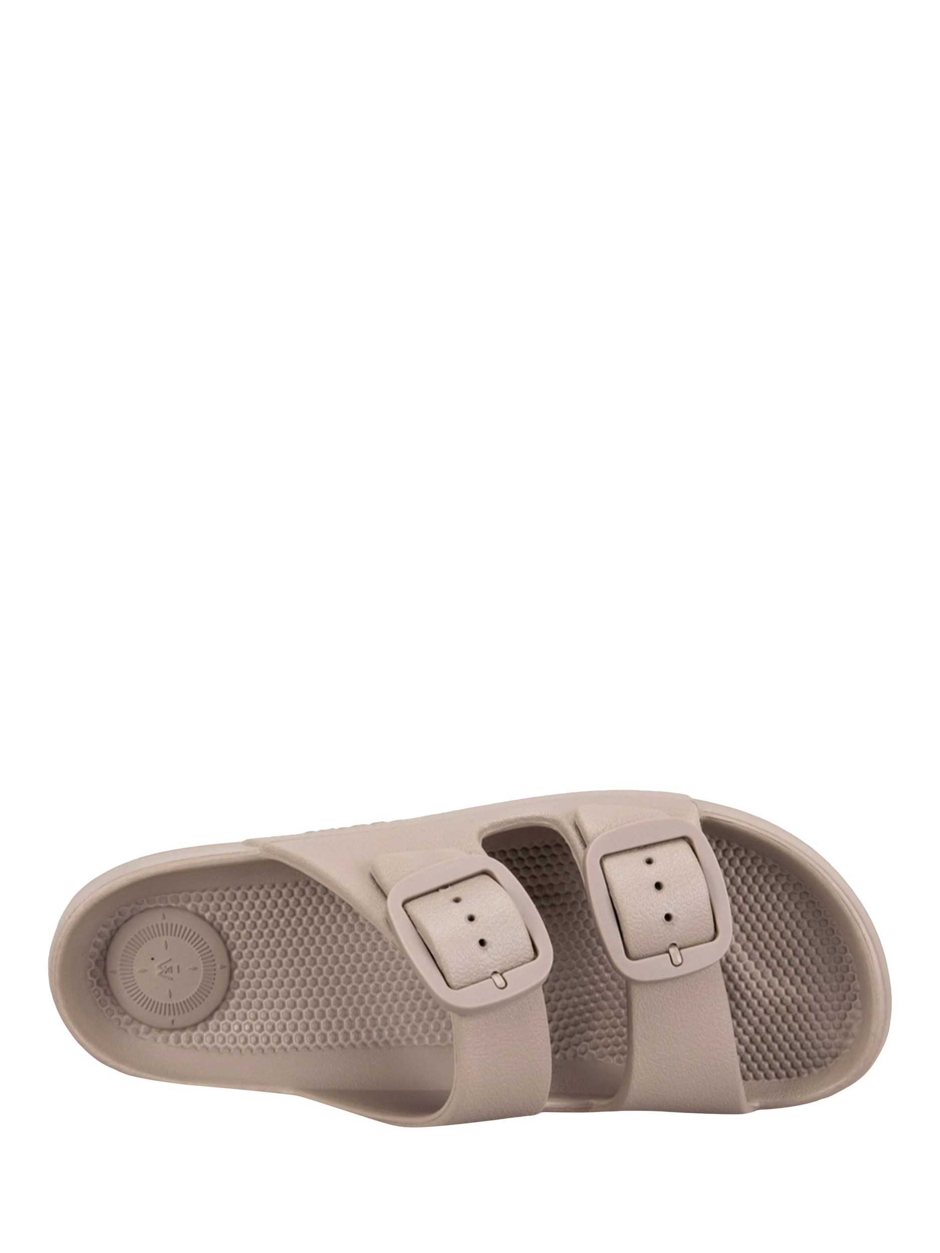 Whether you're on the beach, cruising the seven seas, or just need to slip those heels off for a bit, this adjustable slide featuring stylish, double-colour-matched, rounded buckles is just the job. Show off that perfect pedicure and coordinate with all your summer outfits.