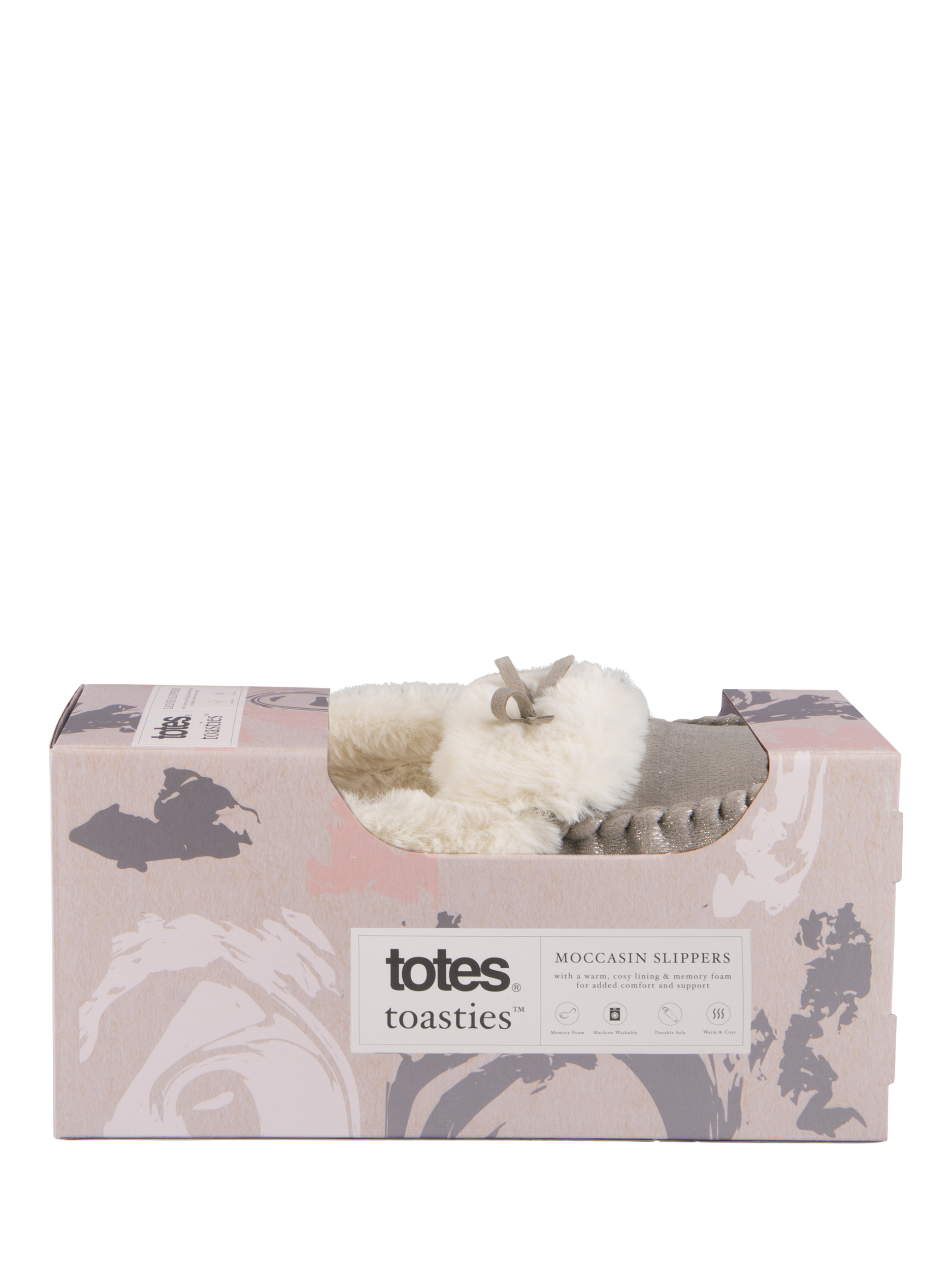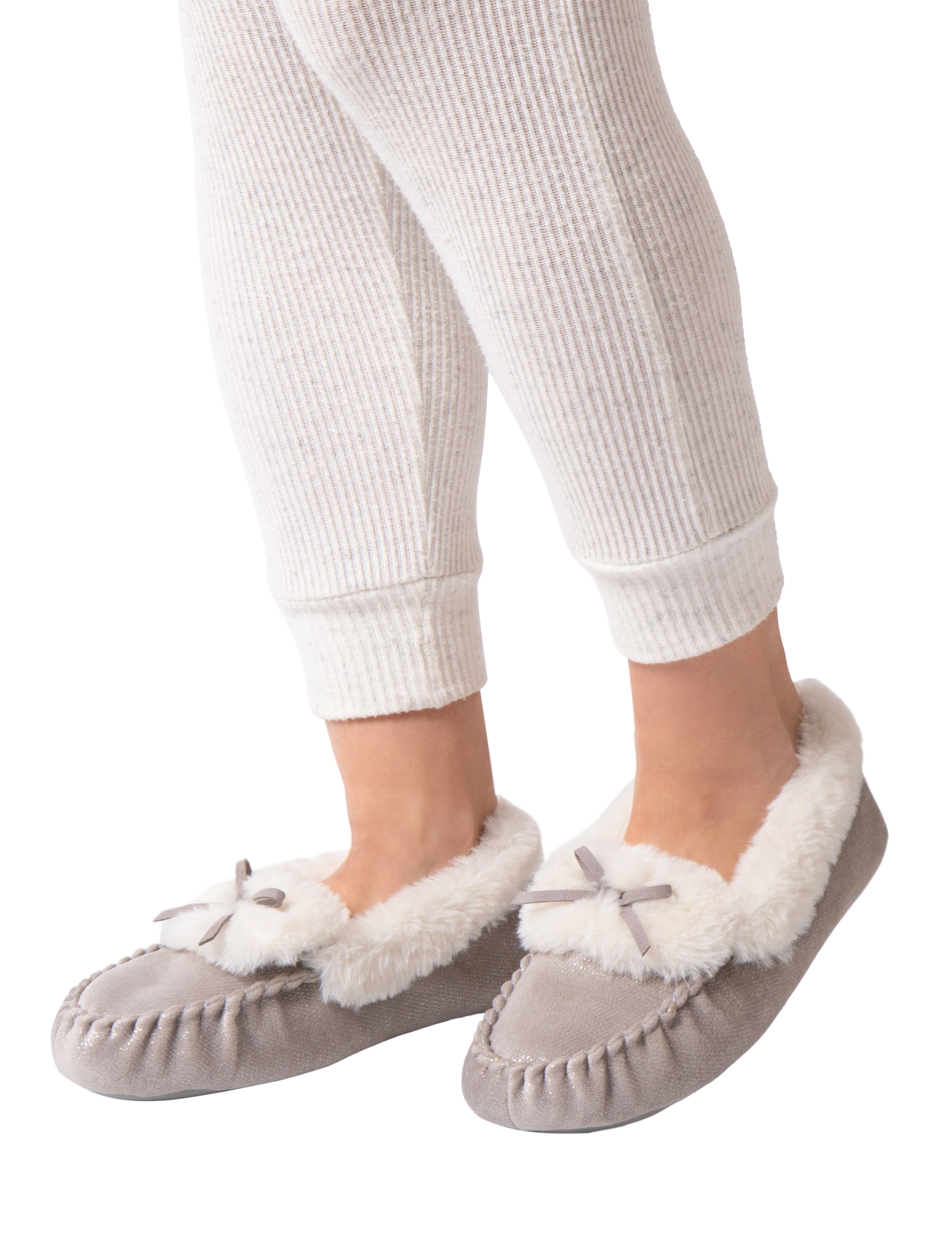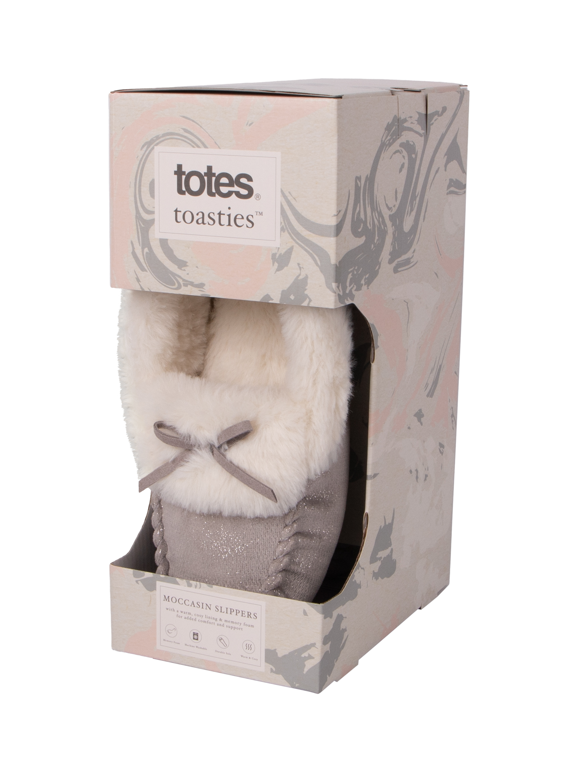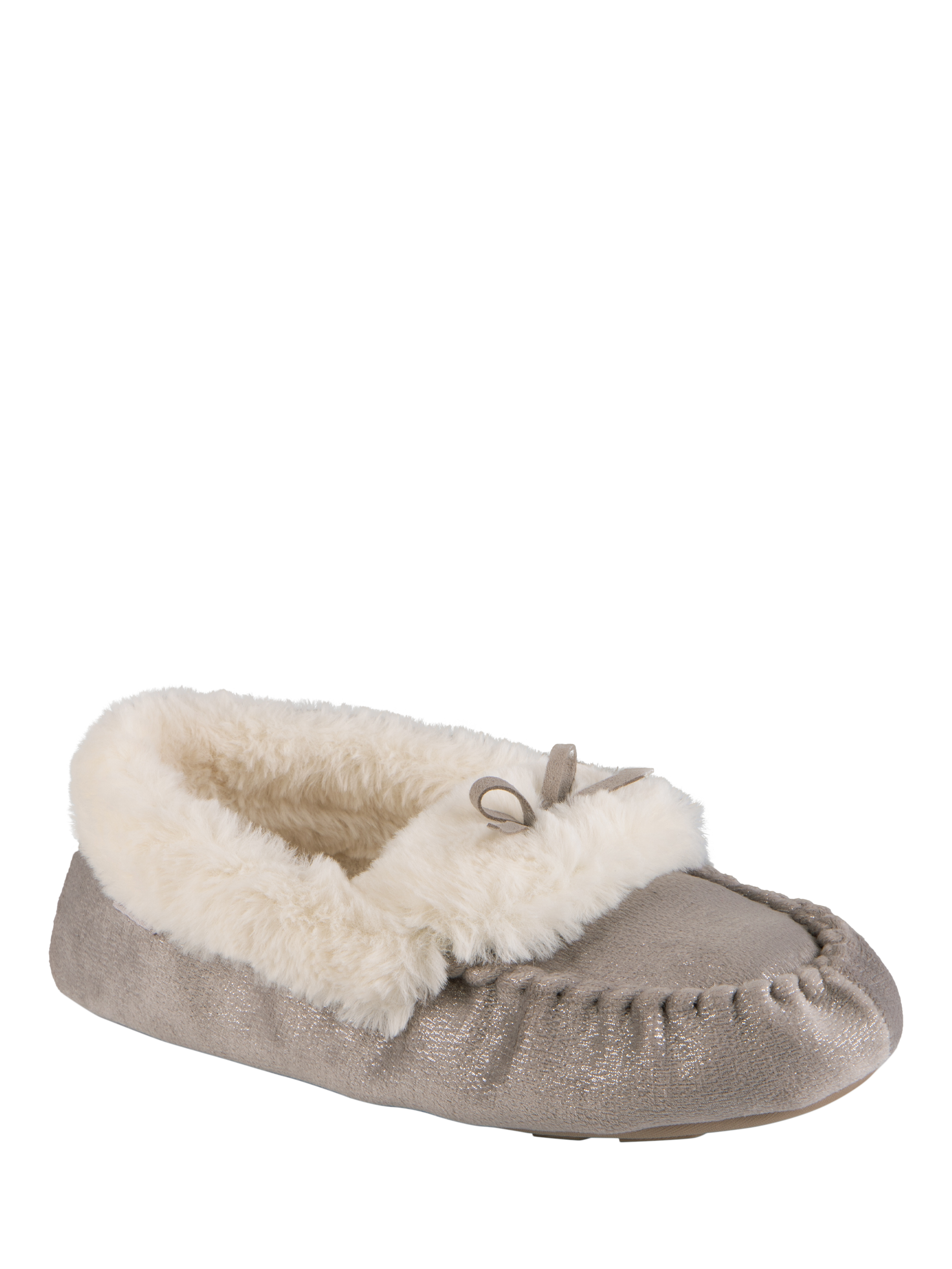 Everyone loves a little sparkle, and these cosy moccasin slippers deliver on both style and dazzle. Featuring a classic tie trim and a warm faux fur lining, they're the perfect pick-me-up. They also come equipped with memory foam for comfort and a textile TPR sole for durability. Plus, they're beautifully packaged, making them an ideal gift choice.