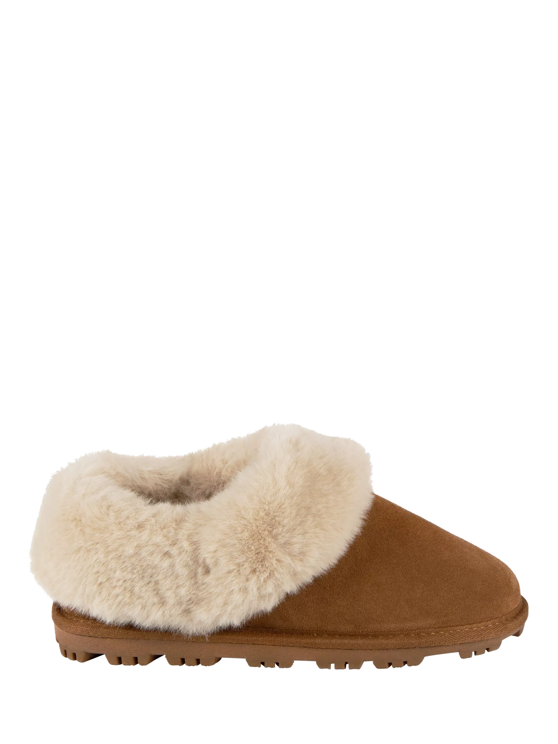 totes' suede bootie combine luxury with practicality, featuring a faux fur cuff and lining for warmth and cosiness. In a classic chestnut shade with a durable chunky sole, it offers both fashion and functionality. Designed with genuine suede in a bootie style, it includes a Pillowstep® tufted insole for unique underfoot cushioning, memory foam for comfort, and an ultra comfort foam layer, ensuring every step is stylish and comfortable.