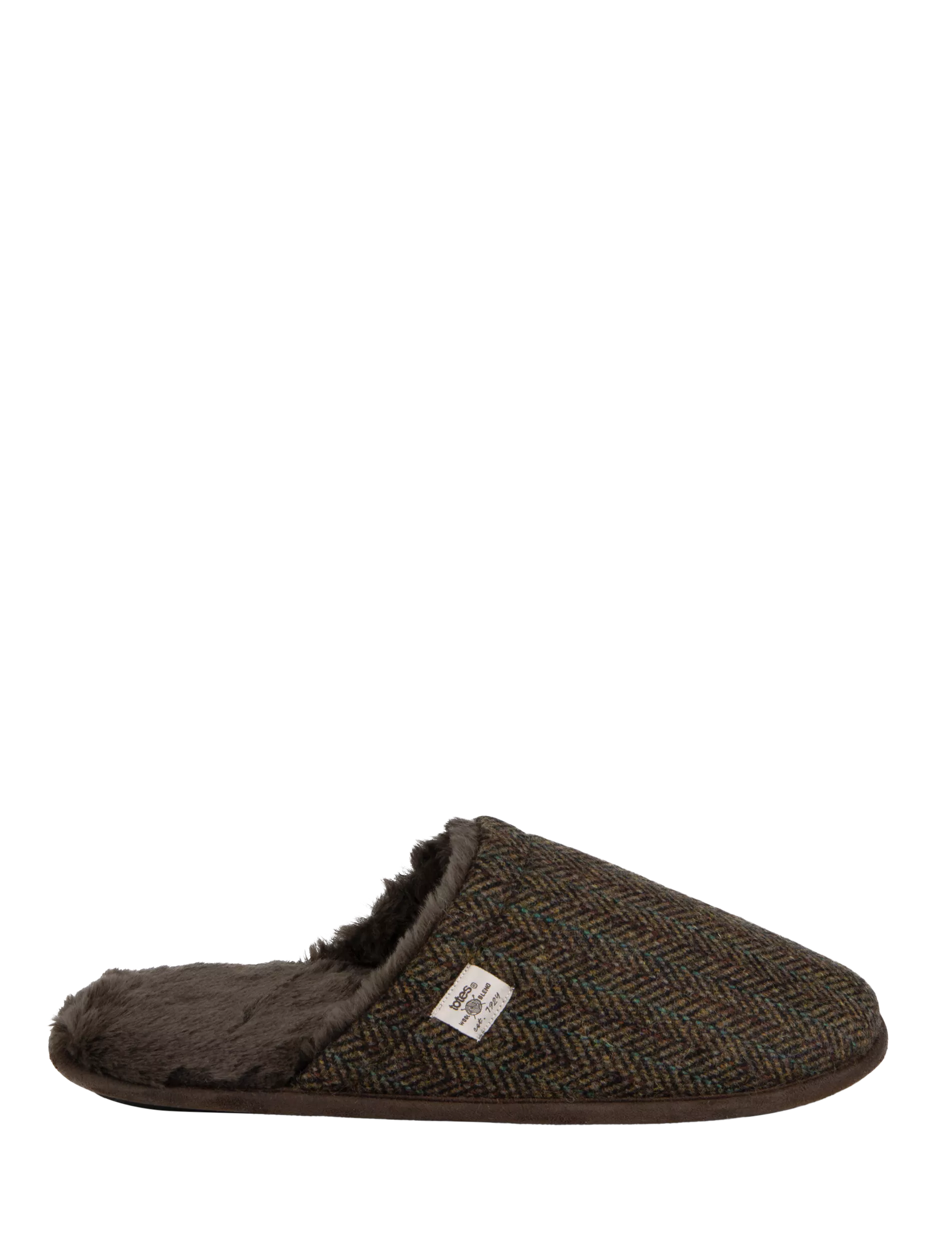 Introducing totes' easy-wear woven wool mix mule slippers, featuring a versatile brown herringbone design that complements any outfit. These slippers boast a warm lining and added memory foam for ultimate comfort and cosiness. The check pattern inside and faux fur lining enhance their snug feel, while the textile TPR sole ensures durability. Beautifully packaged, they make the perfect gift for any occasion. Experience the luxury of these woven wool mix mule slippers, designed for both style and comfort. Beautifully packaged for the perfect gift.
