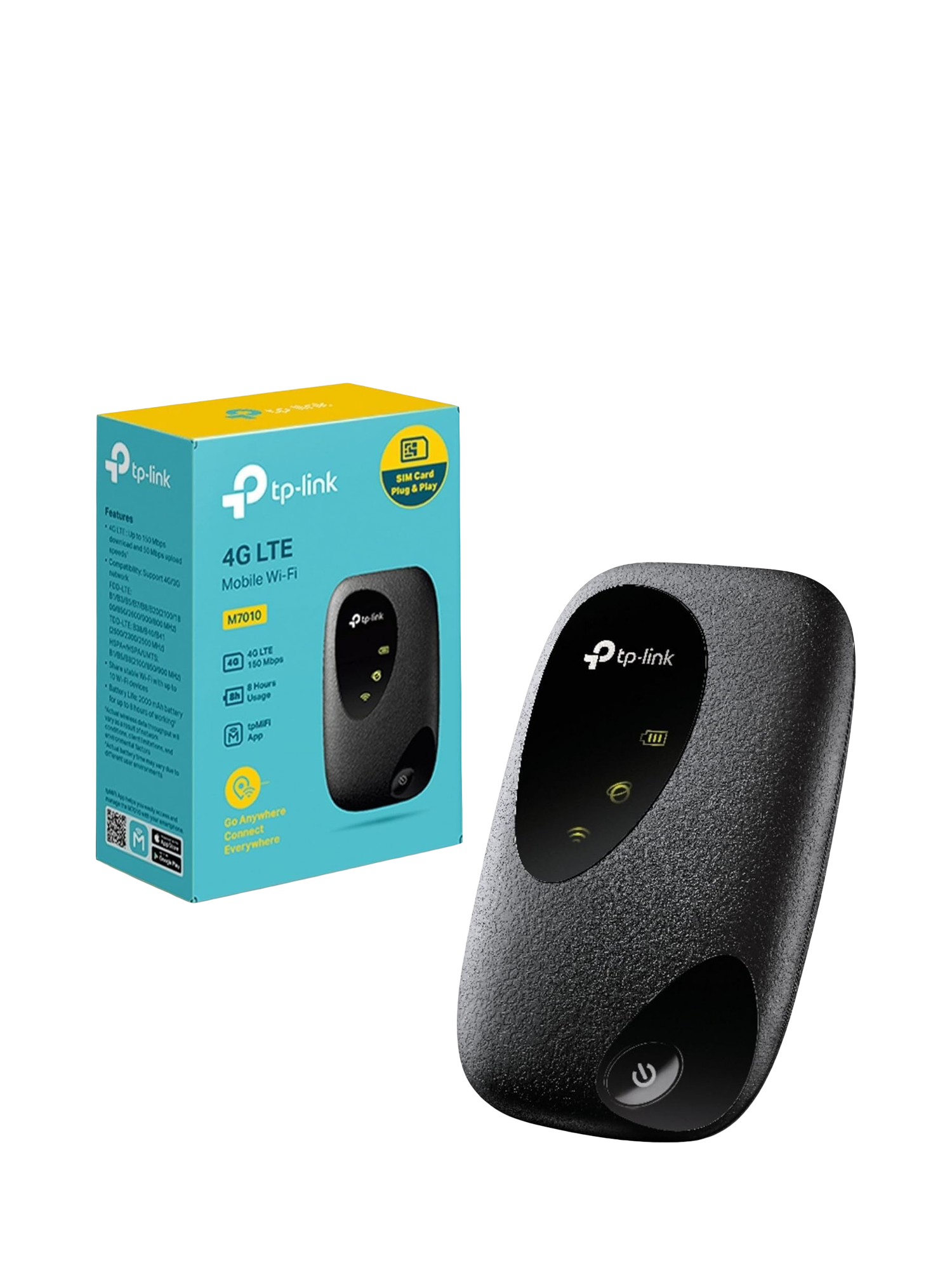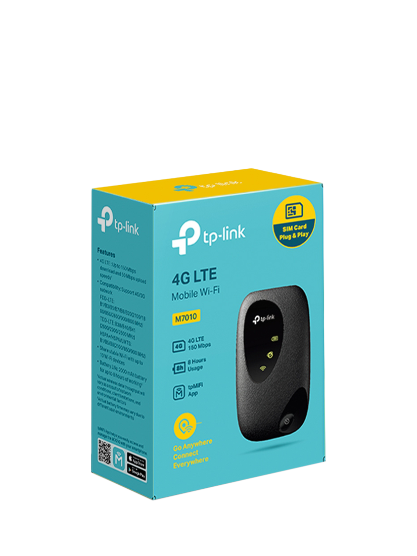 TP-Link M7010 is a compact 4G LTE mobile Wi-Fi hotspot that uses a SIM card to create internet access for up to 10 devices, with speeds up to 150 Mbps and up to 8 hours of battery life.