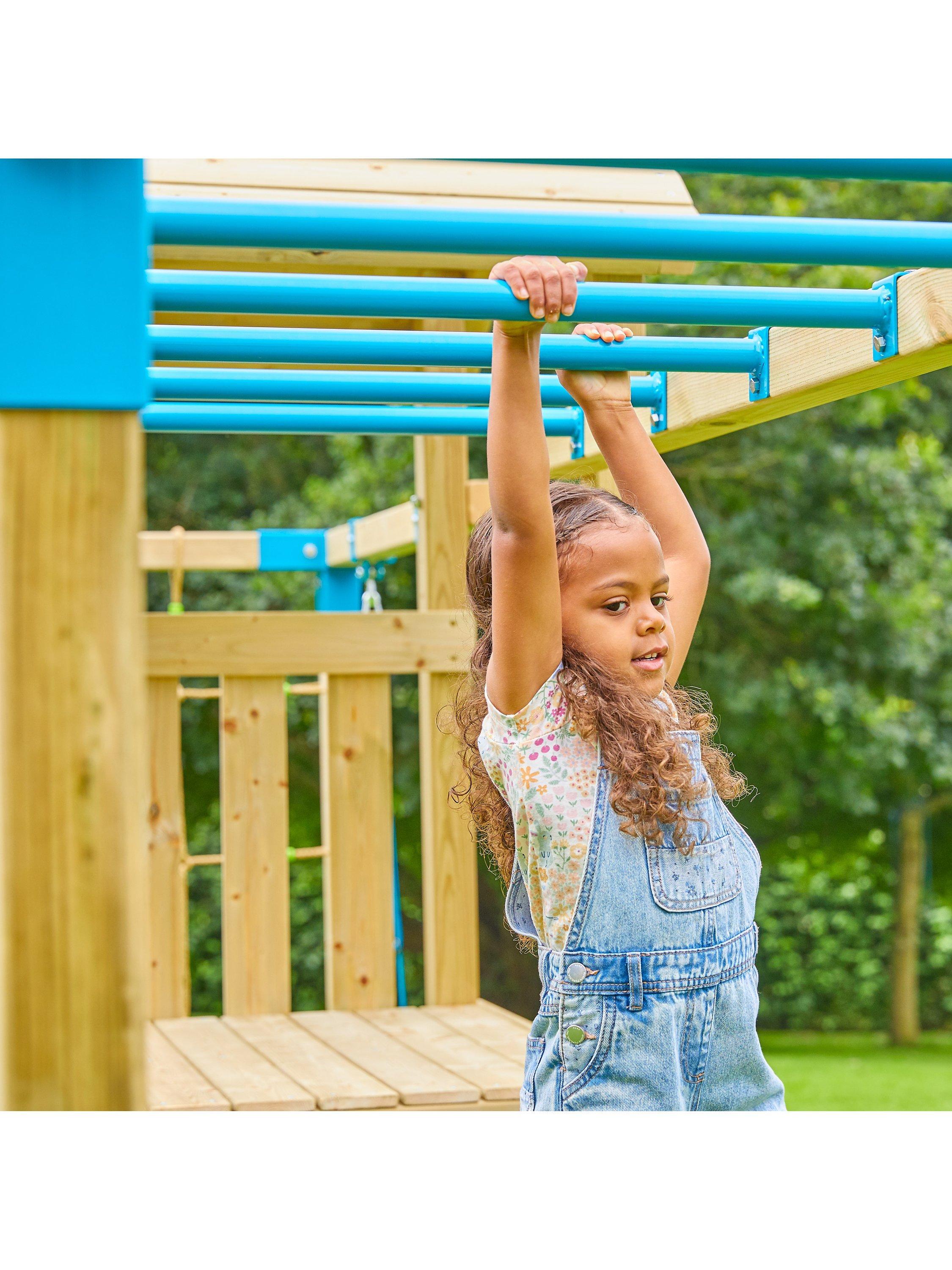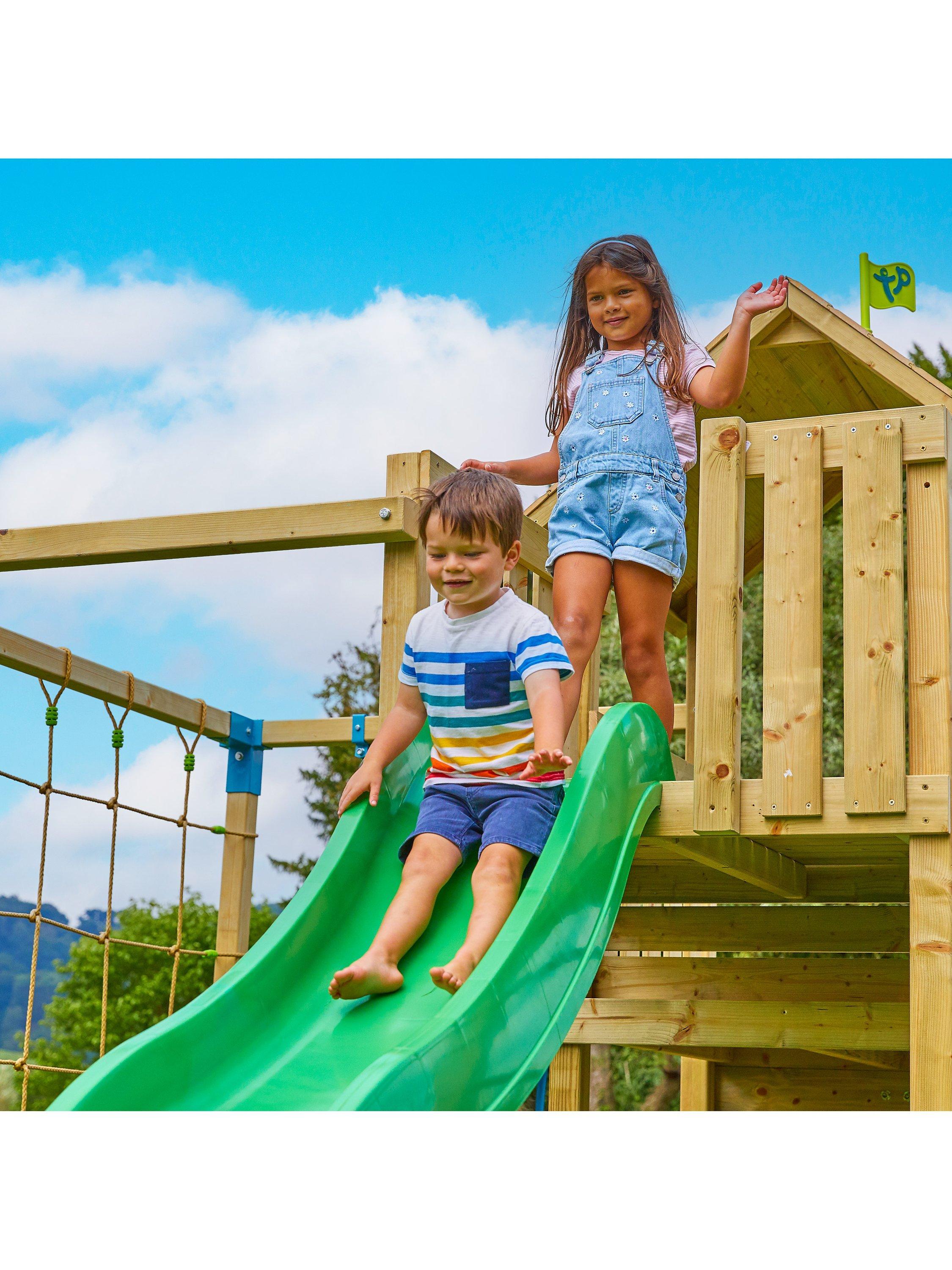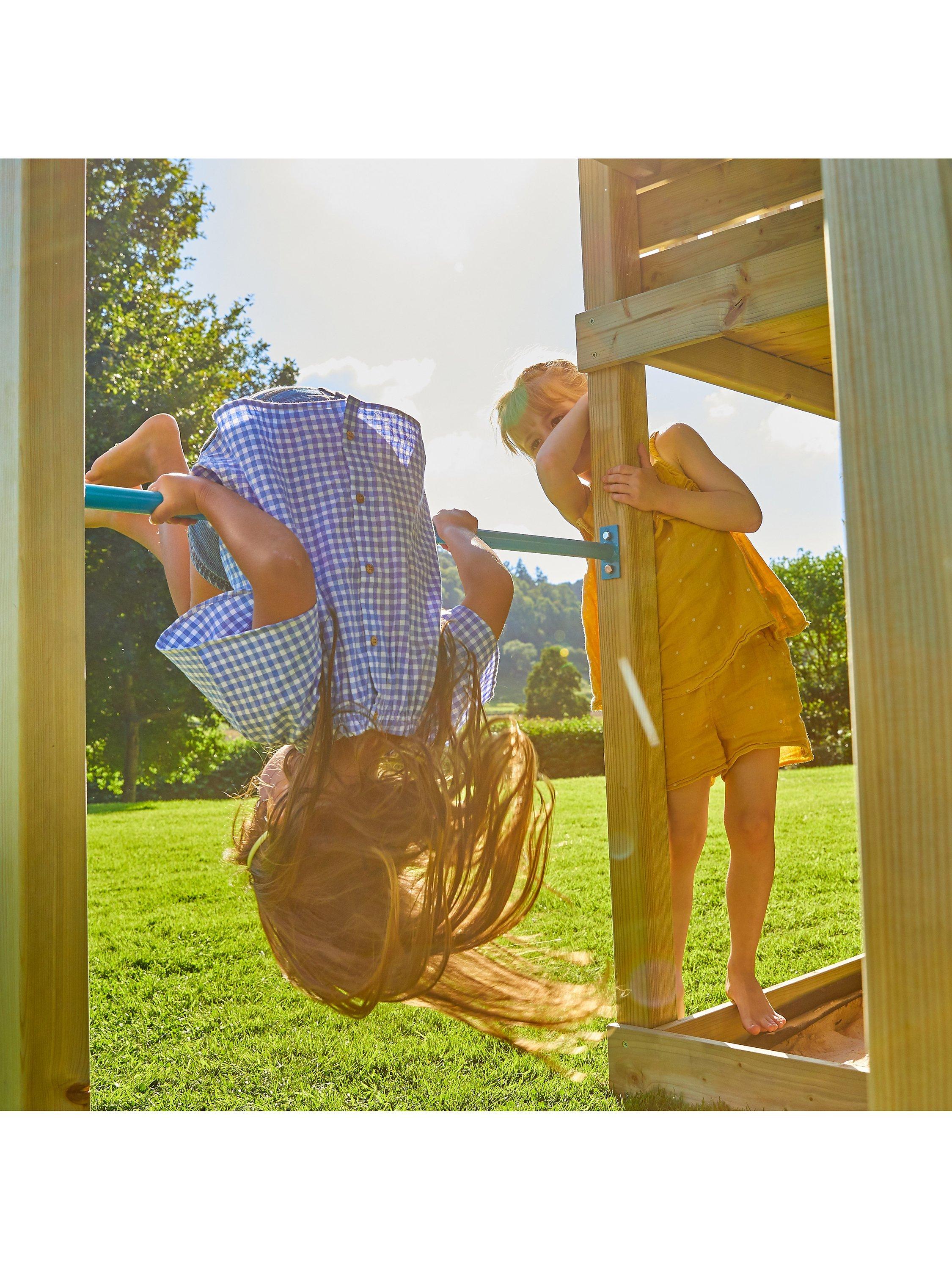 The Skywood Play Tower takes centre stage! It features a 1.2m high platform accessible by a ladder or via the climbing wall. There is also an exciting shaded sandpit area for creative play and the 8ft slide adds to the playground paradise. The capacity for fun is extended thanks to the Sky Deck, which is designed to seamlessly integrate with the Skywood Play Tower.