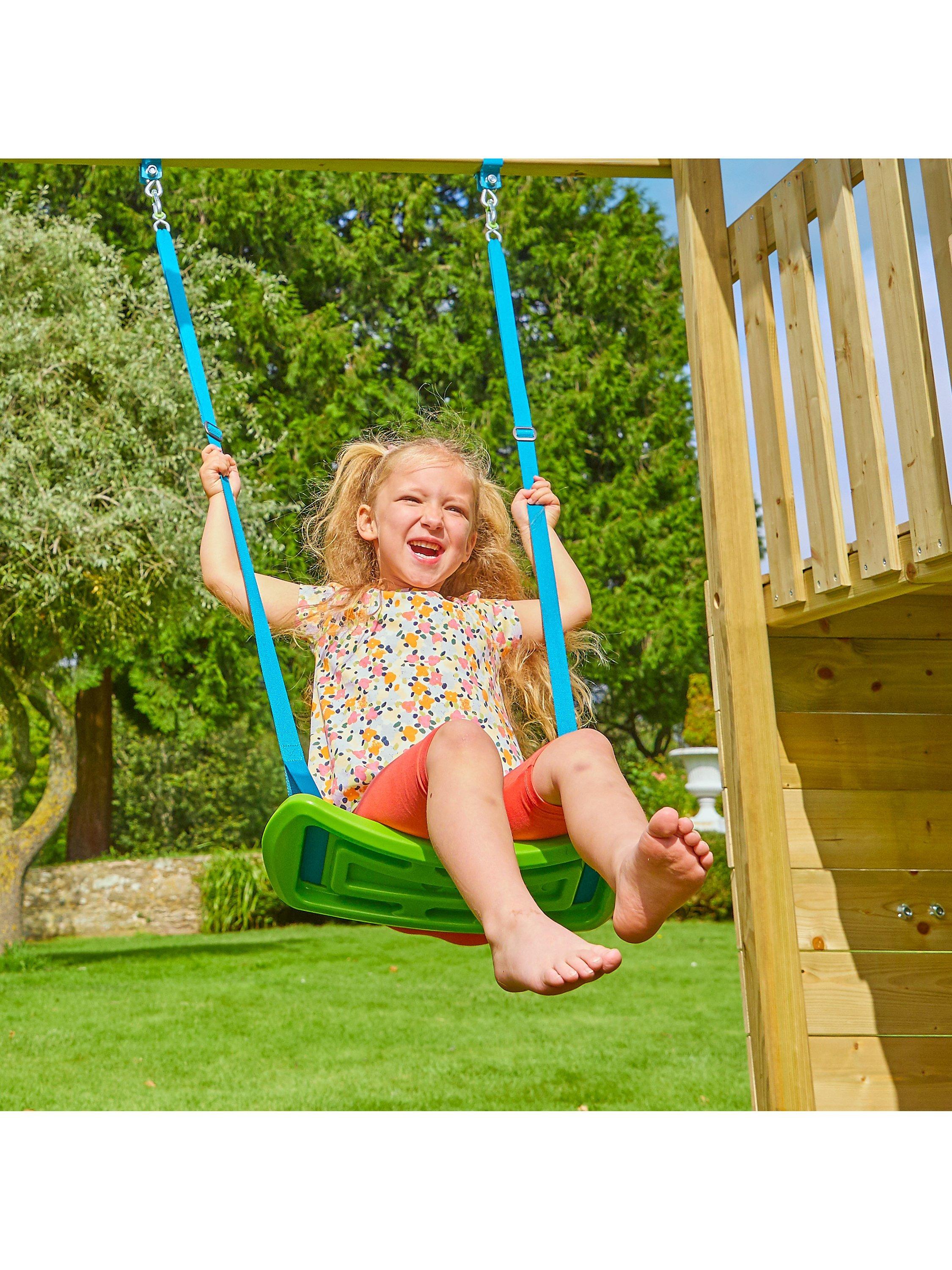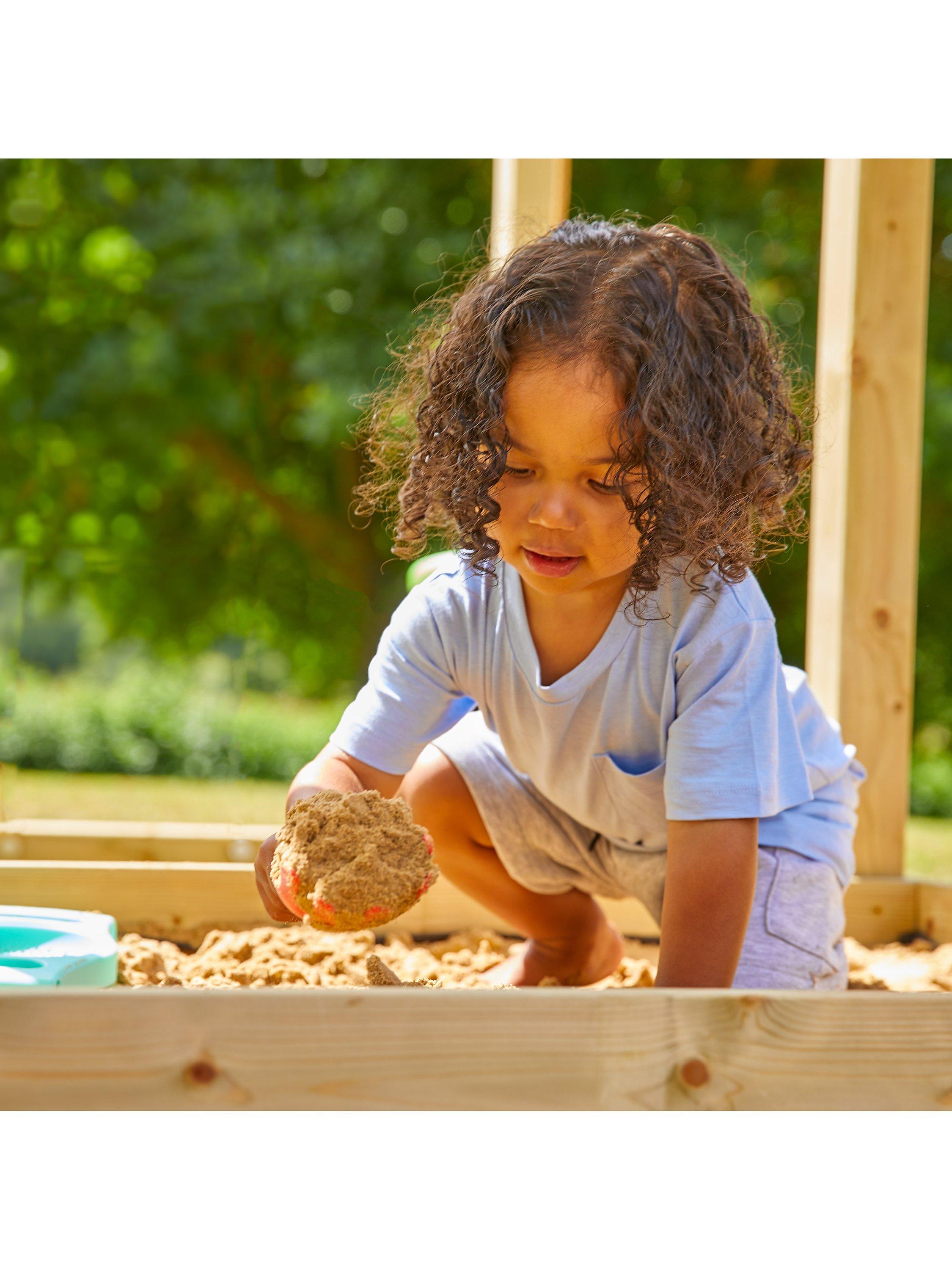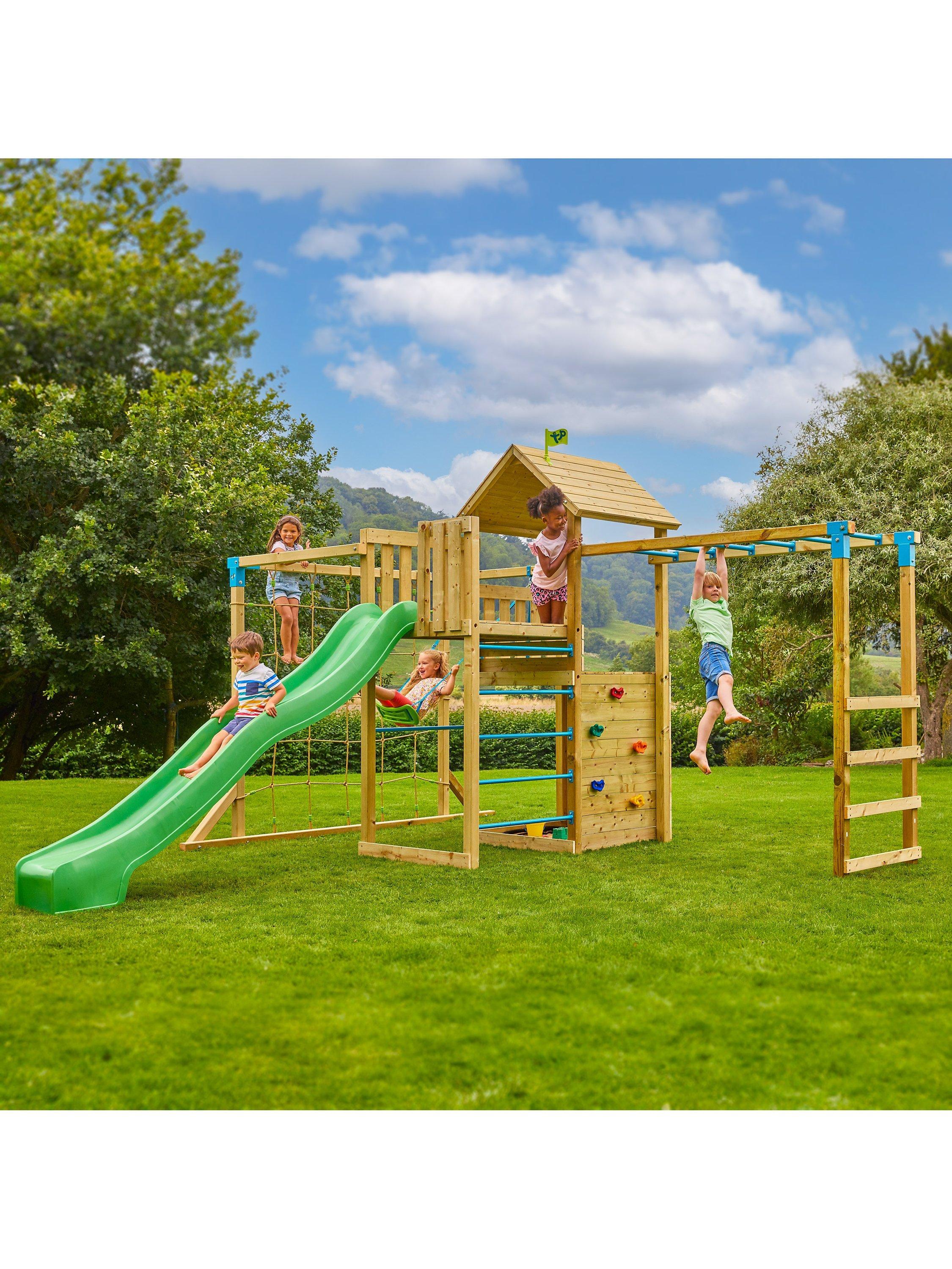 The Skywood Play Tower takes centre stage! It features a 1.2m high platform accessible by a ladder or via the climbing wall. There is also an exciting shaded sandpit area for creative play and the 8ft slide adds to the playground paradise. The capacity for fun is extended thanks to the Sky Deck, which is designed to seamlessly integrate with the Skywood Play Tower.