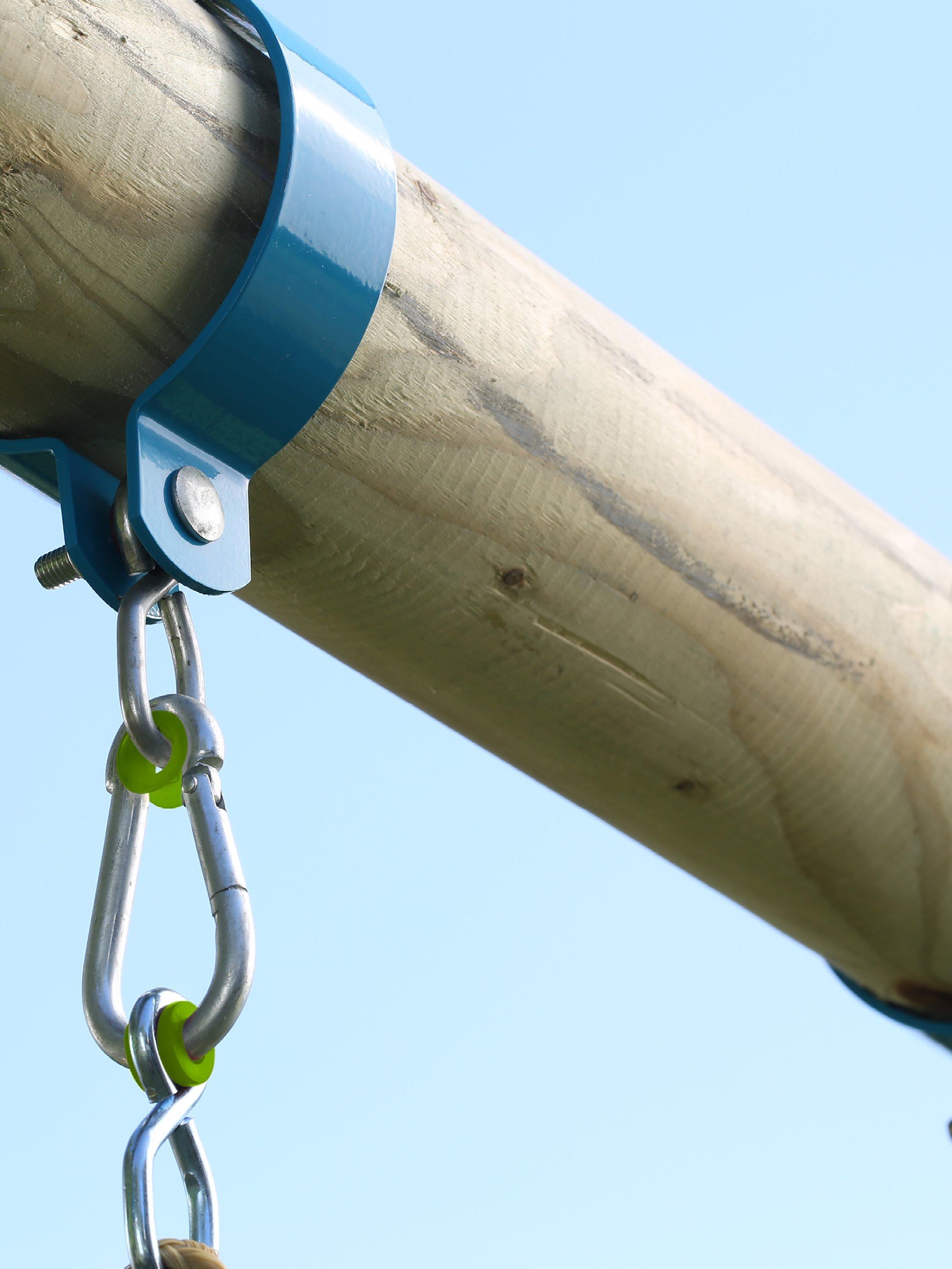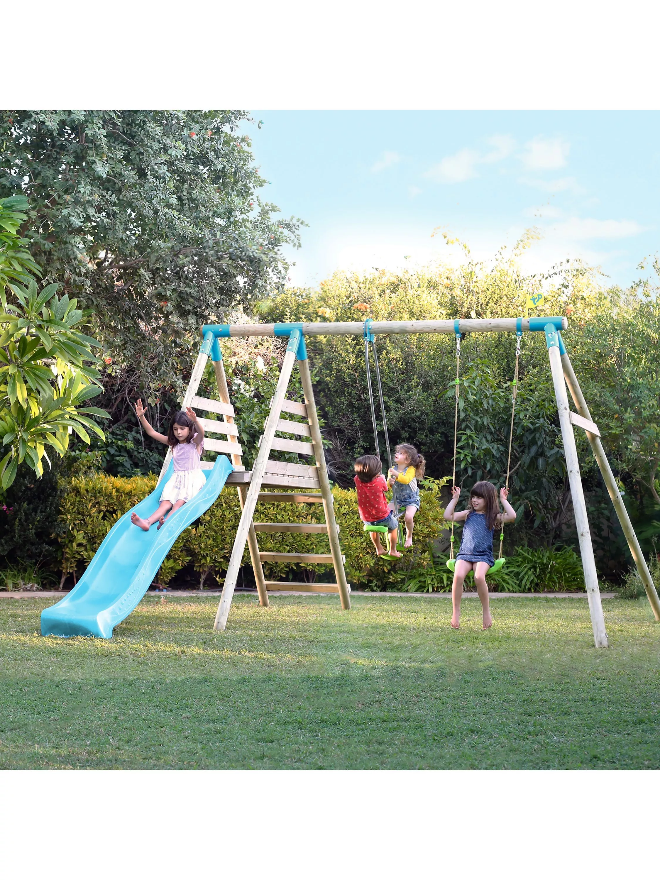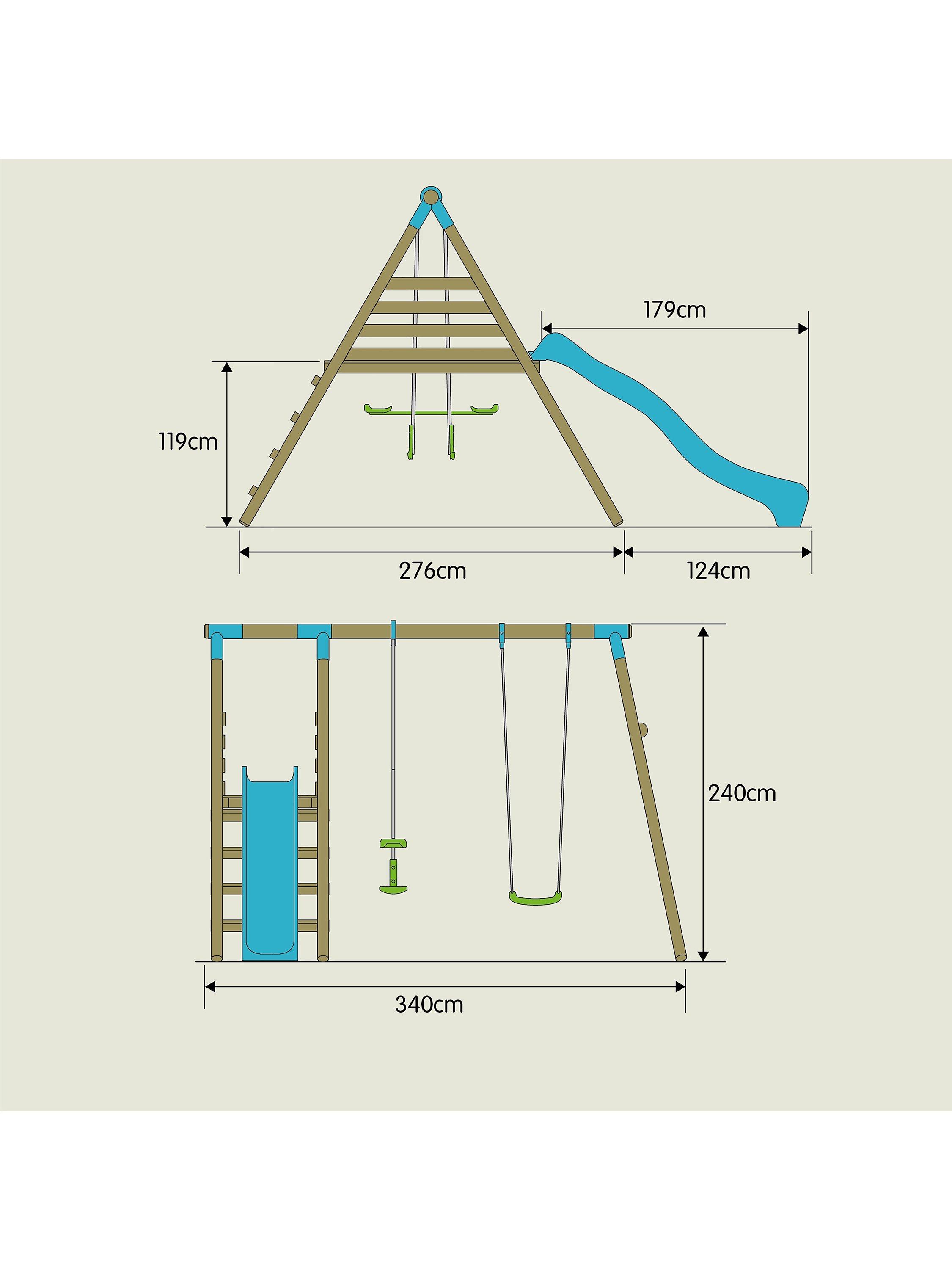 Rugged and rustic, this double round wood swing frame, with a spacious climbing deck and 2.5m slide, is sold complete with two swing accessories, a fun two-seater glider and an apple green swing seat.