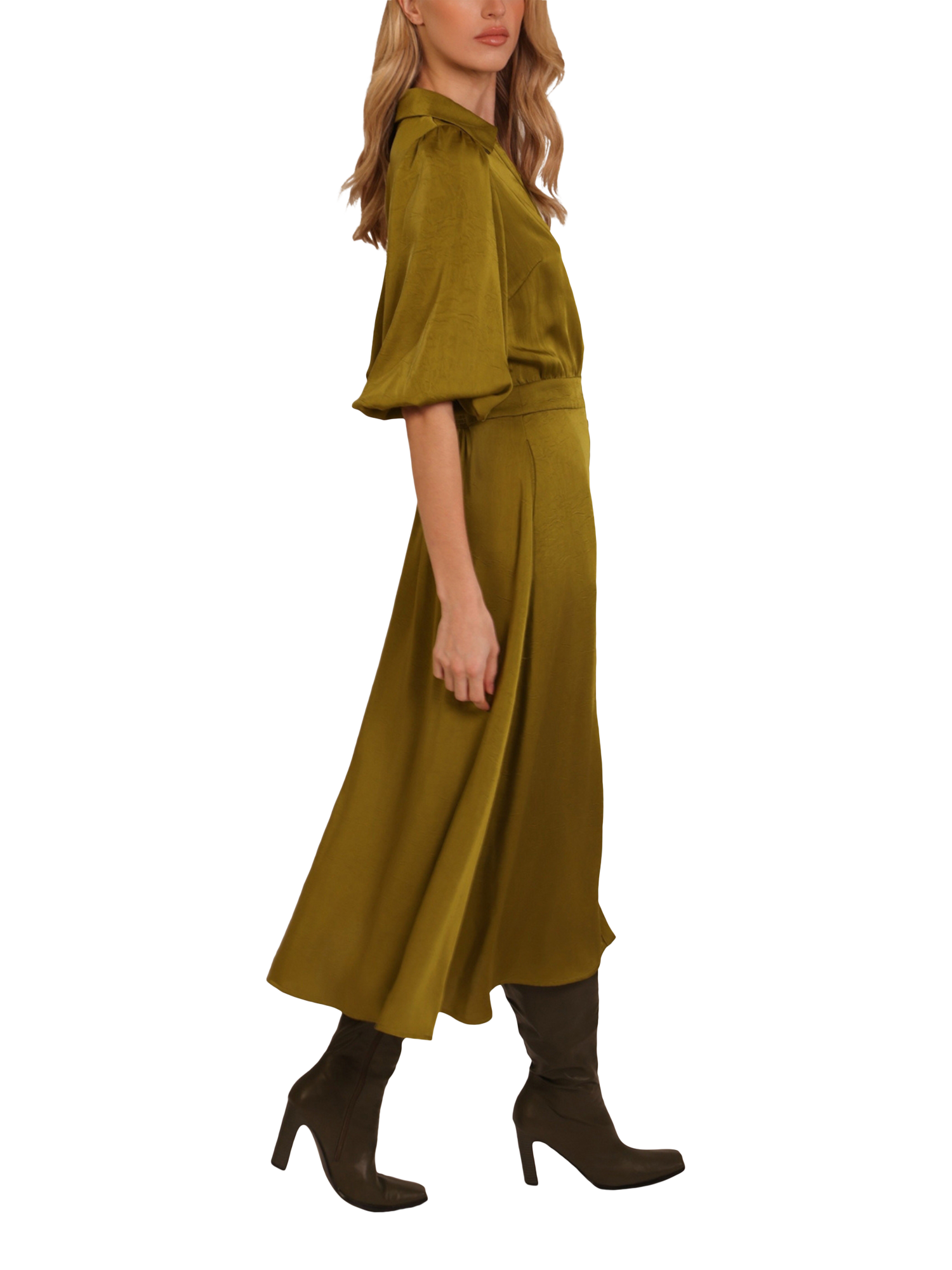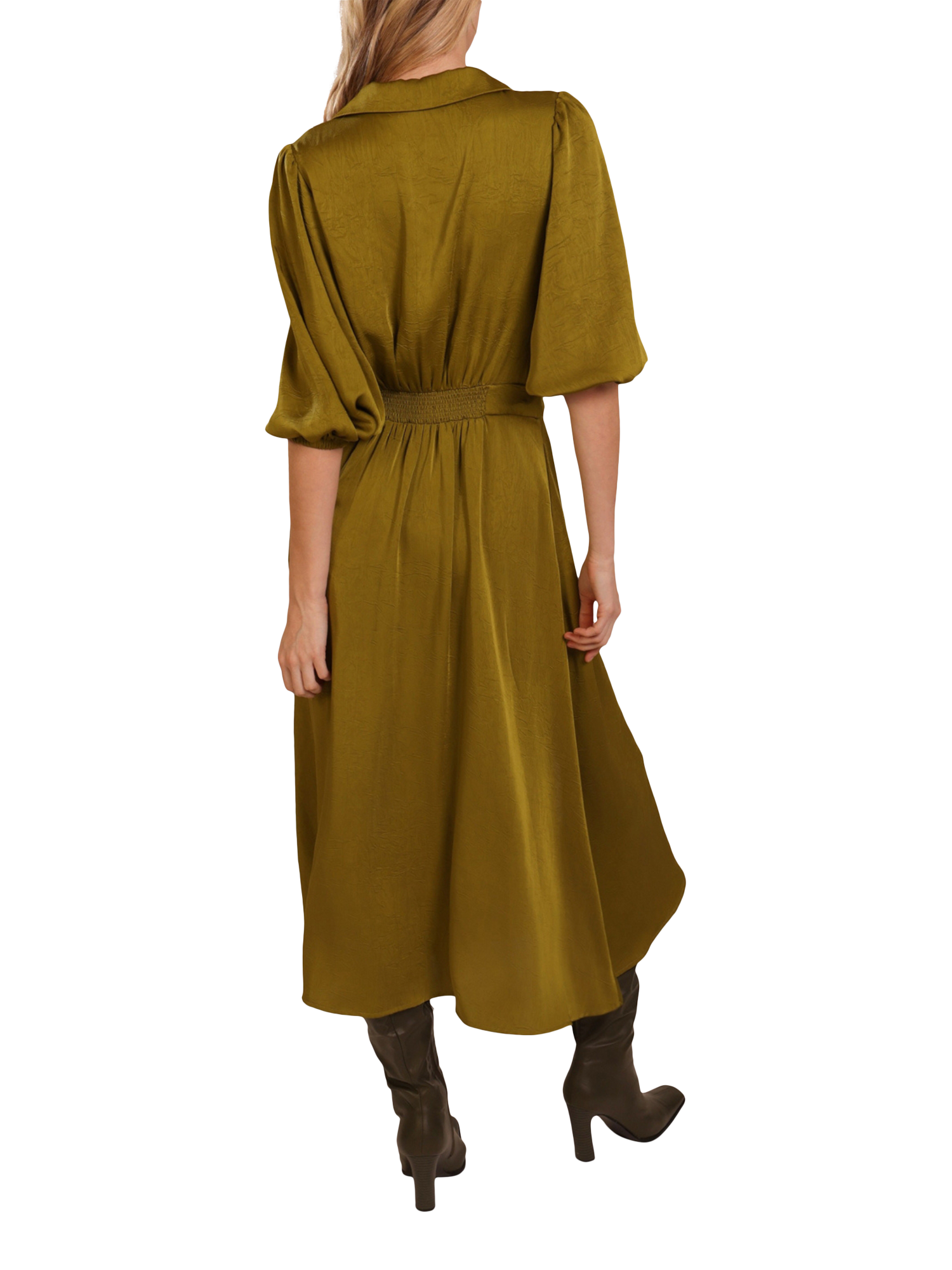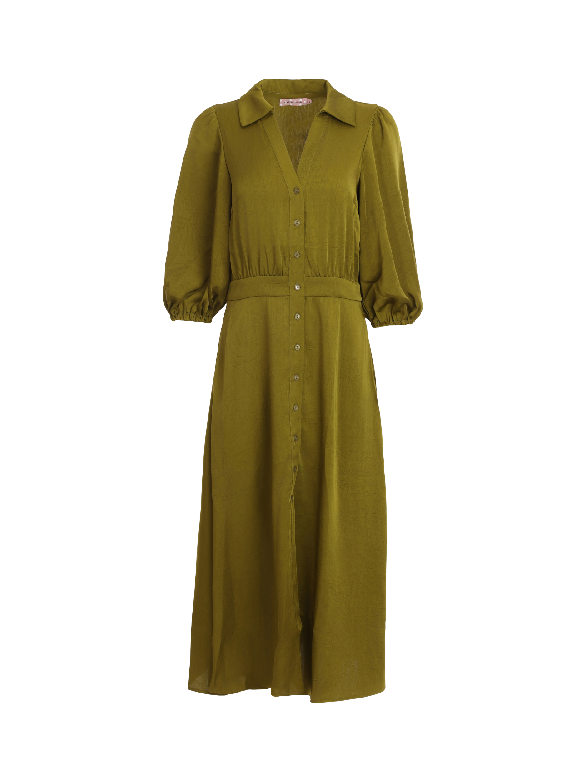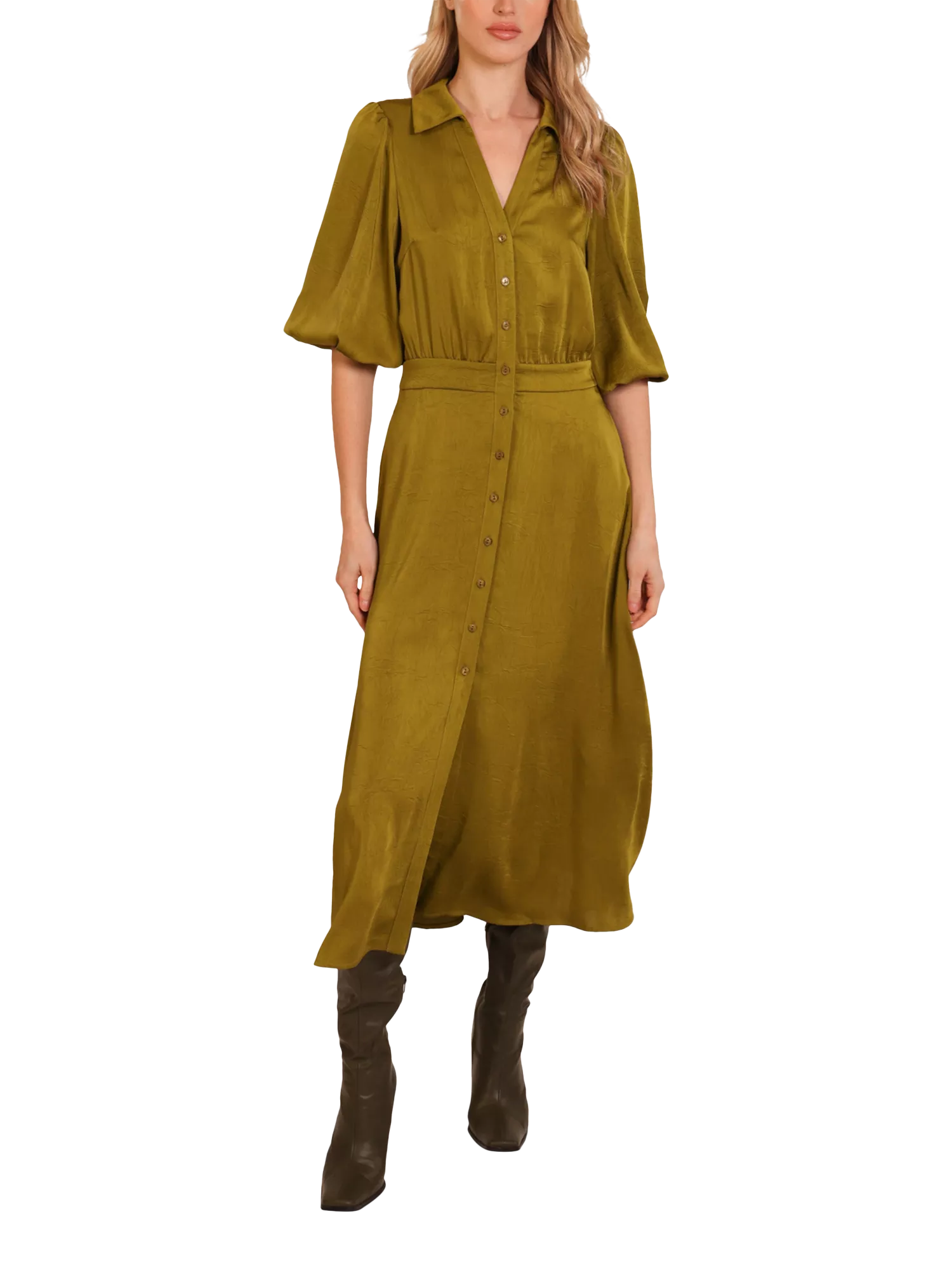 A beautiful midi dress which can easily be dressed up or down for all occasions. Featuring a V-Neck shirt collar, a button front opening, 3/4 billow sleeves, and a belt waist detail which cinches in the waist. Simply stunning in this soft olive green fabric.