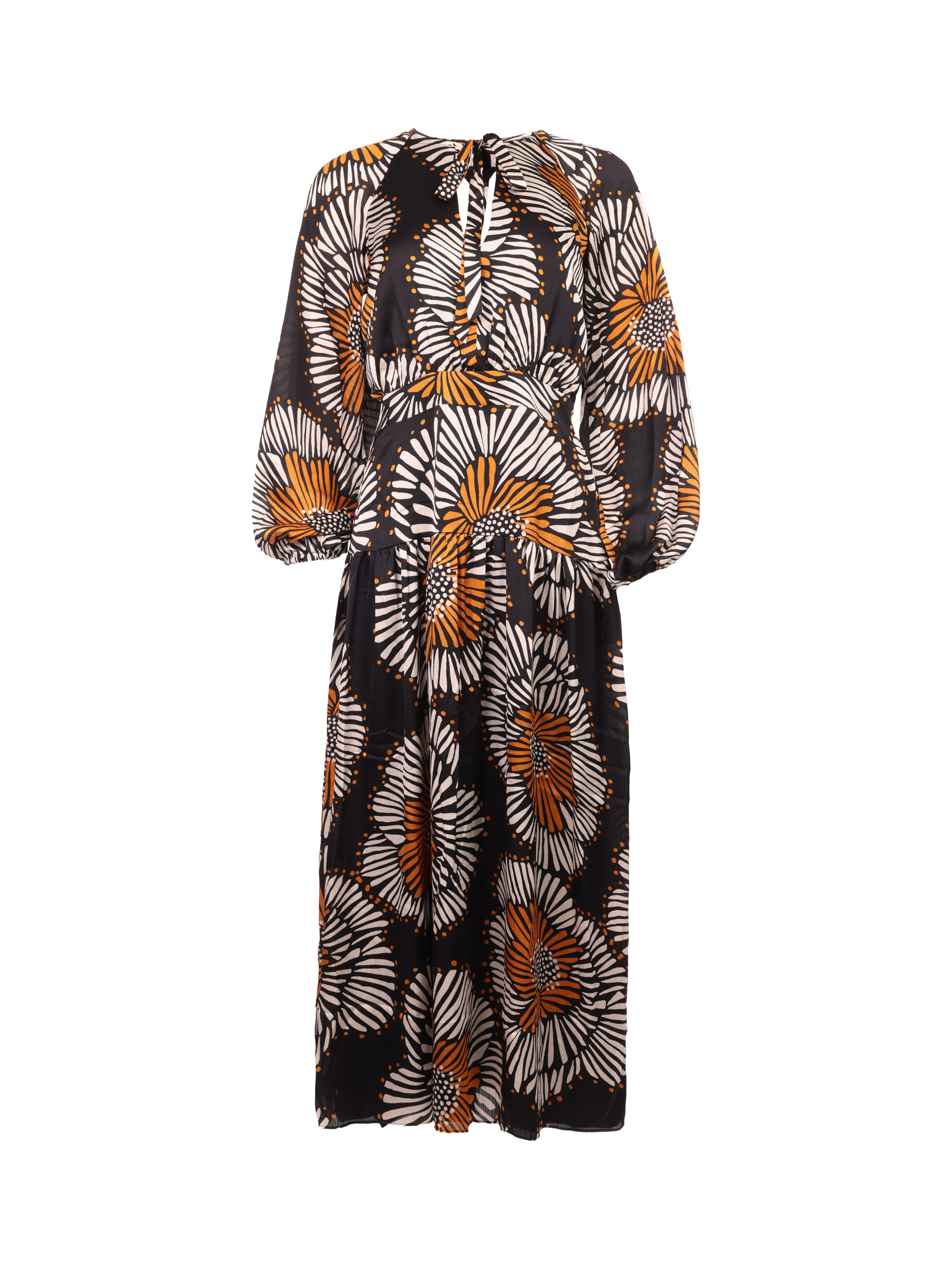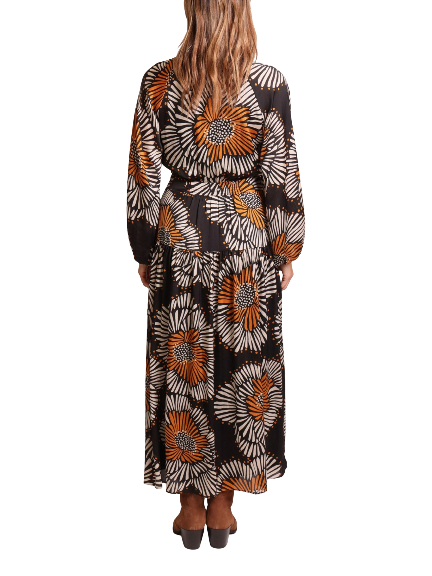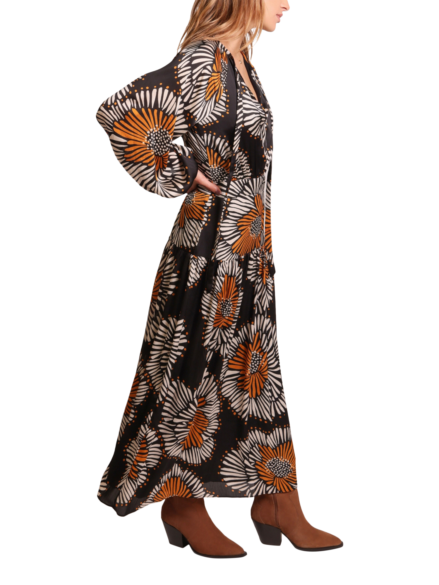 The Blame dress is a beautiful tiered hem chiffon maxi dress, with a loose fit top, voluminous skirt, and long billow sleeves with elasticated cuffs. So unique in the bold black white and orange floral print of Traffic People's Holding On fabric.