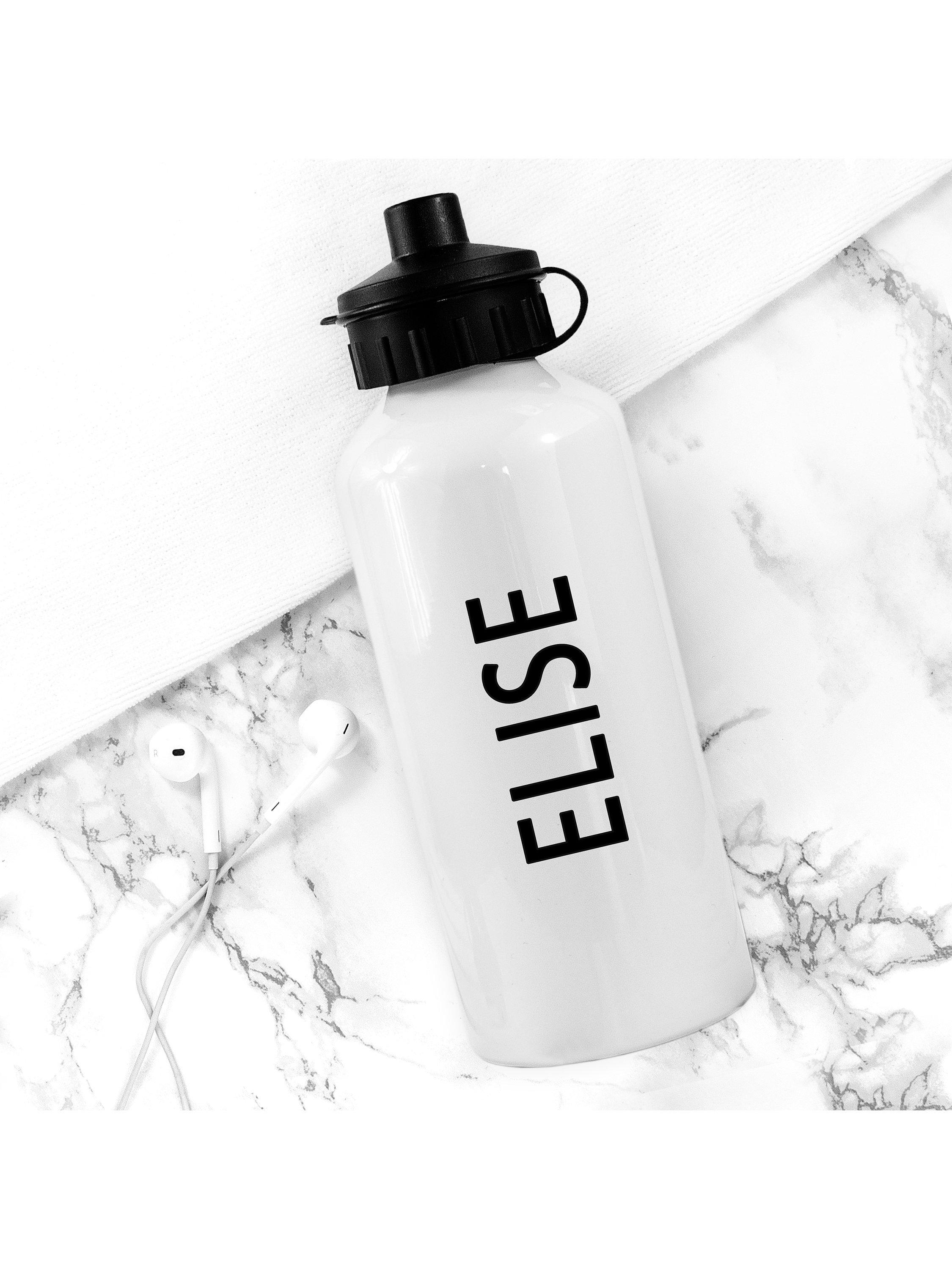 The sports bottle is made with aluminium and comes with a sports cap. It's personalised with a name on the back of the bottle.