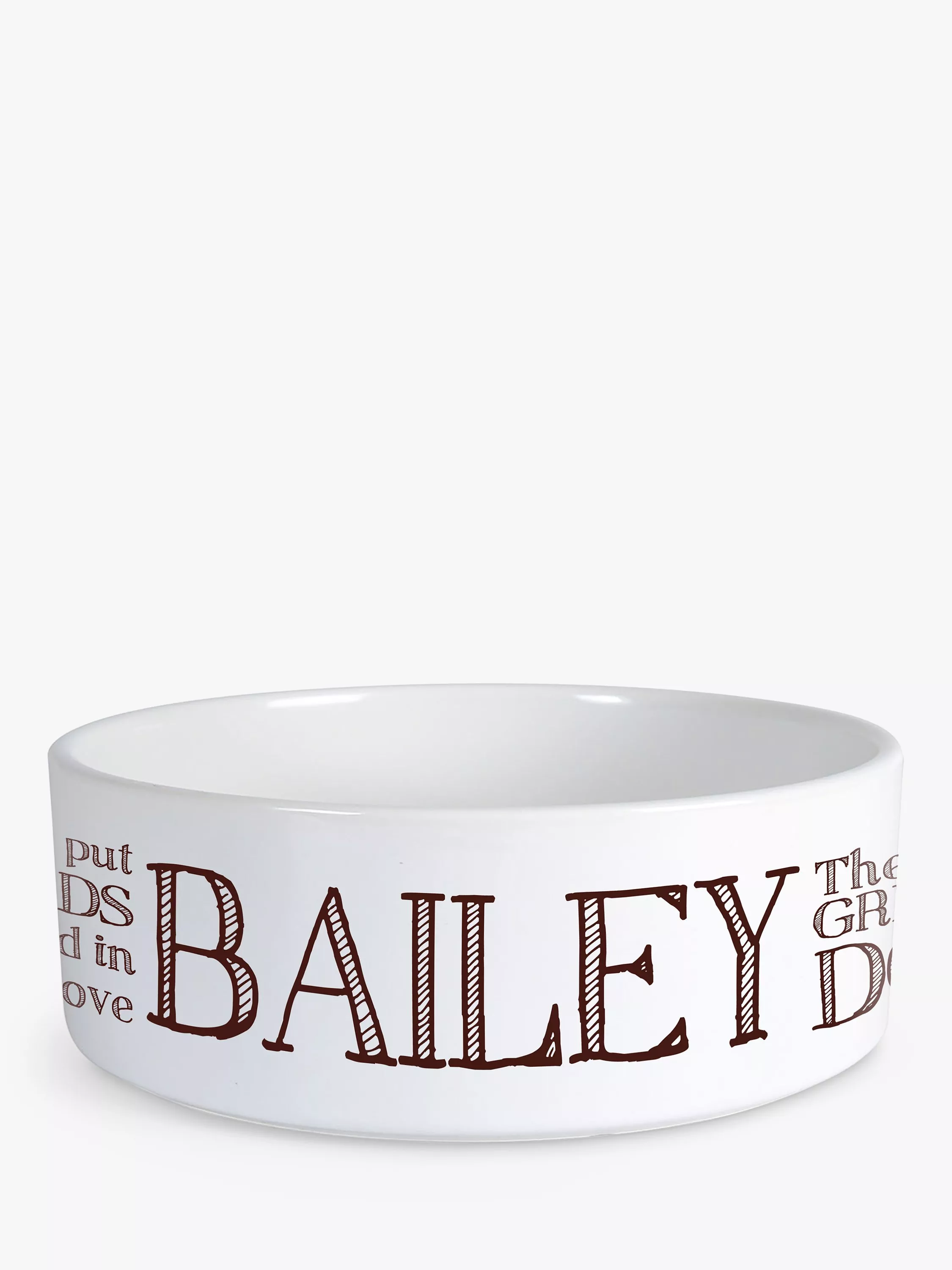 This ceramic dog bowl measures 19cm in diameter and is 7 cm high. It'll fit plenty of food or water inside, which will let you spoil your pooch rotten! The ceramic bowl comes personalised with "The Greedy Dog" as standard text, all you need to do is add their name to make it uniquely their bowl.