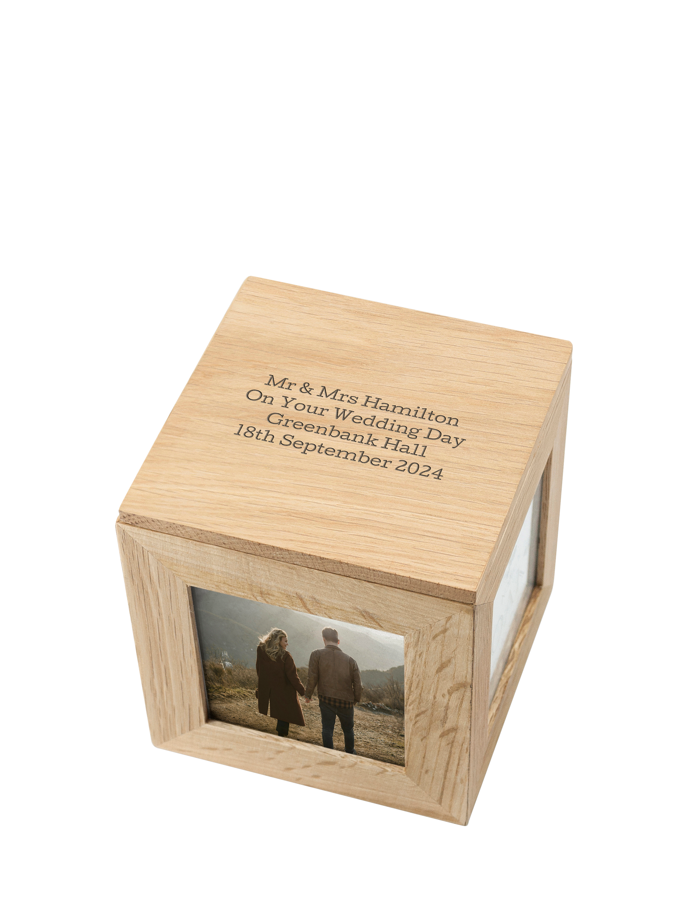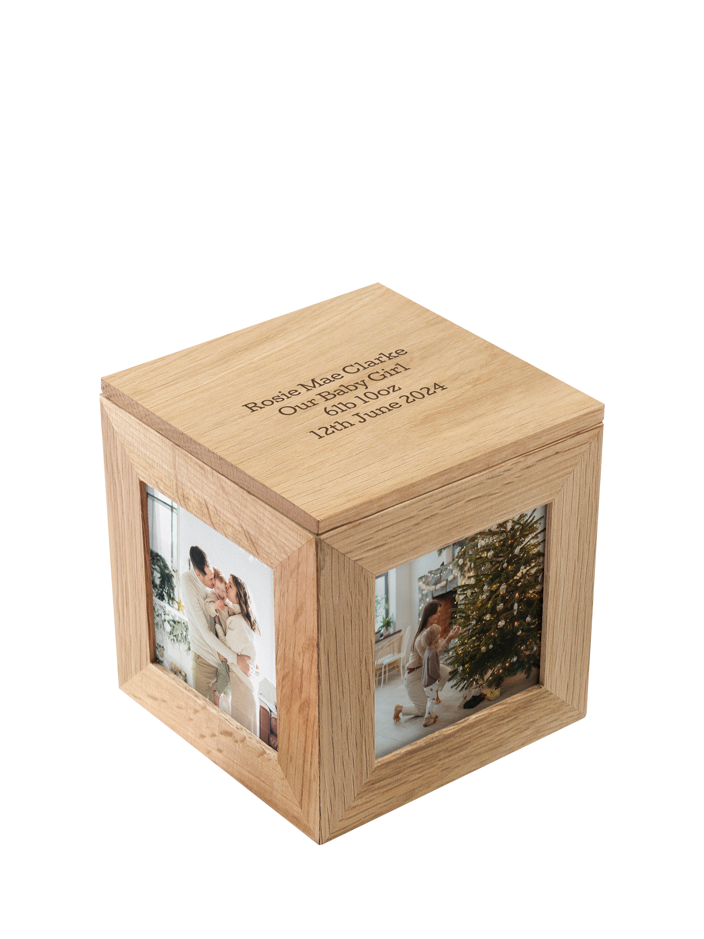 This little photo cube is a perfect gift for any memorable occasion! The cube is made with a sandy oak wood and offers space for 5 photos, one on each side of the cube plus the lid. The recommended photo size for the cube is 7 x 7 cm, or 3" x 3". On each side, there is a segment that comes away for easy access in filling the photos in. The cube can be personalised with a message above and below the lid's photo.